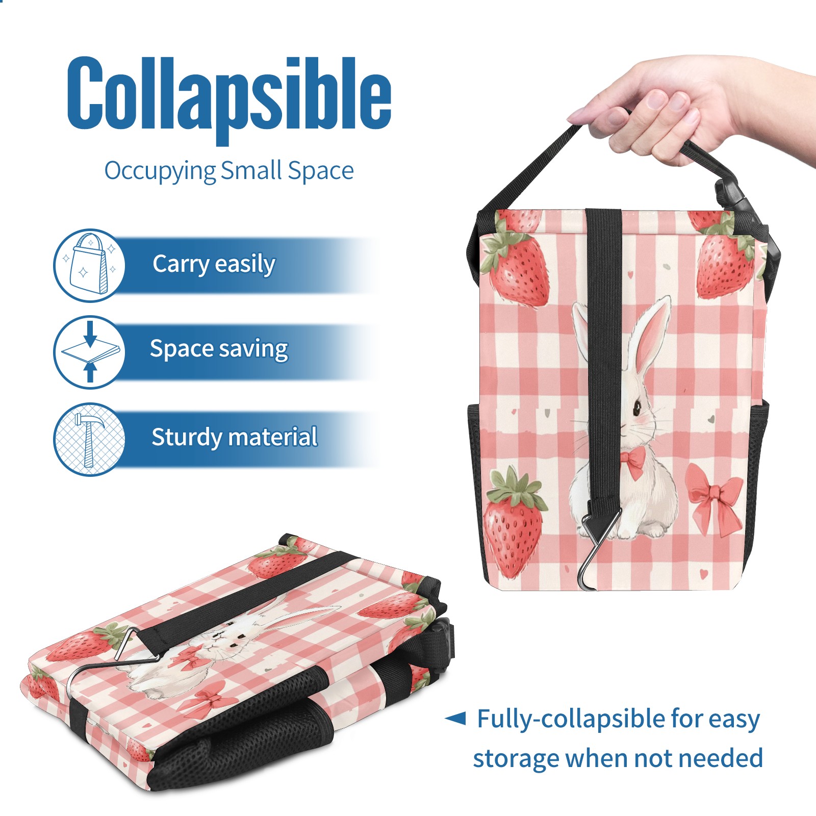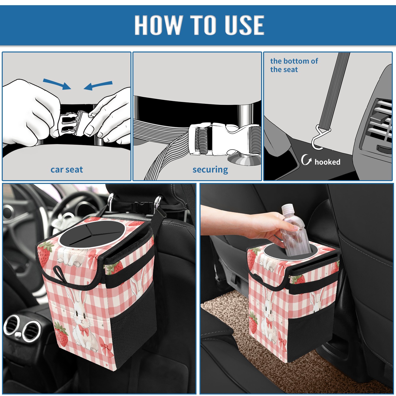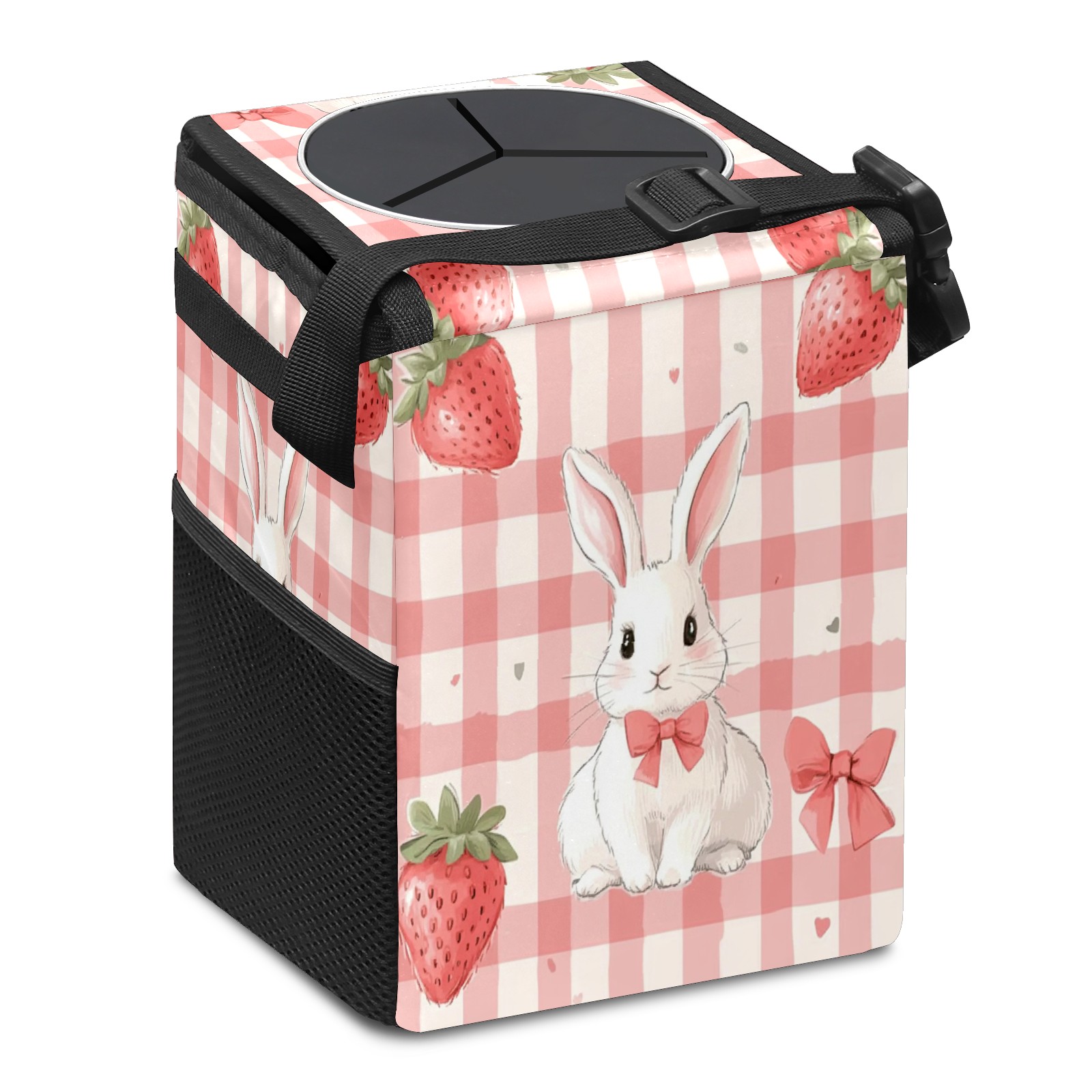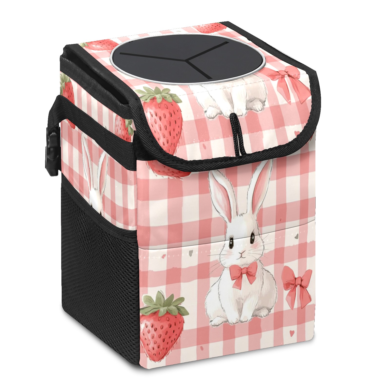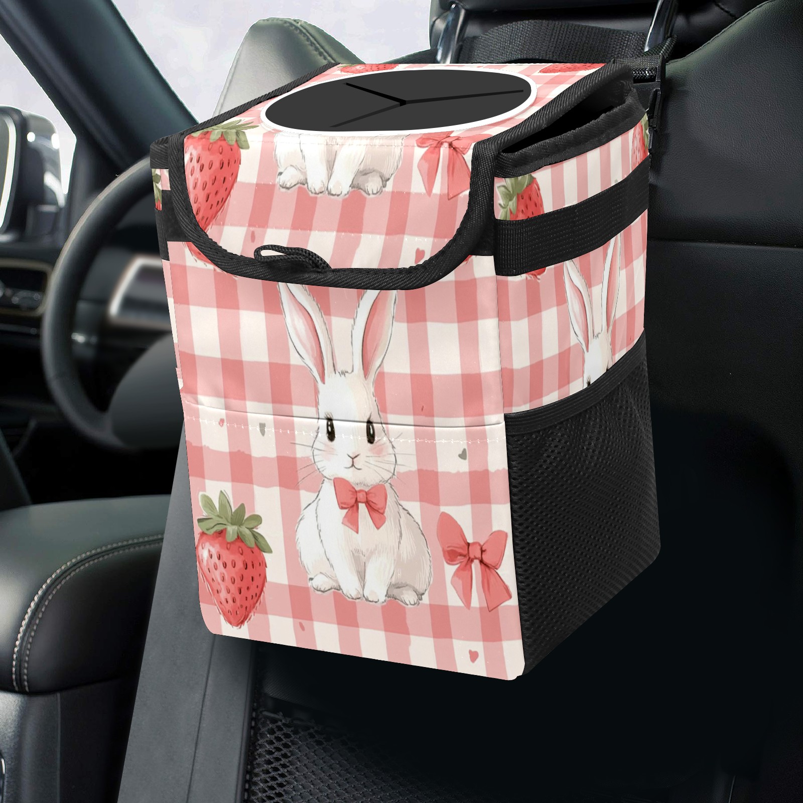 Car Trash Can with Lid, Small Portable Hanging Automotive Garbage Bin for Vehicles, Leakproof Waste Bag Container for SUV Truck Van Interior Auto Travel Road Trips(Pink Gingham With White Rabbit)