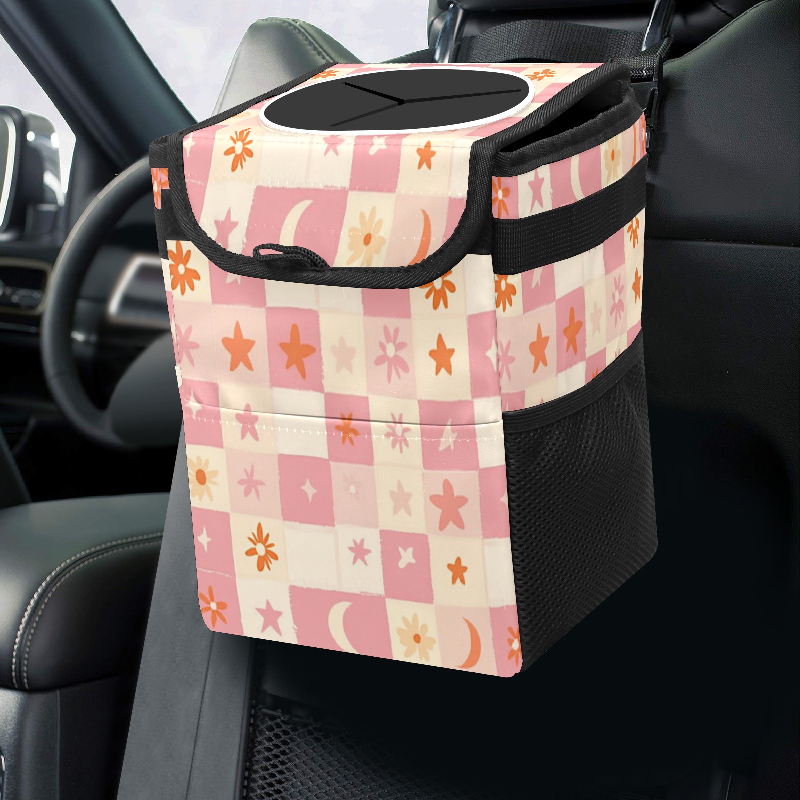 Car Trash Can with Lid, Small Portable Hanging Automotive Garbage Bin for Vehicles, Leakproof Waste Bag Container for SUV Truck Van Interior Auto Travel Road Trips(Pink And Peach Pastel Checkered)