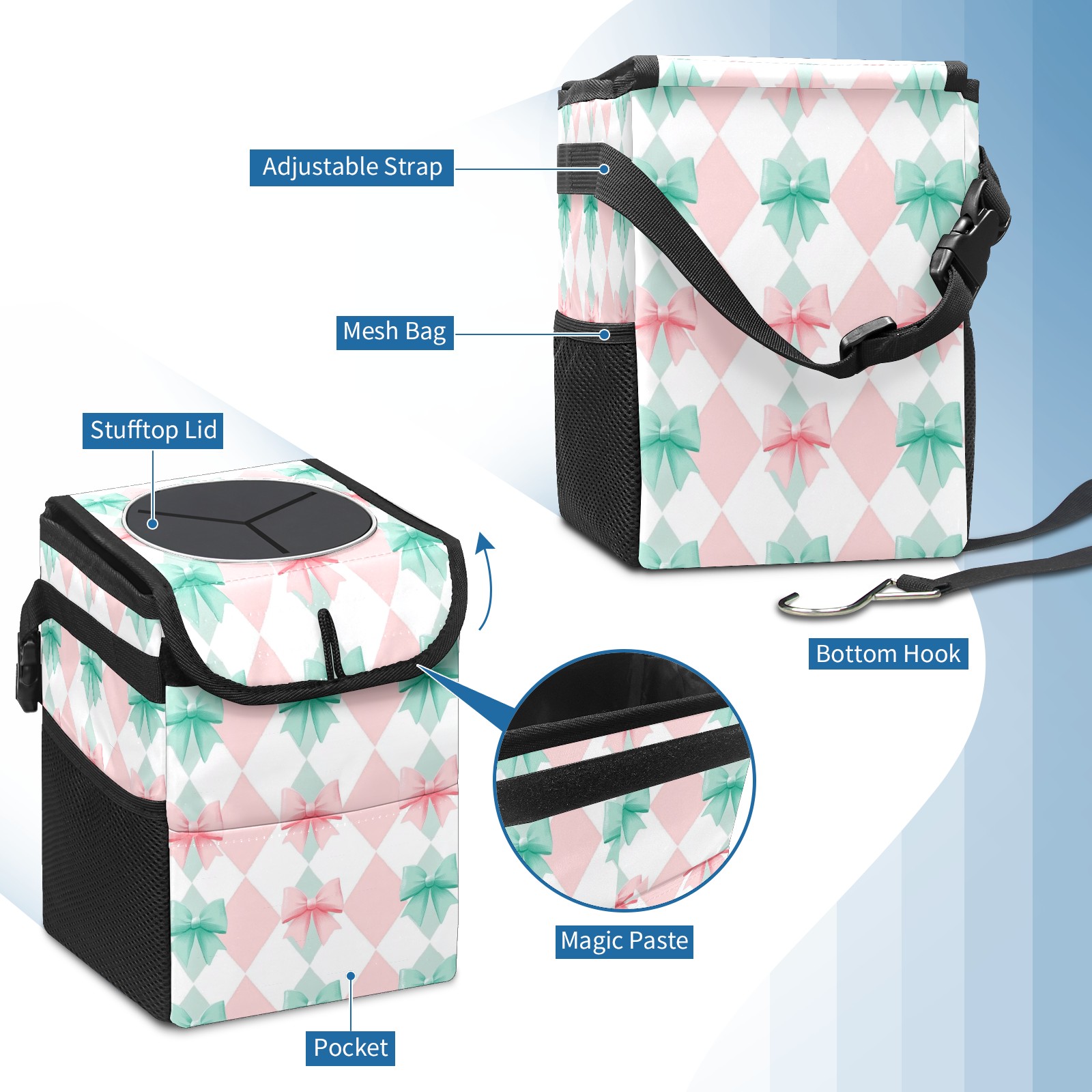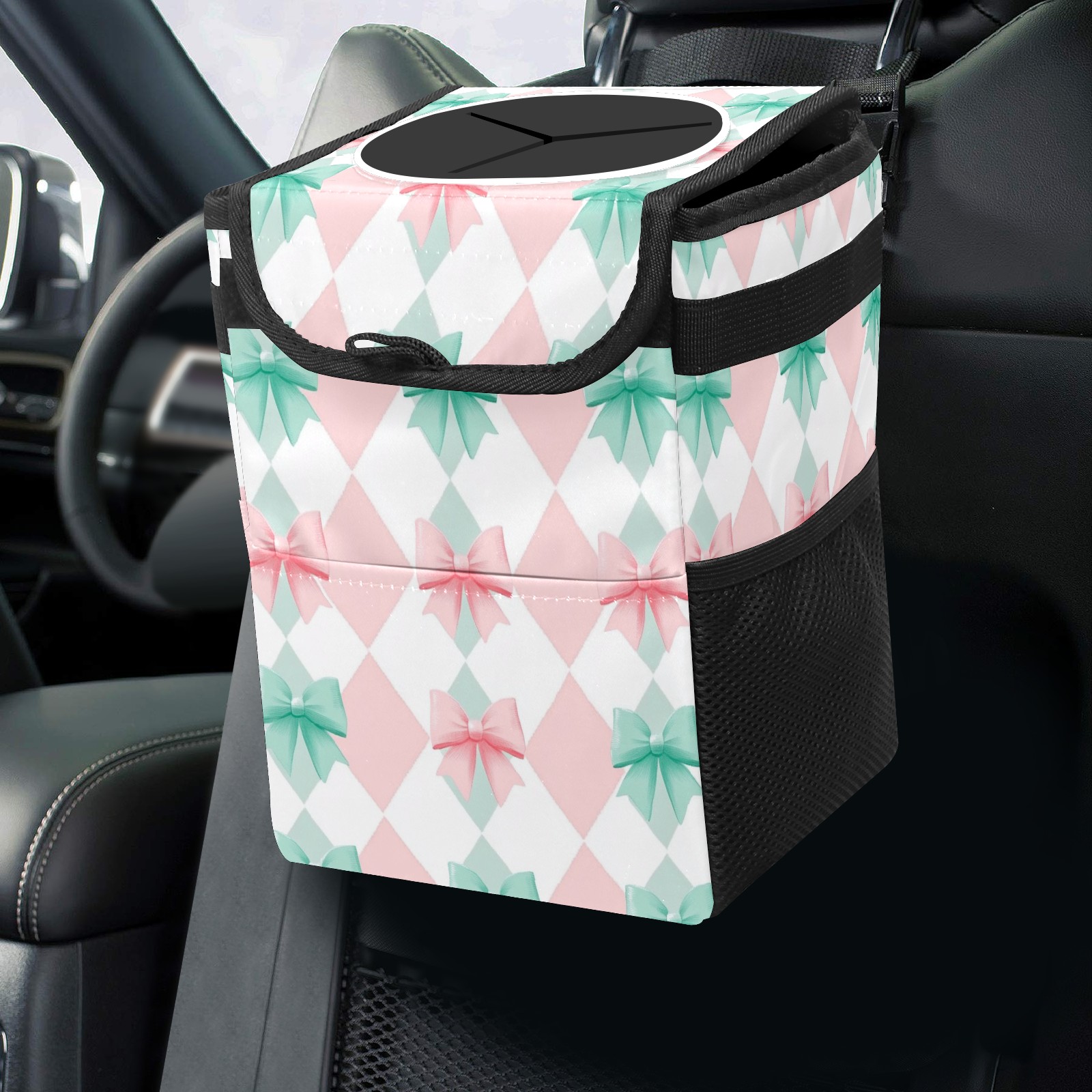 Car Trash Can with Lid, Small Portable Hanging Automotive Garbage Bin for Vehicles, Leakproof Waste Bag Container for SUV Truck Van Interior Auto Travel Road Trips(Pink And Mint Gingham)