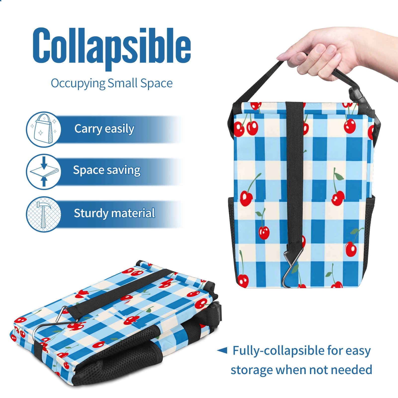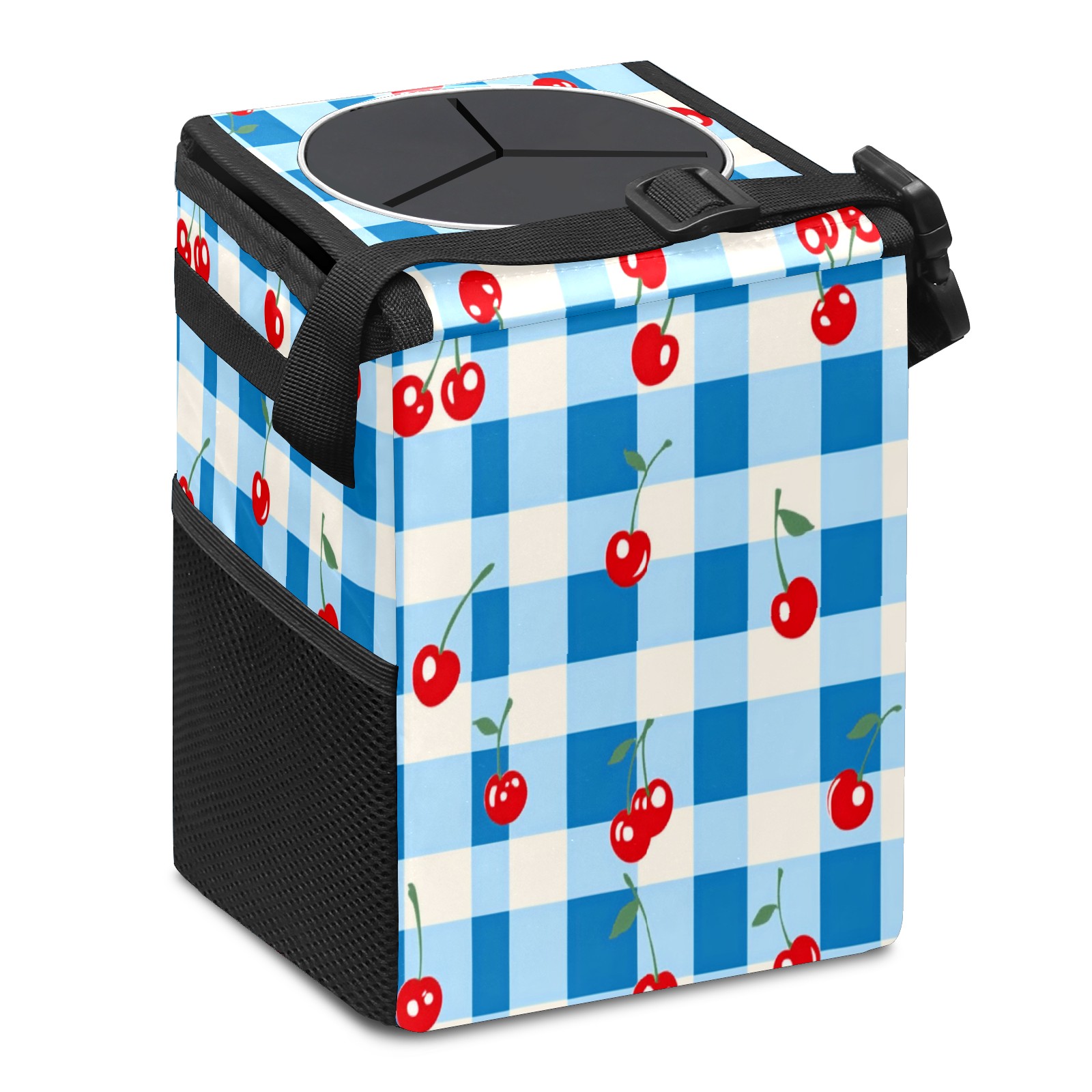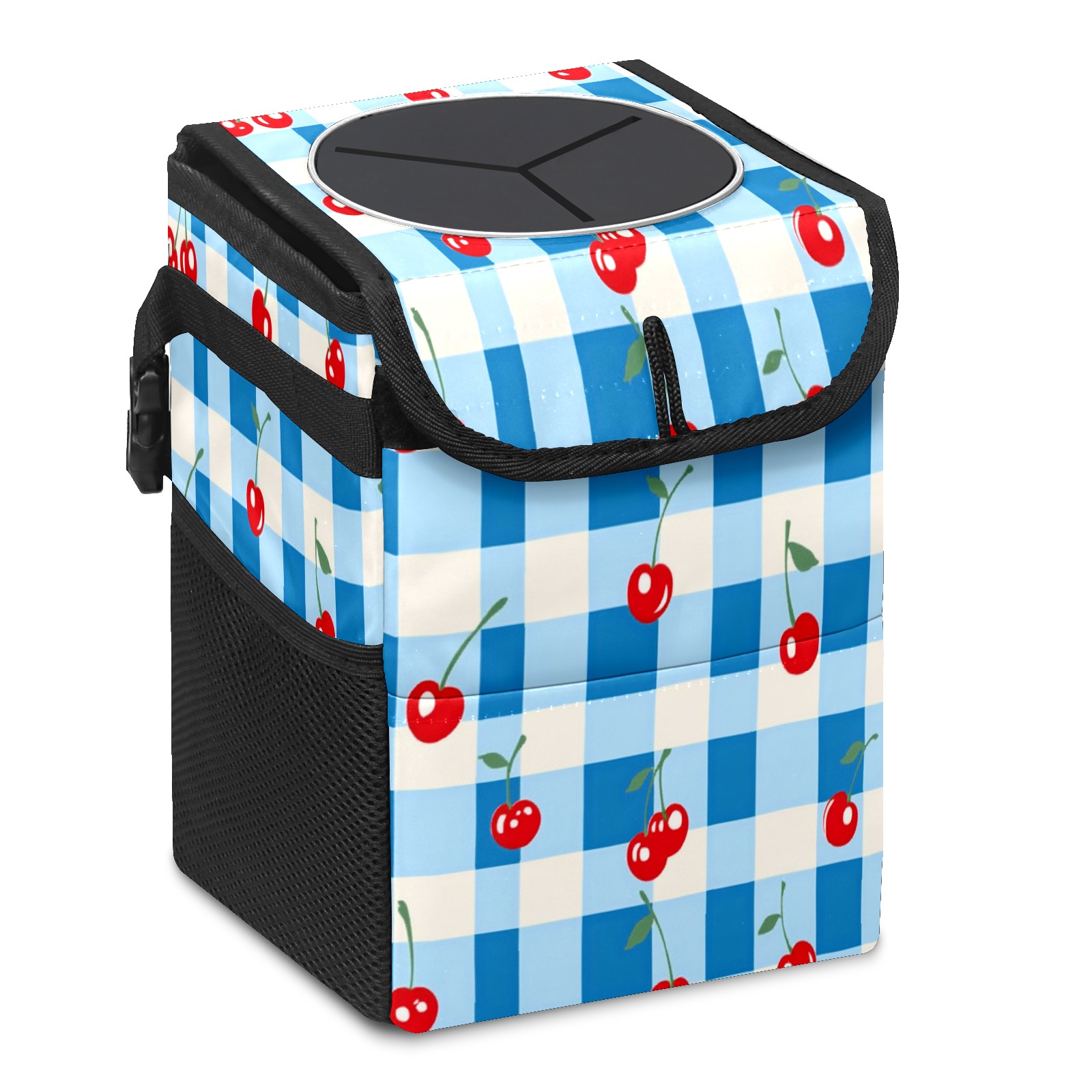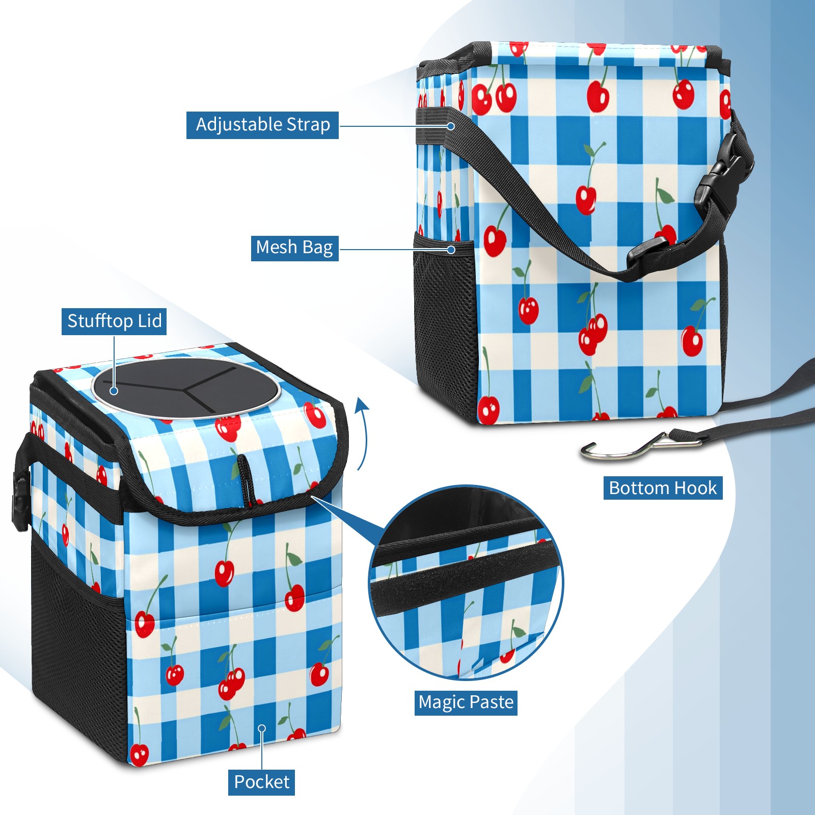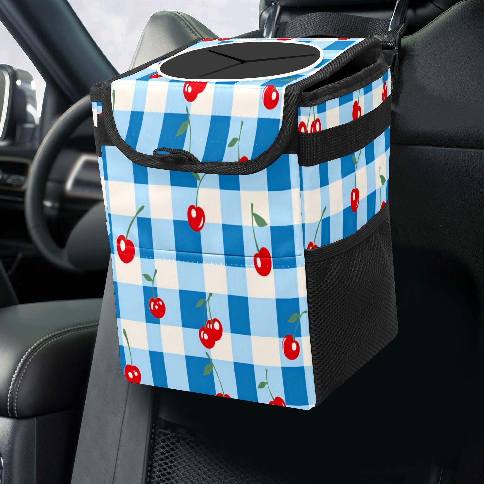 Car Trash Can with Lid, Small Portable Hanging Automotive Garbage Bin for Vehicles, Leakproof Waste Bag Container for SUV Truck Van Interior Auto Travel Road Trips(Blue White Gingham)