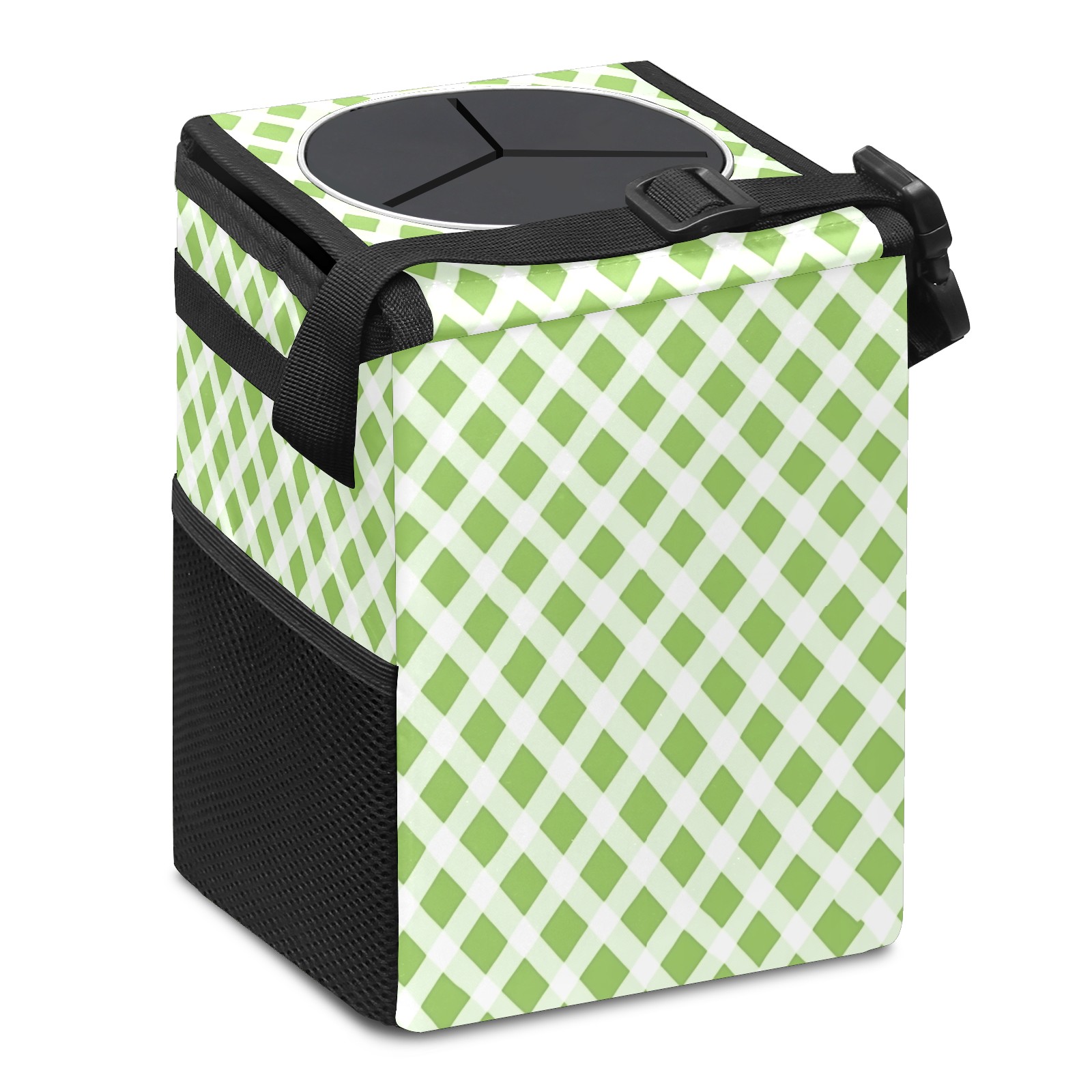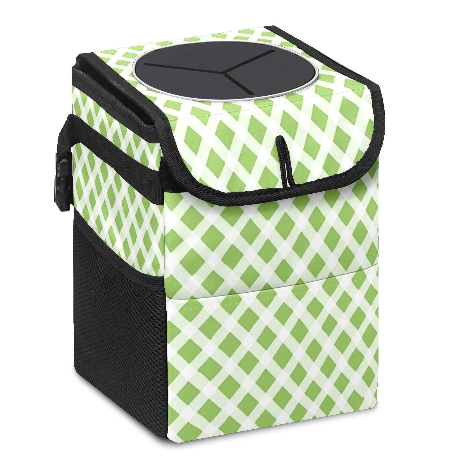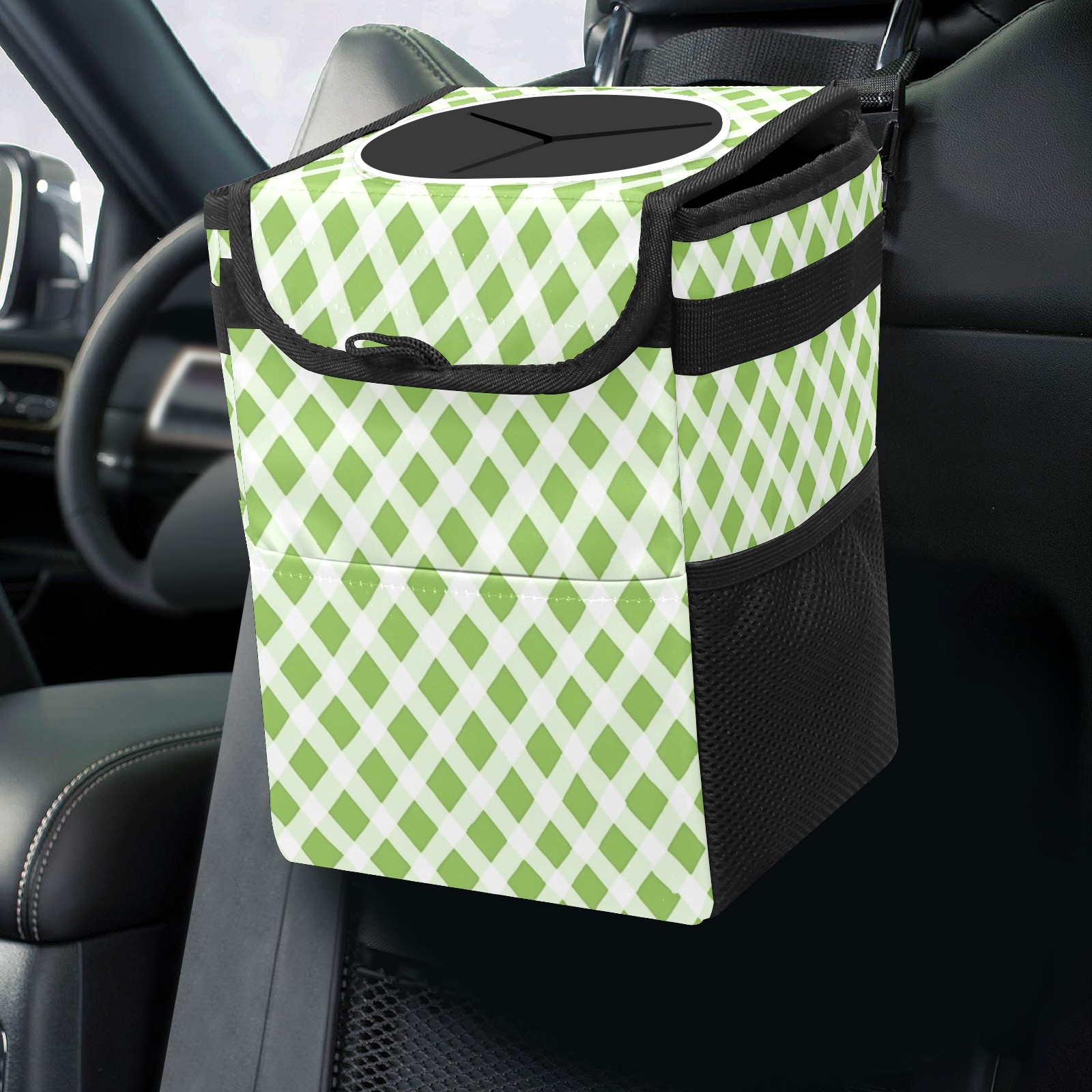 Car Trash Can with Lid, Small Portable Hanging Automotive Garbage Bin for Vehicles, Leakproof Waste Bag Container for SUV Truck Van Interior Auto Travel Road Trips(Light Green And White Gingham)
