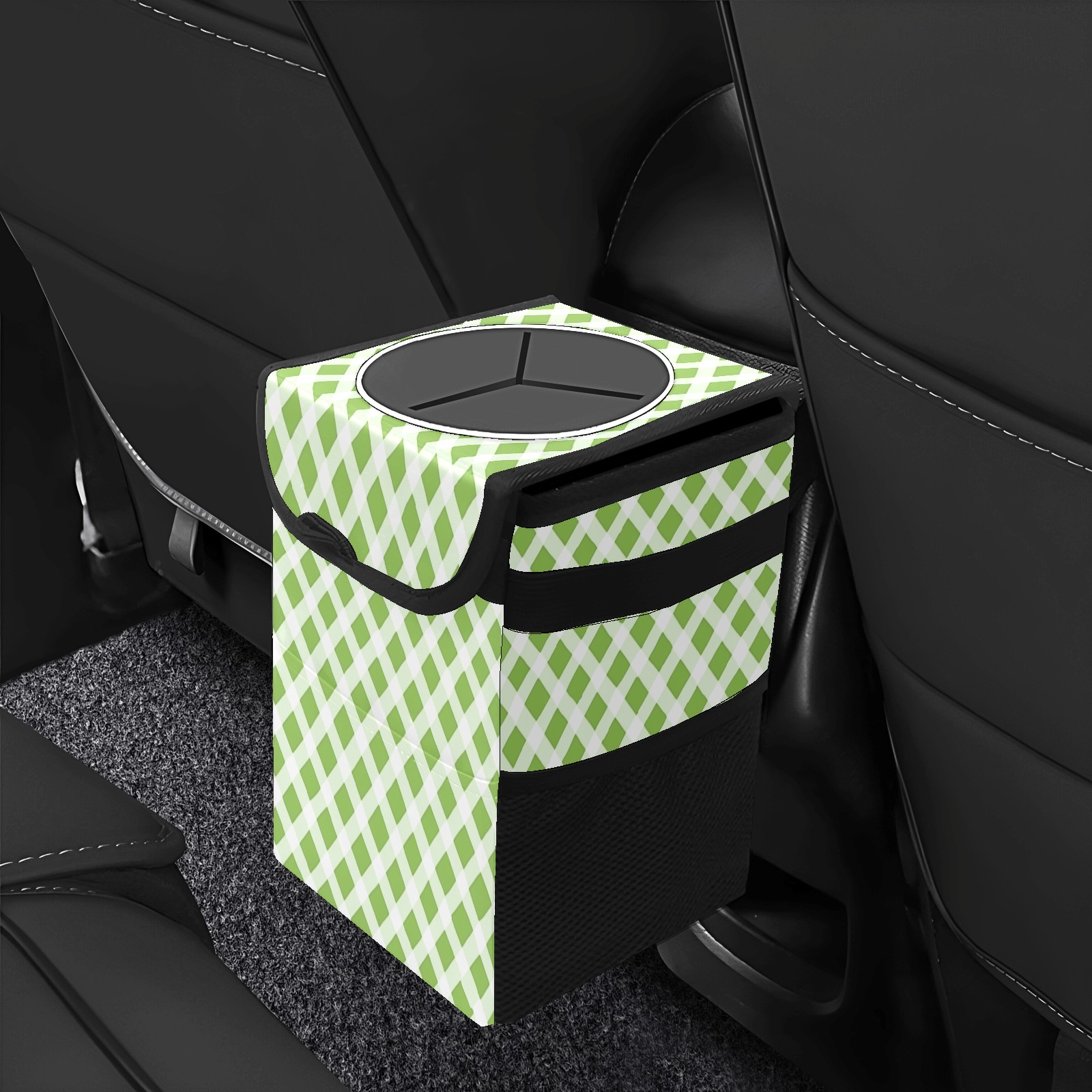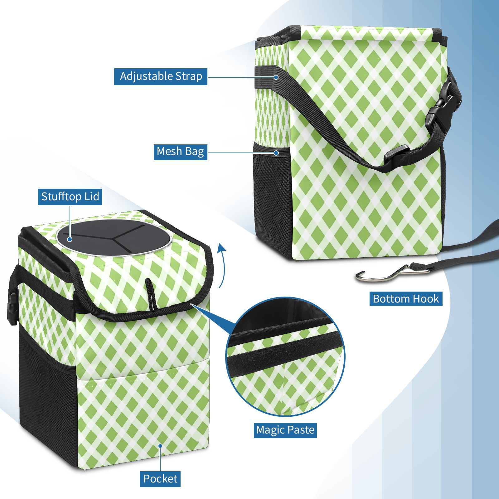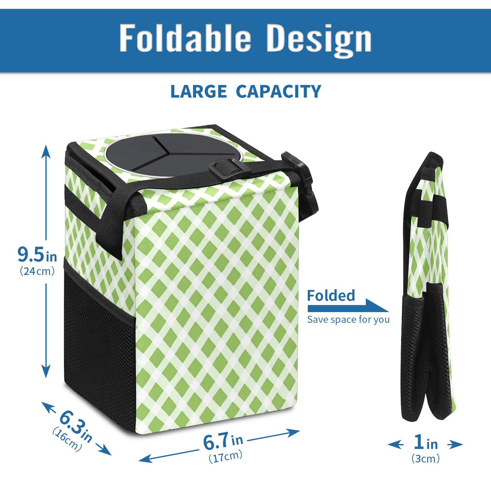 Car Trash Can with Lid, Small Portable Hanging Automotive Garbage Bin for Vehicles, Leakproof Waste Bag Container for SUV Truck Van Interior Auto Travel Road Trips(Light Green And White Gingham)