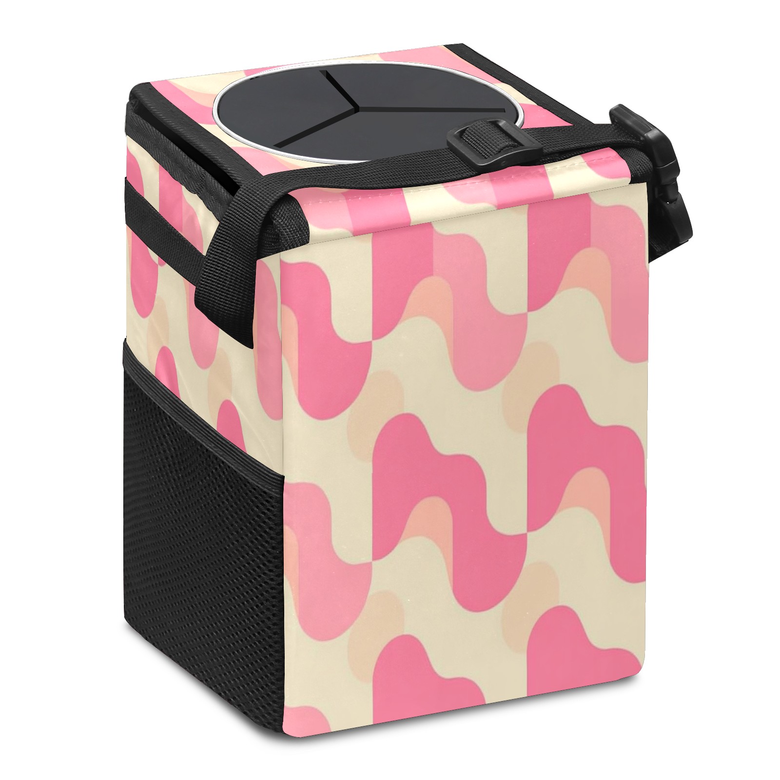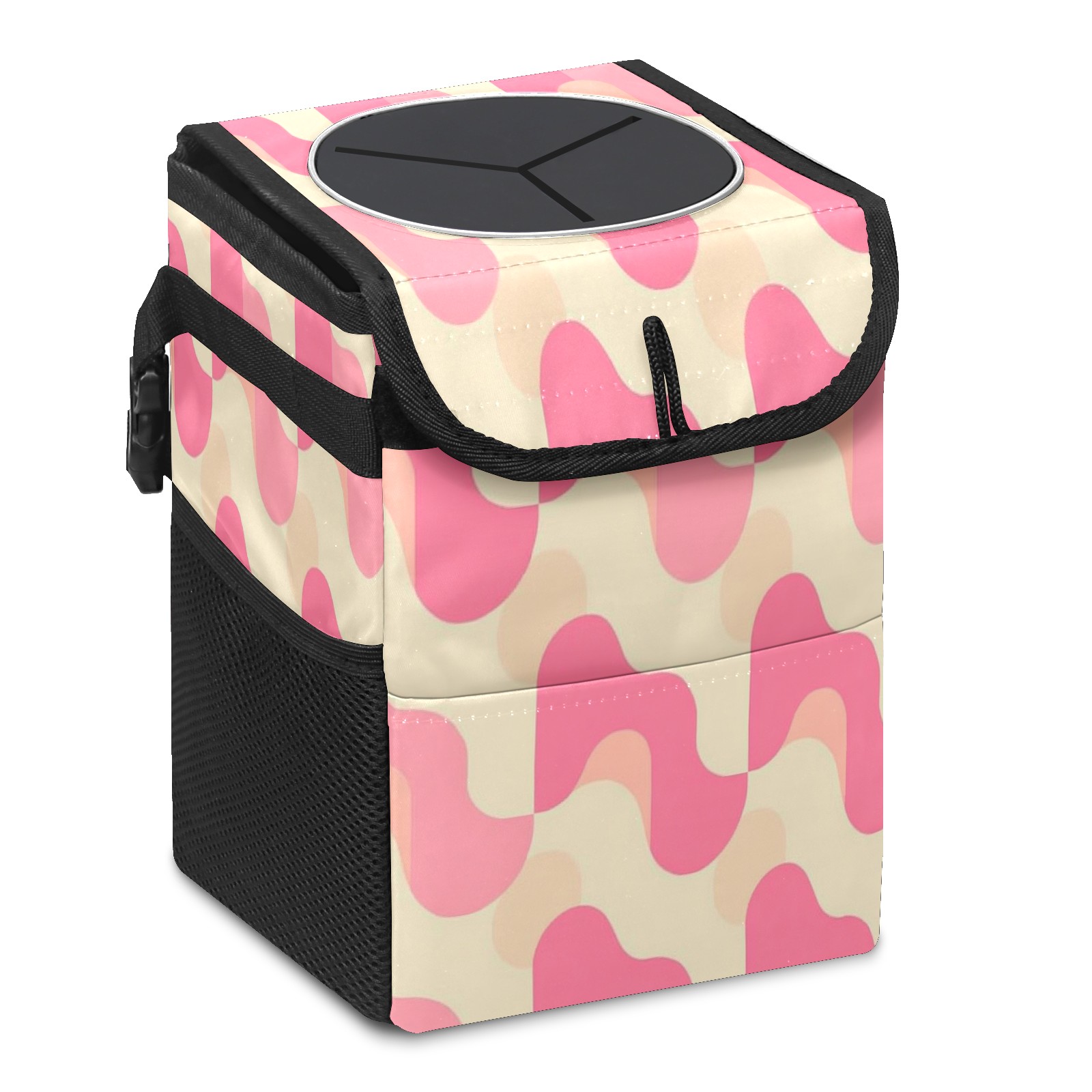 Car Trash Can with Lid, Small Portable Hanging Automotive Garbage Bin for Vehicles, Leakproof Waste Bag Container for SUV Truck Van Interior Auto Travel Road Trips(Pink And Cream Retro Groovy)