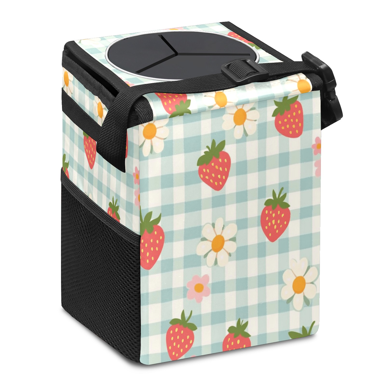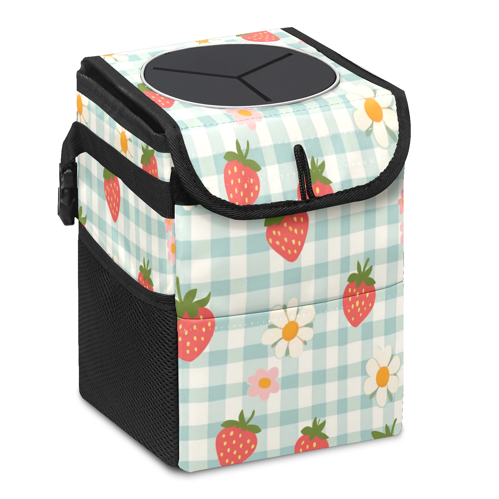 Car Trash Can with Lid, Small Portable Hanging Automotive Garbage Bin for Vehicles, Leakproof Waste Bag Container for SUV Truck Van Interior Auto Travel Road Trips(Strawberries And Daisies)