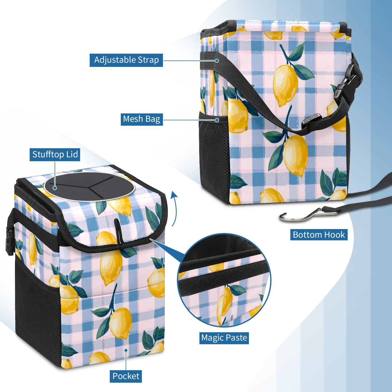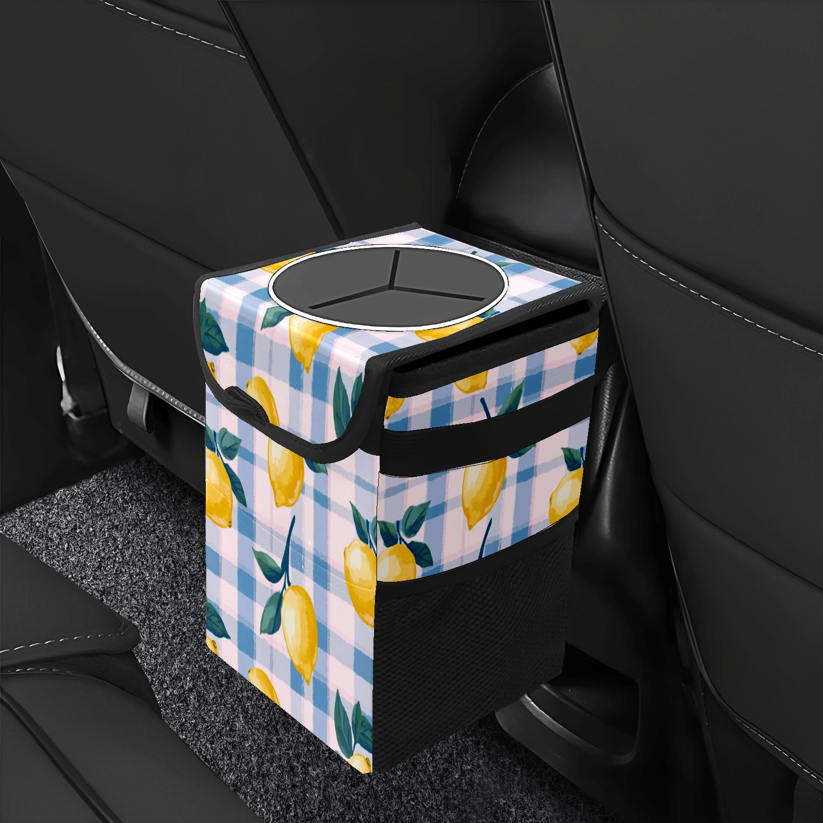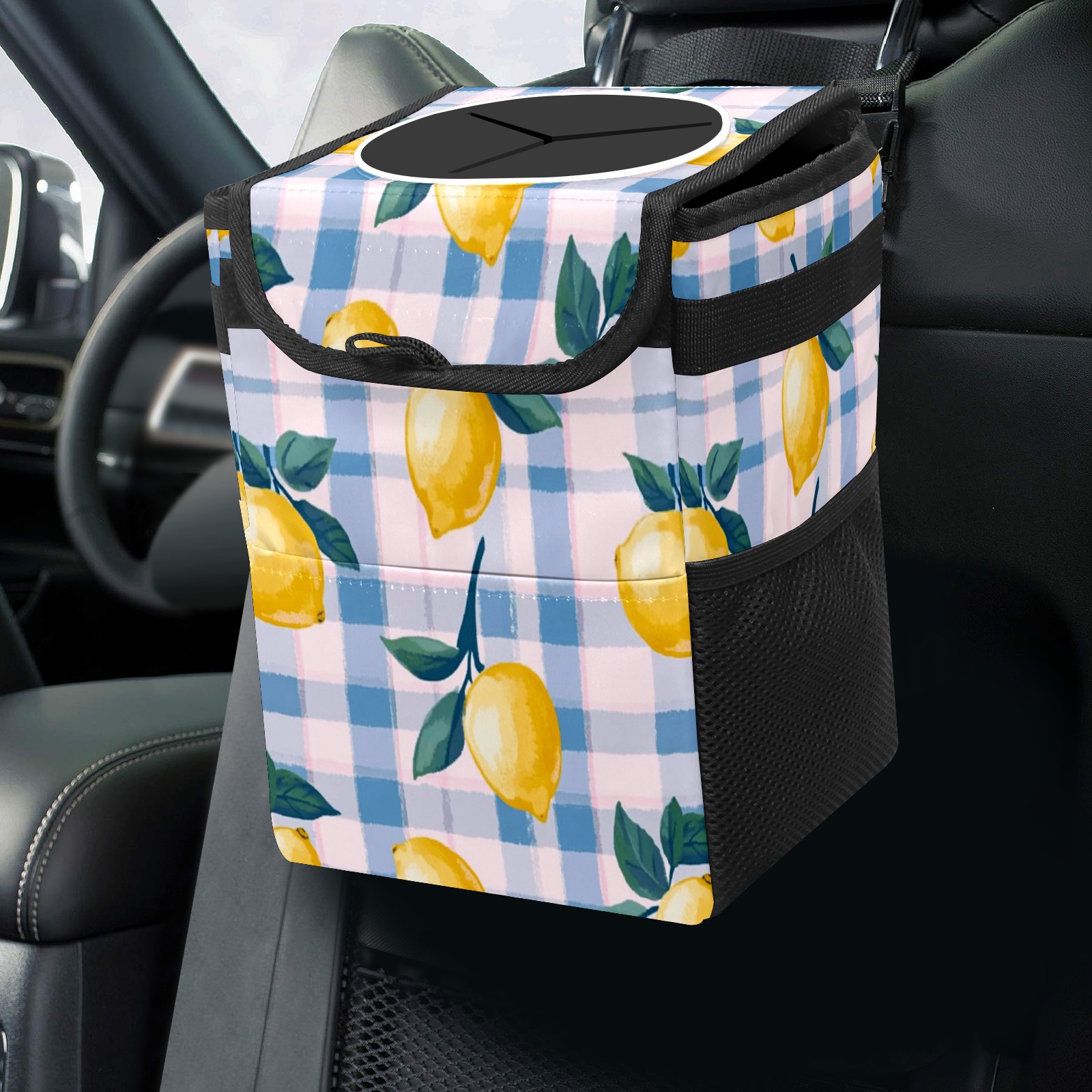 Car Trash Can with Lid, Small Portable Hanging Automotive Garbage Bin for Vehicles, Leakproof Waste Bag Container for SUV Truck Van Interior Auto Travel Road Trips(Lemons)