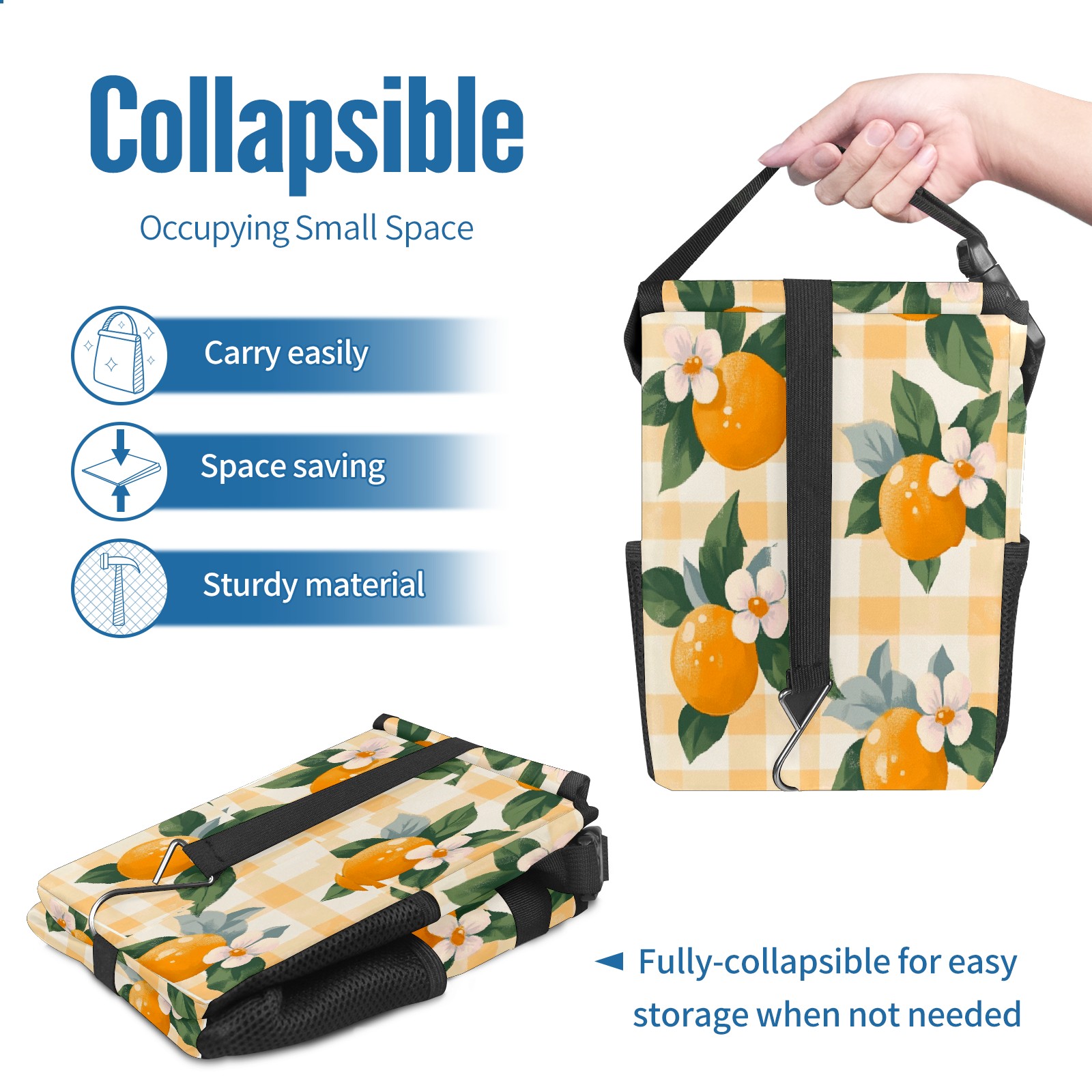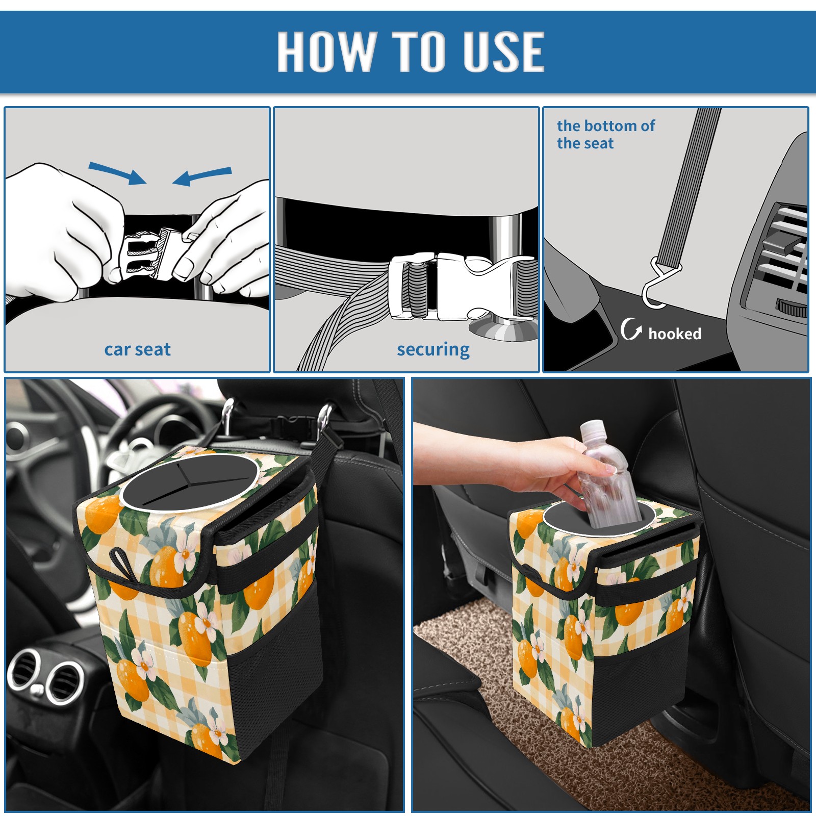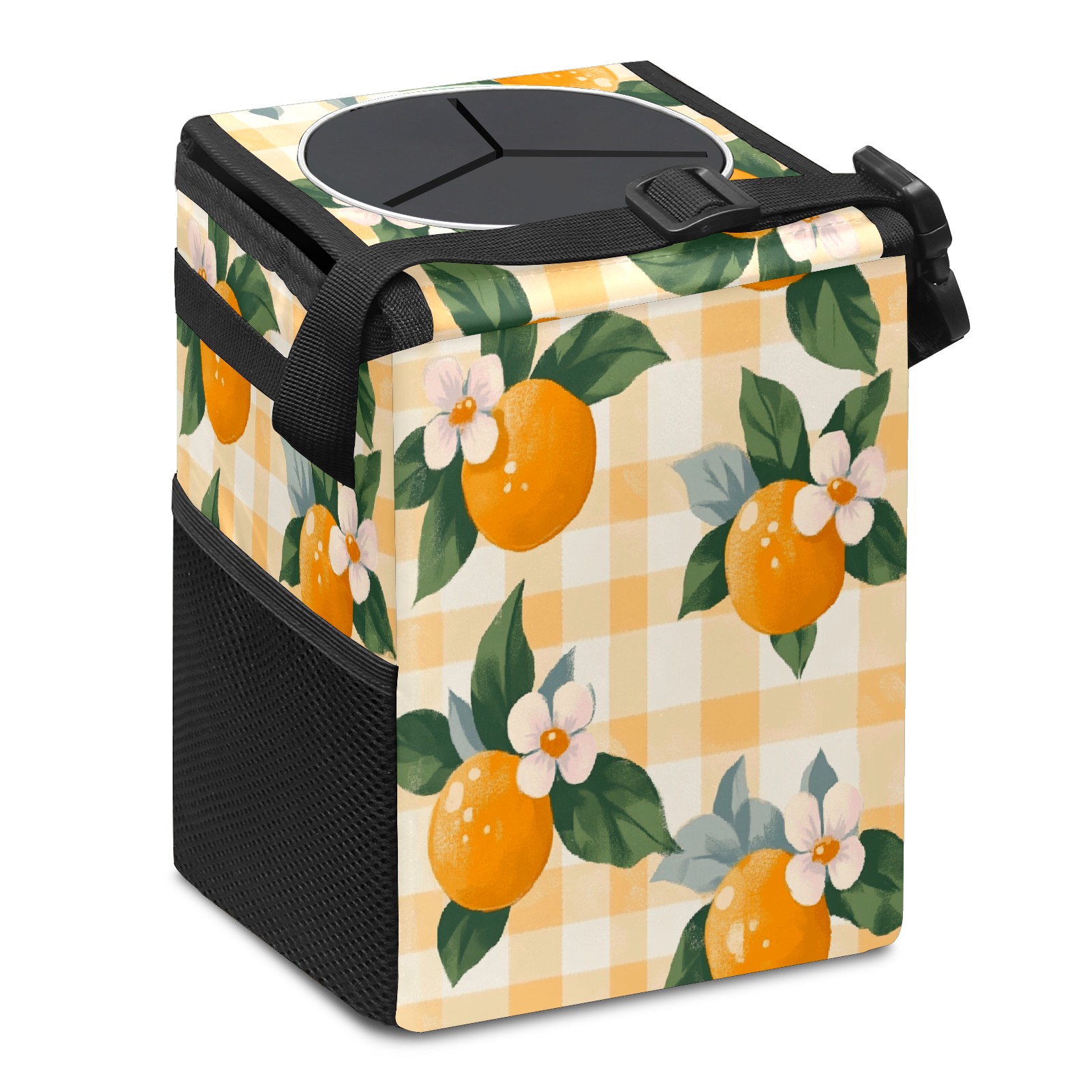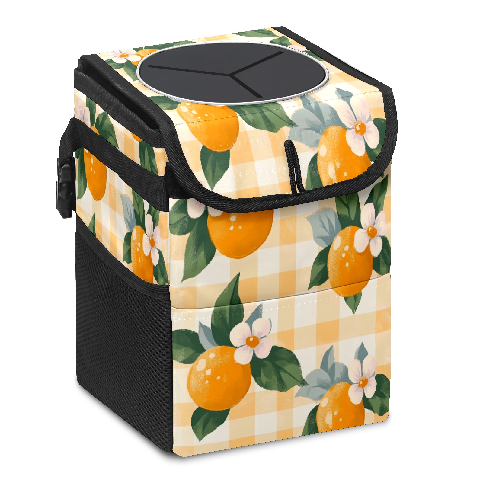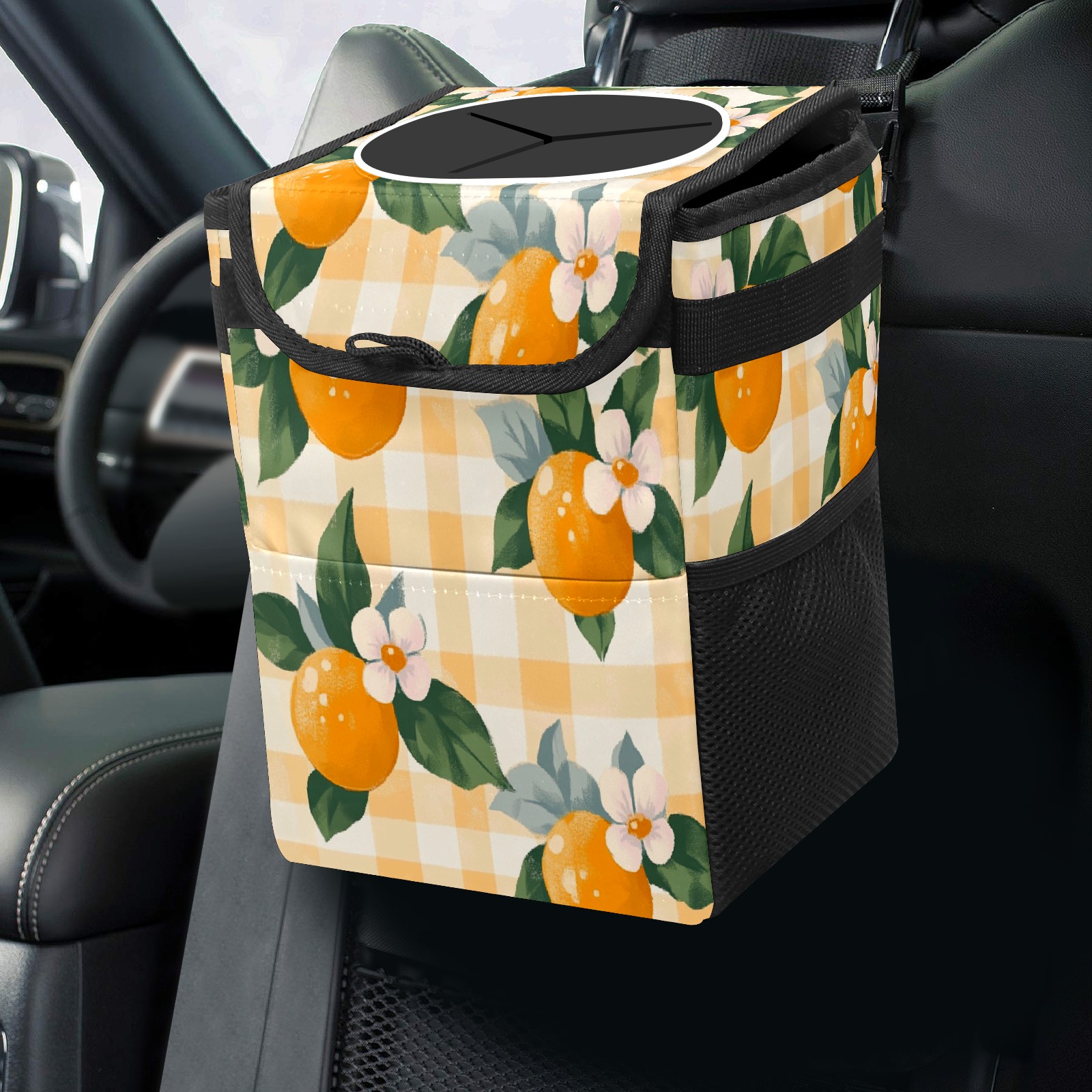 Car Trash Can with Lid, Small Portable Hanging Automotive Garbage Bin for Vehicles, Leakproof Waste Bag Container for SUV Truck Van Interior Auto Travel Road Trips(Oranges And Flowers)