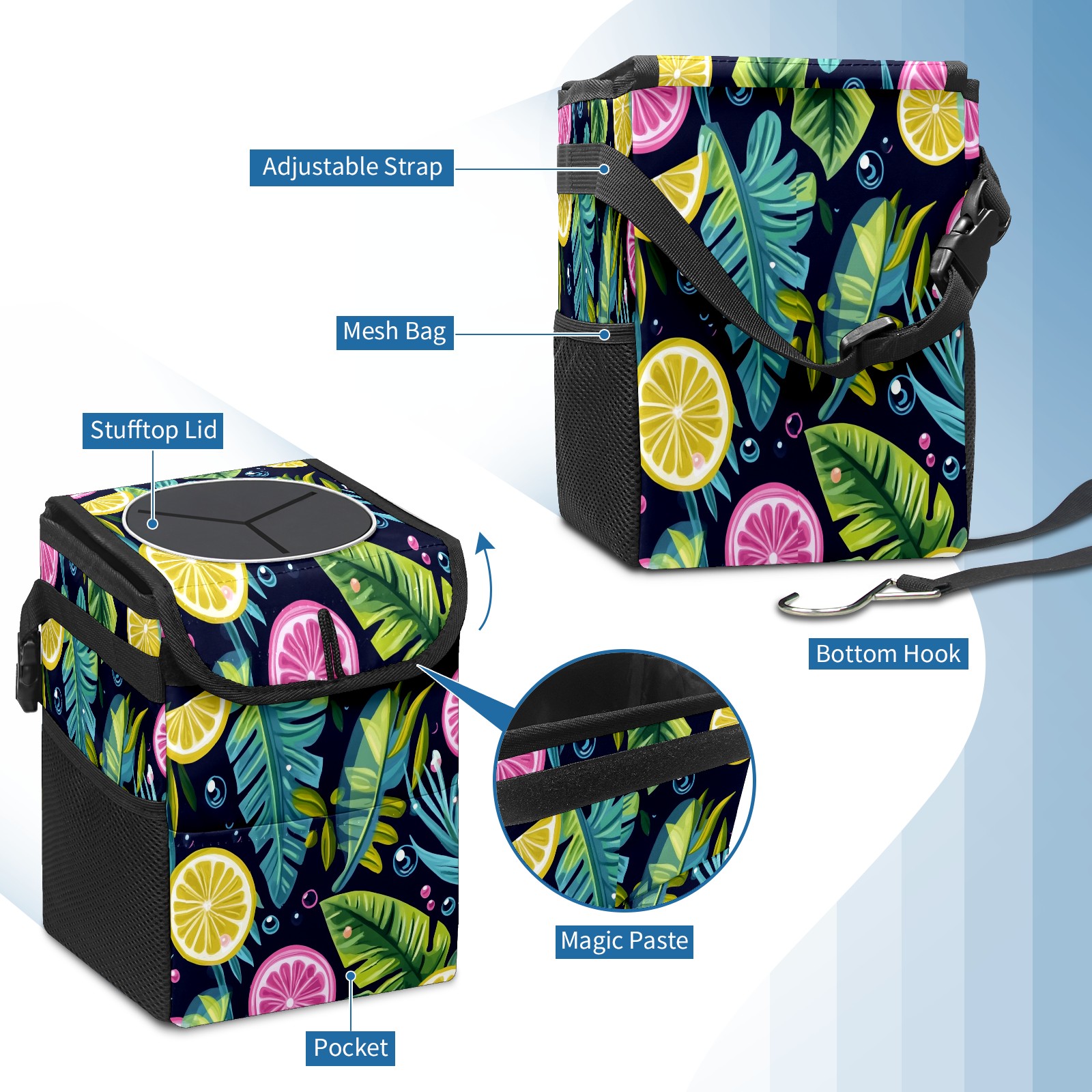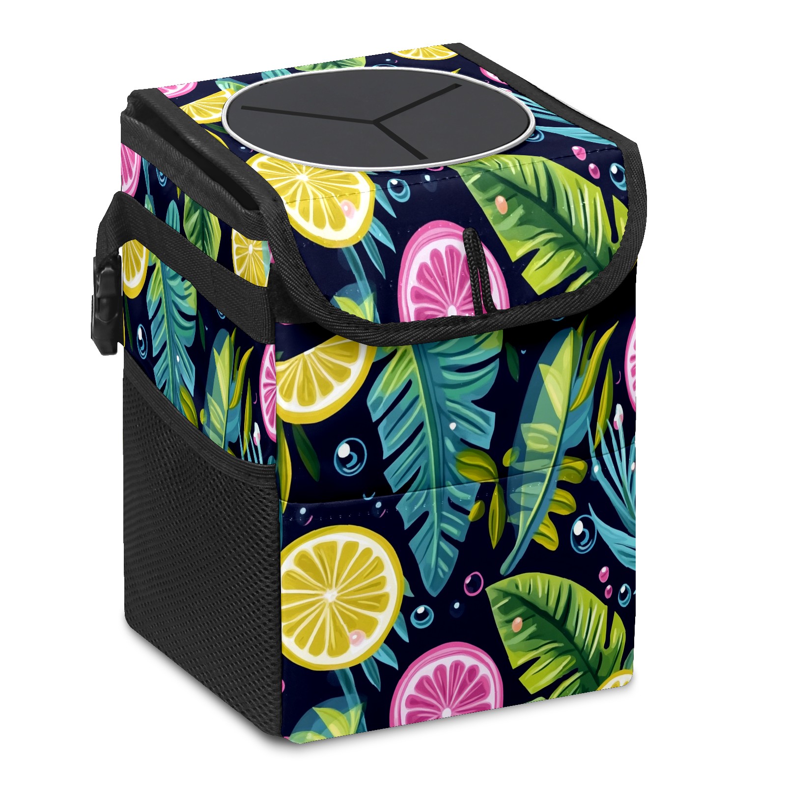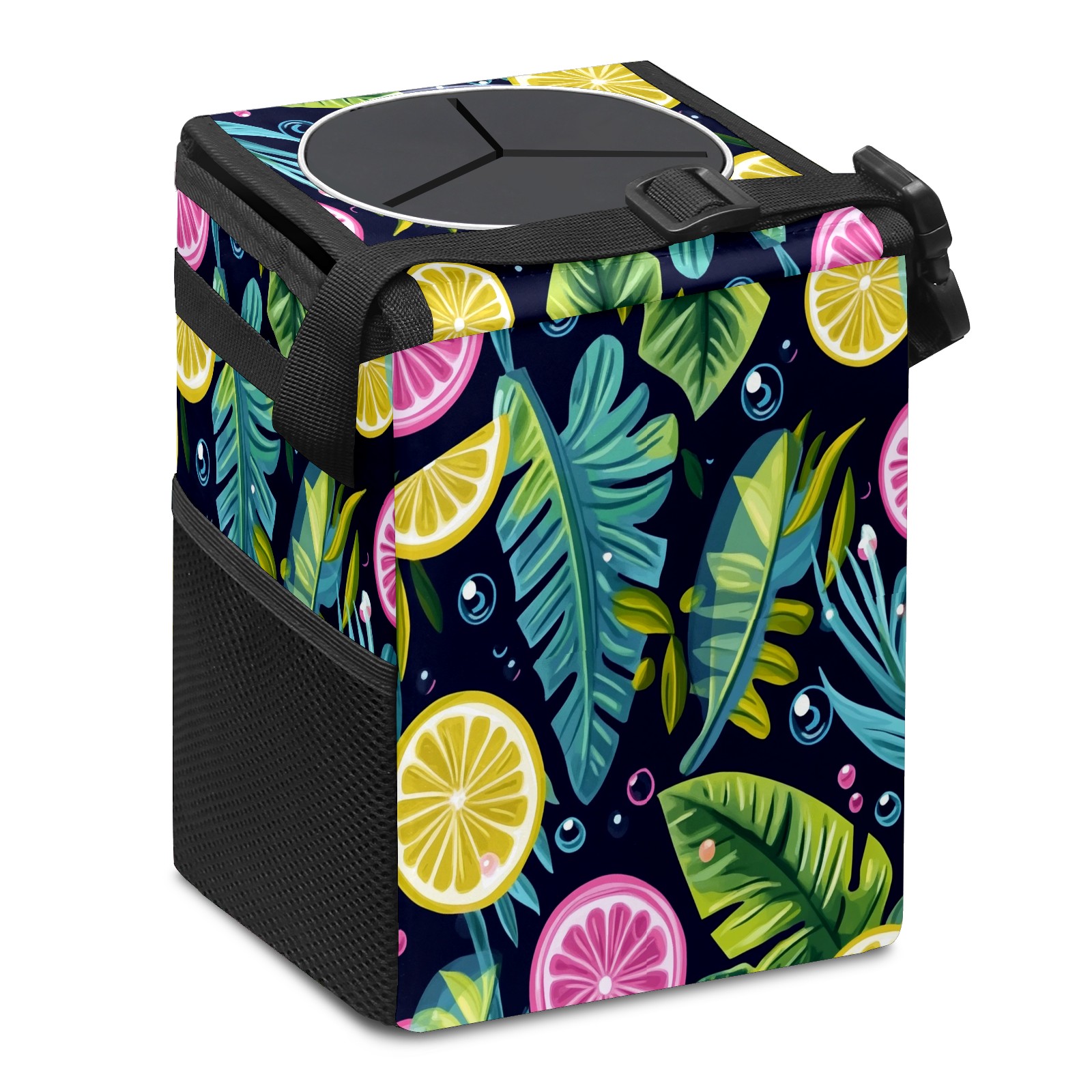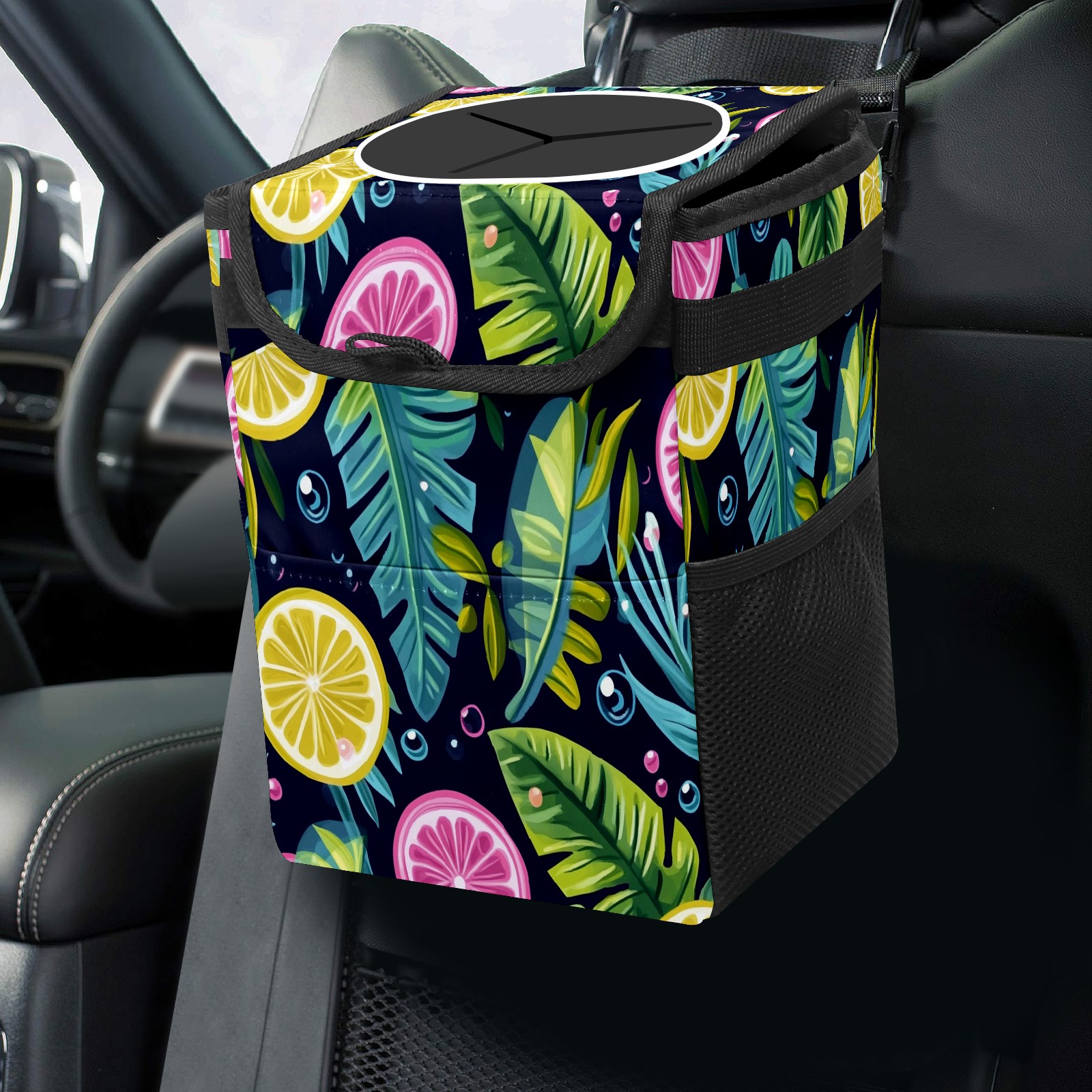Car Trash Can with Lid, Small Portable Hanging Automotive Garbage Bin for Vehicles, Leakproof Waste Bag Container for SUV Truck Van Interior Auto Travel Road Trips(Tropical Leaves Bubbles)