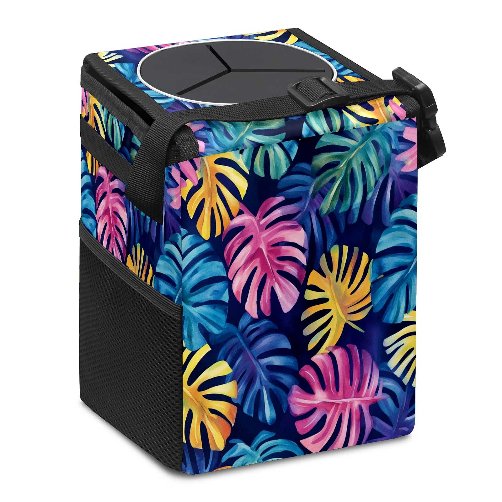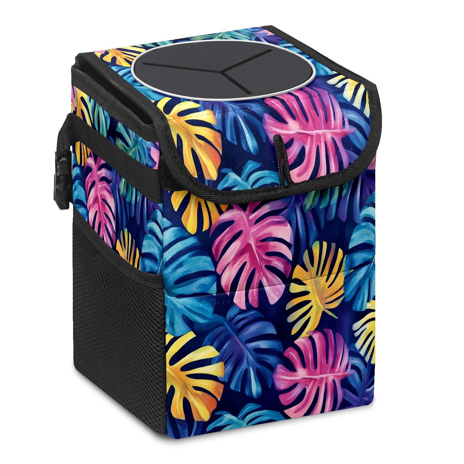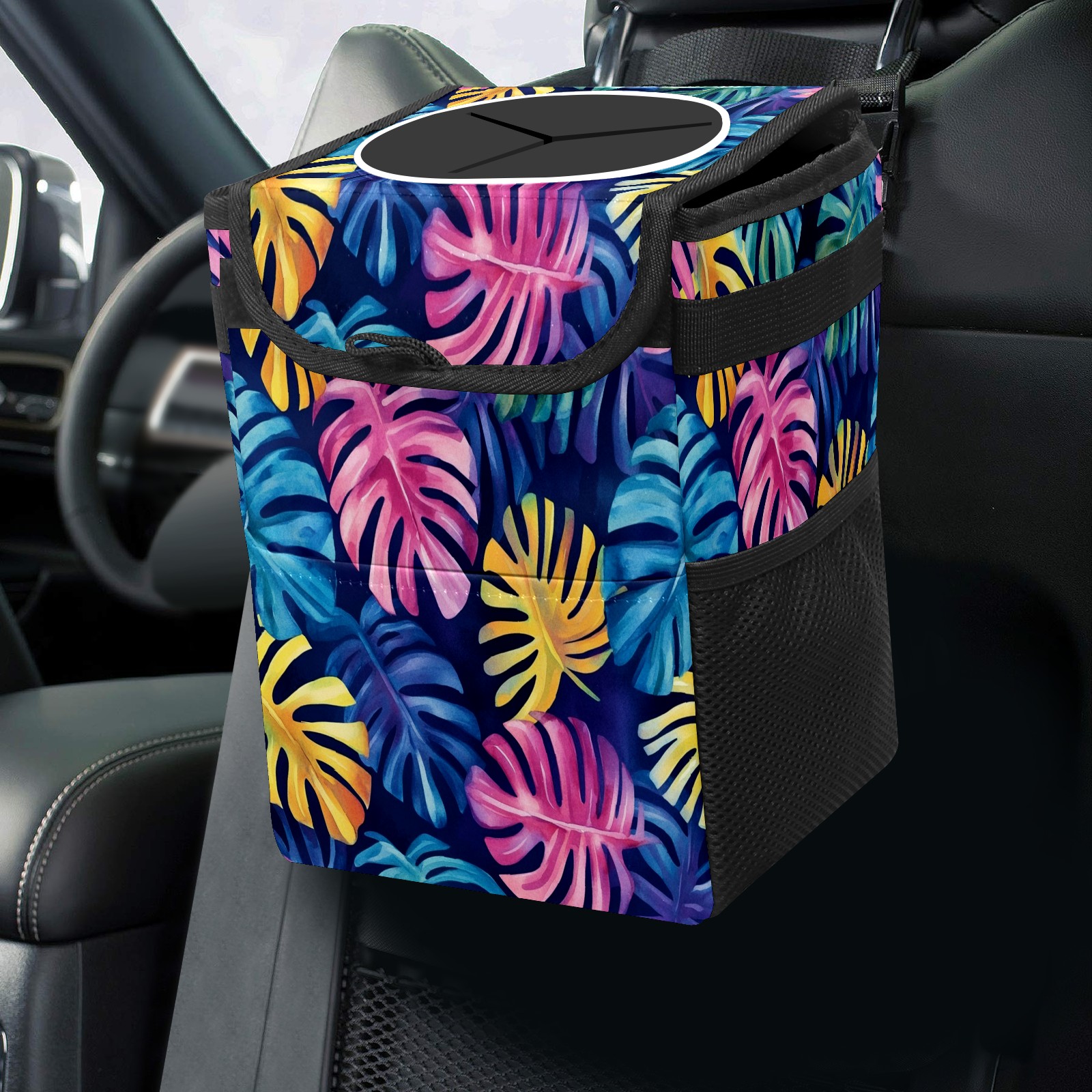 Car Trash Can with Lid, Small Portable Hanging Automotive Garbage Bin for Vehicles, Leakproof Waste Bag Container for SUV Truck Van Interior Auto Travel Road Trips(Watercolor Tropical Leaves)