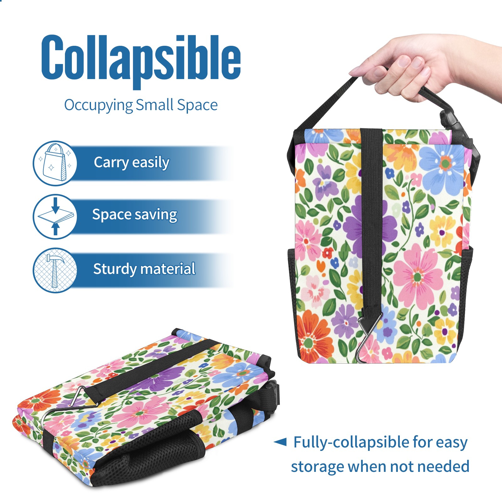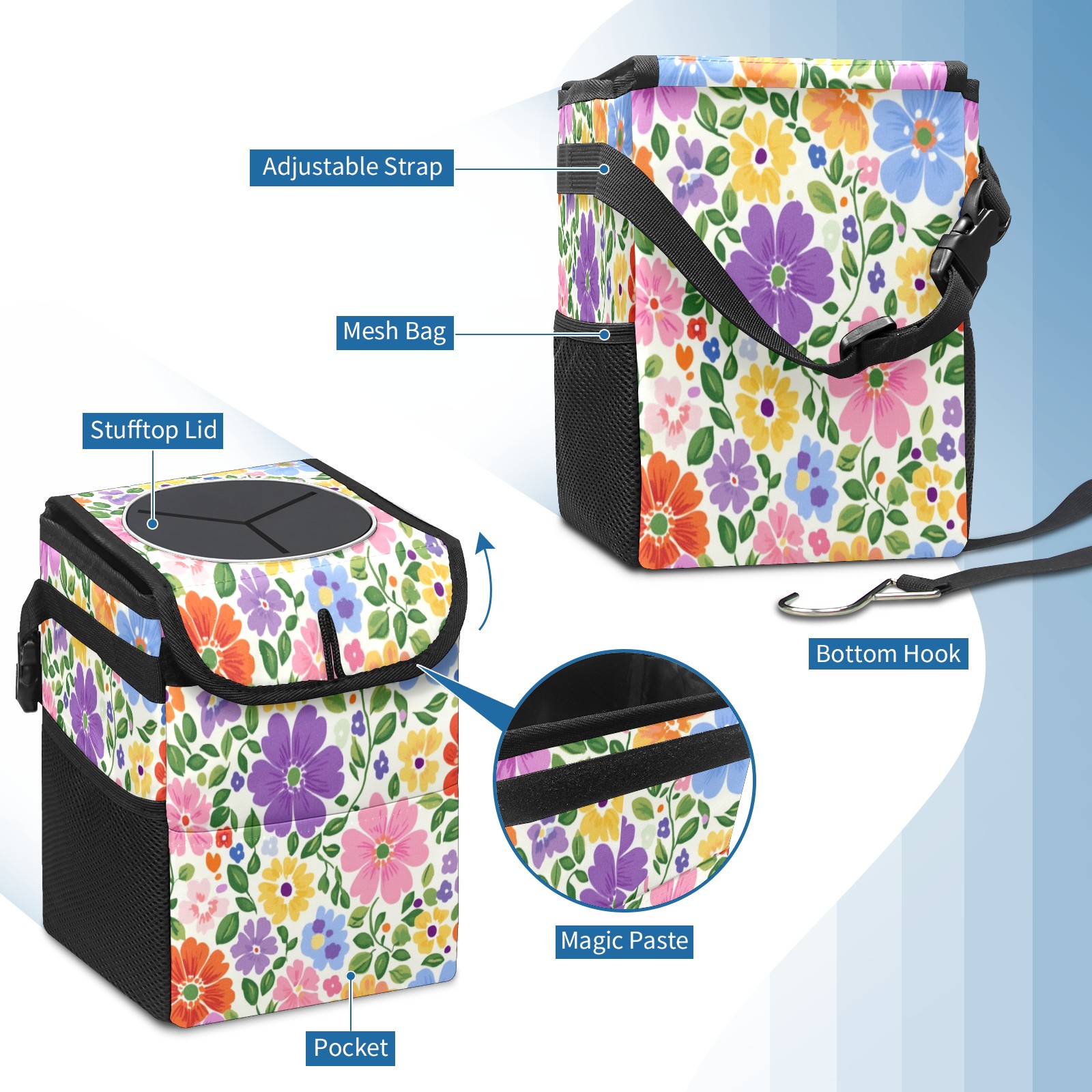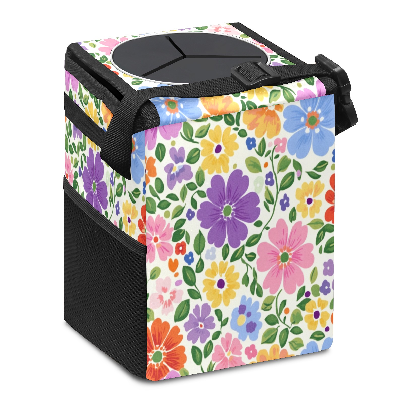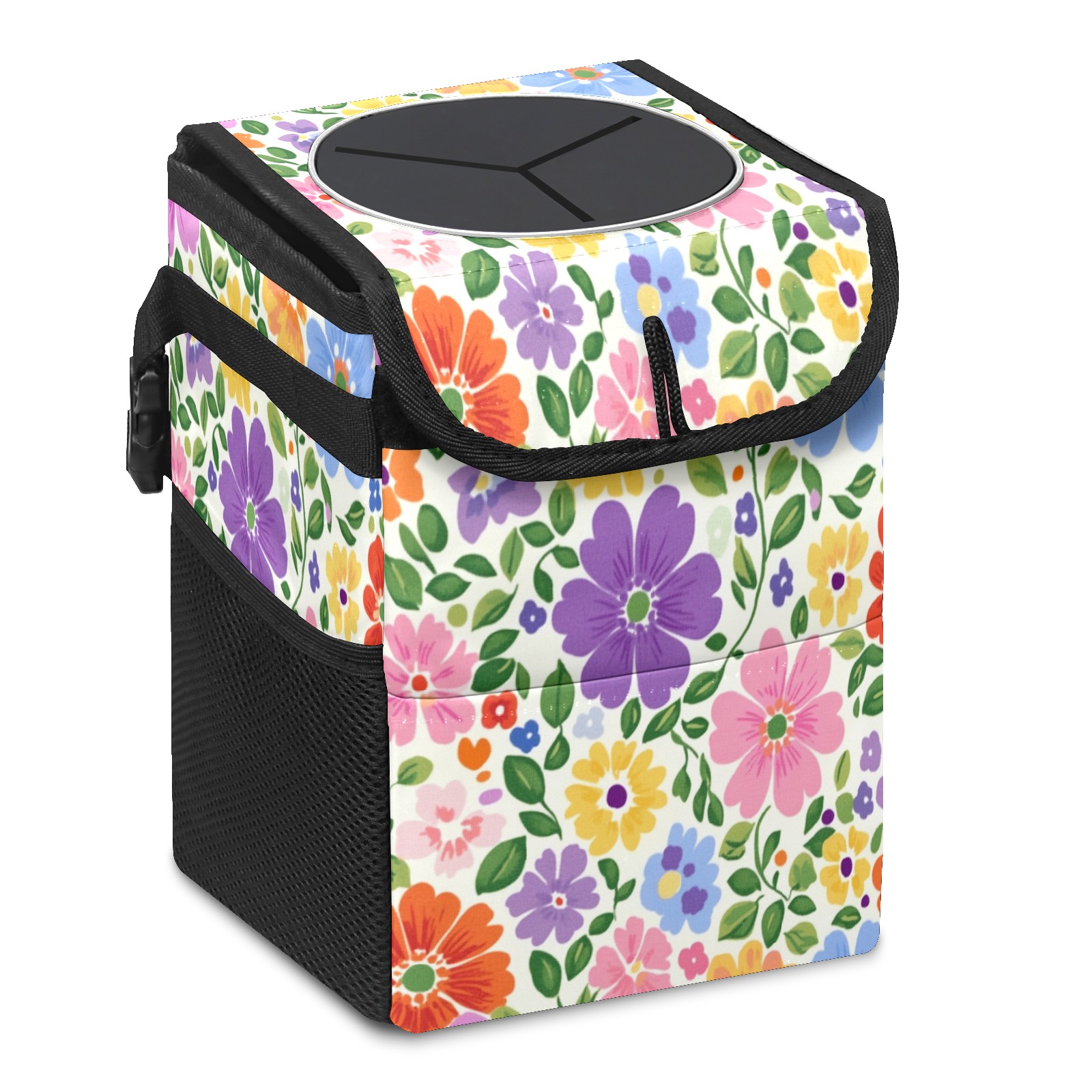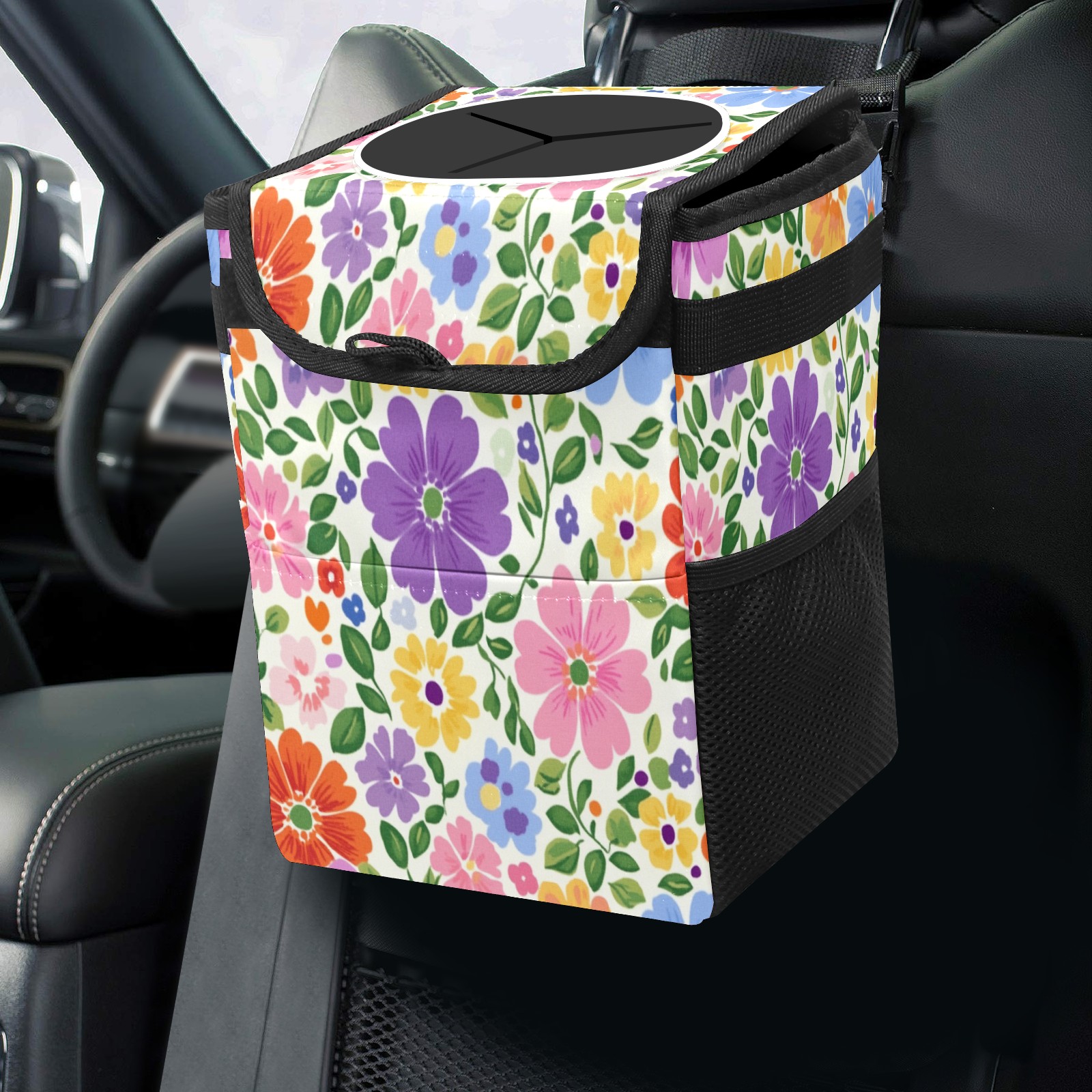 Car Trash Can with Lid, Small Portable Hanging Automotive Garbage Bin for Vehicles, Leakproof Waste Bag Container for SUV Truck Van Interior Auto Travel Road Trips(Colorful Flowers)