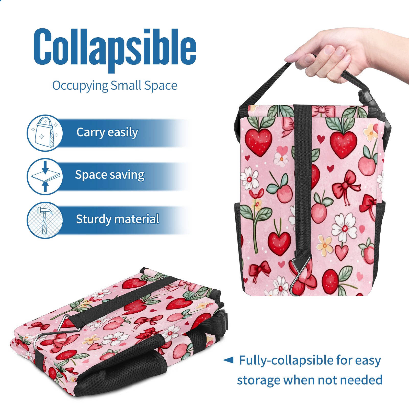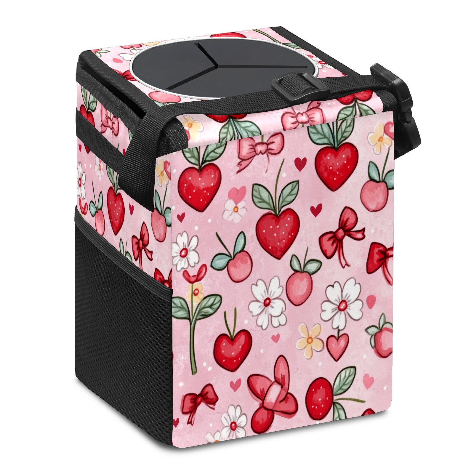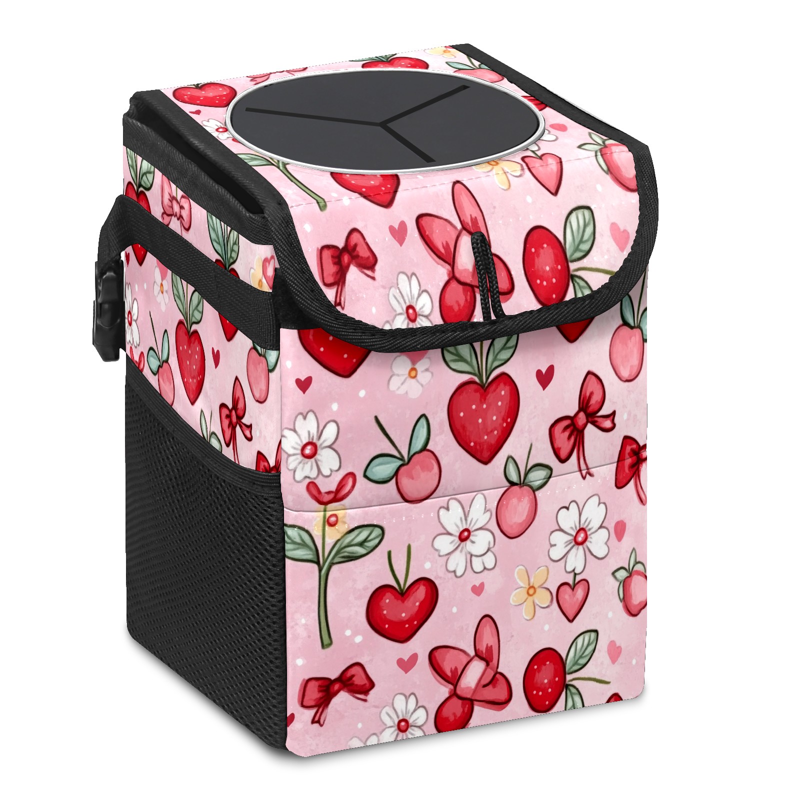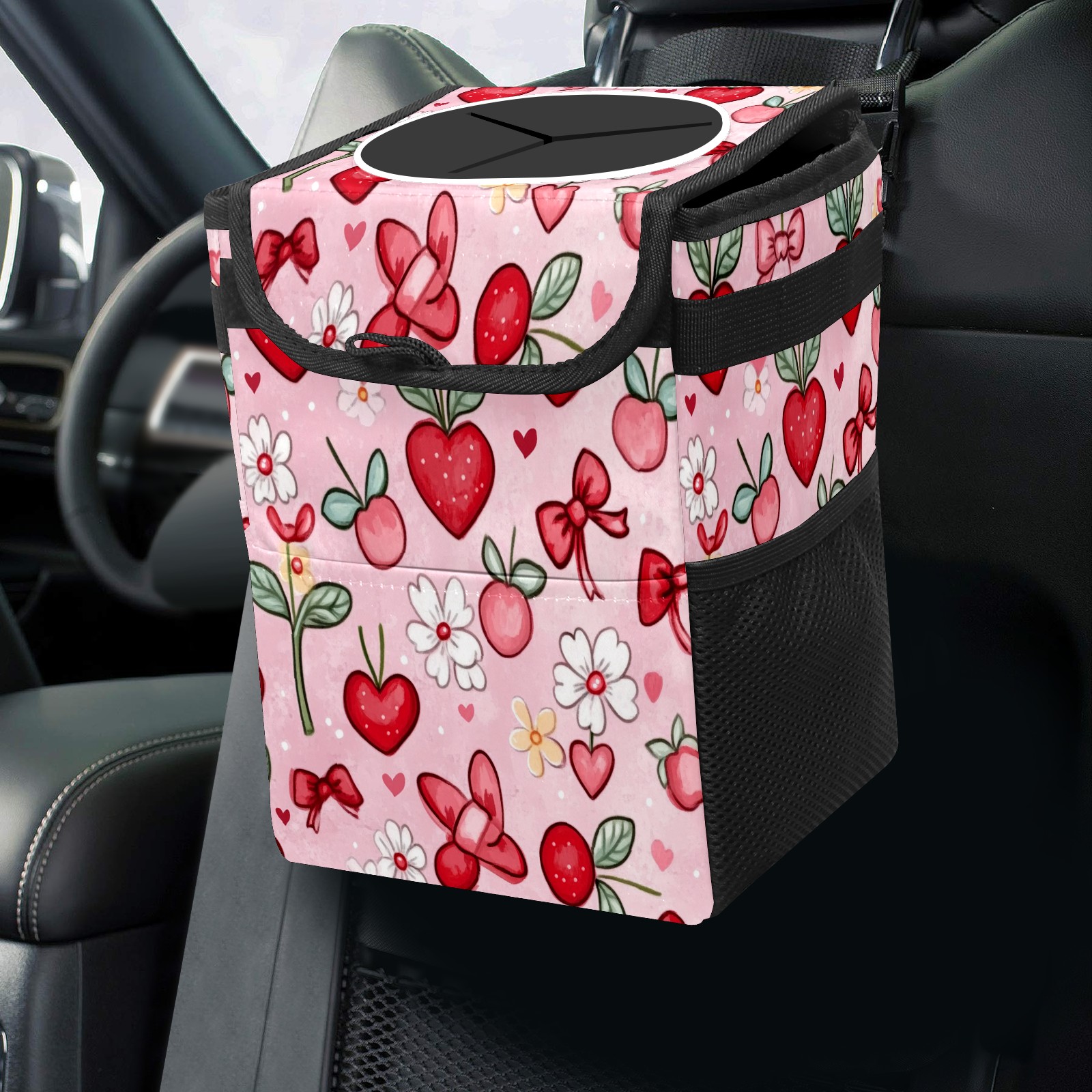 Car Trash Can with Lid, Small Portable Hanging Automotive Garbage Bin for Vehicles, Leakproof Waste Bag Container for SUV Truck Van Interior Auto Travel Road Trips(Red And White Hearts)