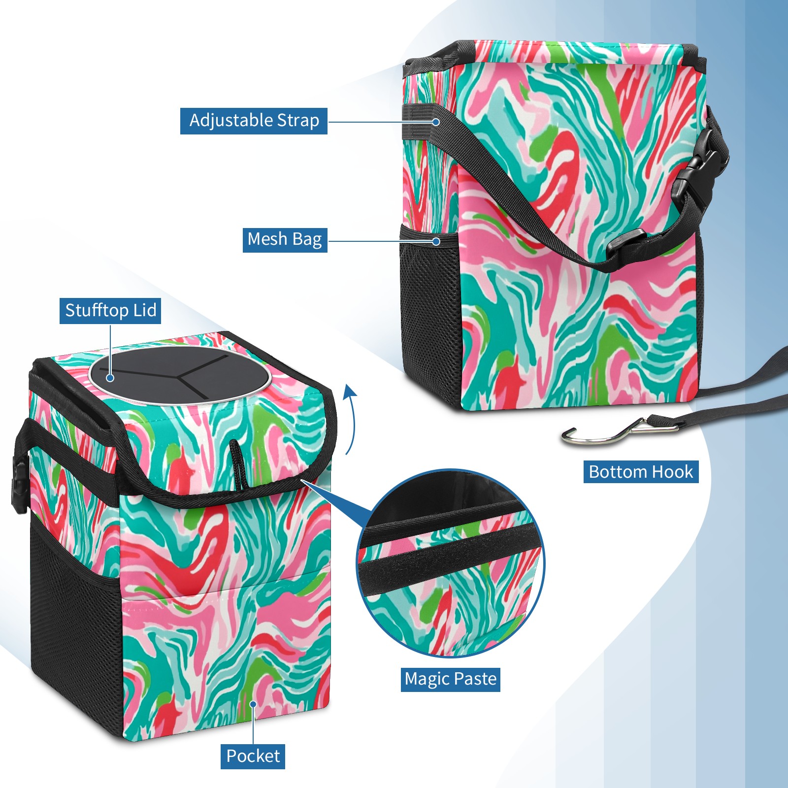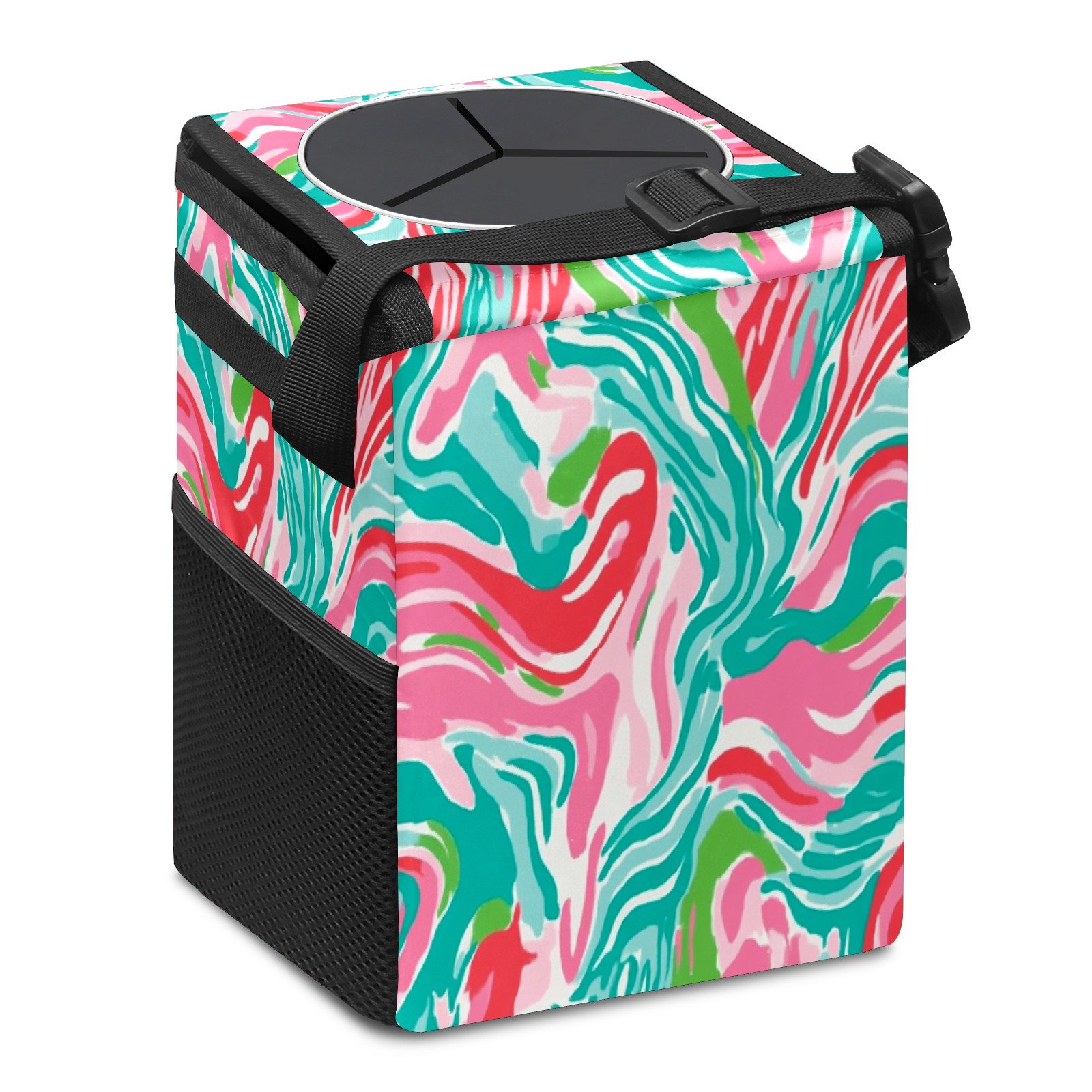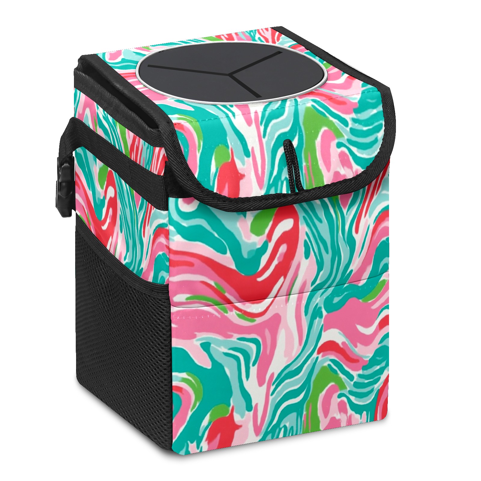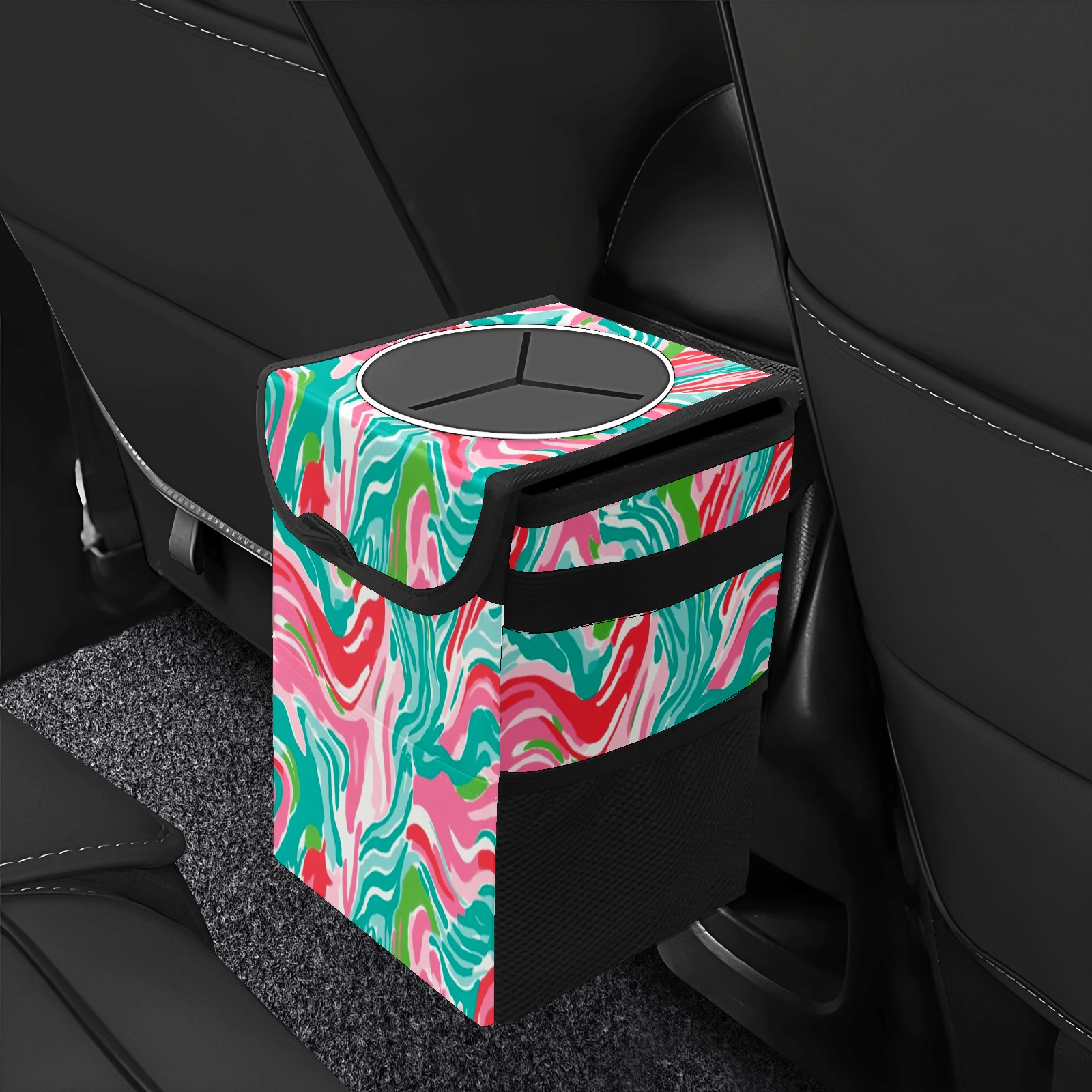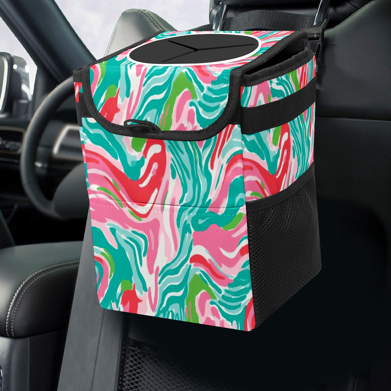 Car Trash Can with Lid, Small Portable Hanging Automotive Garbage Bin for Vehicles, Leakproof Waste Bag Container for SUV Truck Van Interior Auto Travel Road Trips(Pink And Teal Abstract Waves)