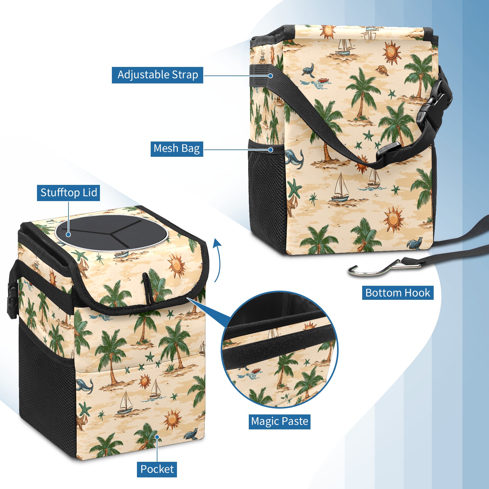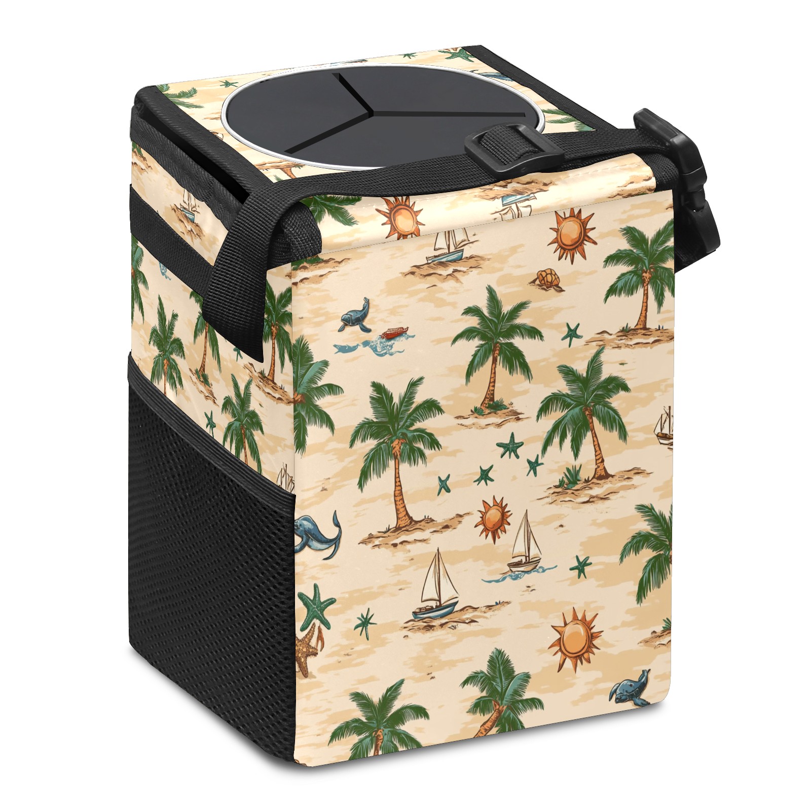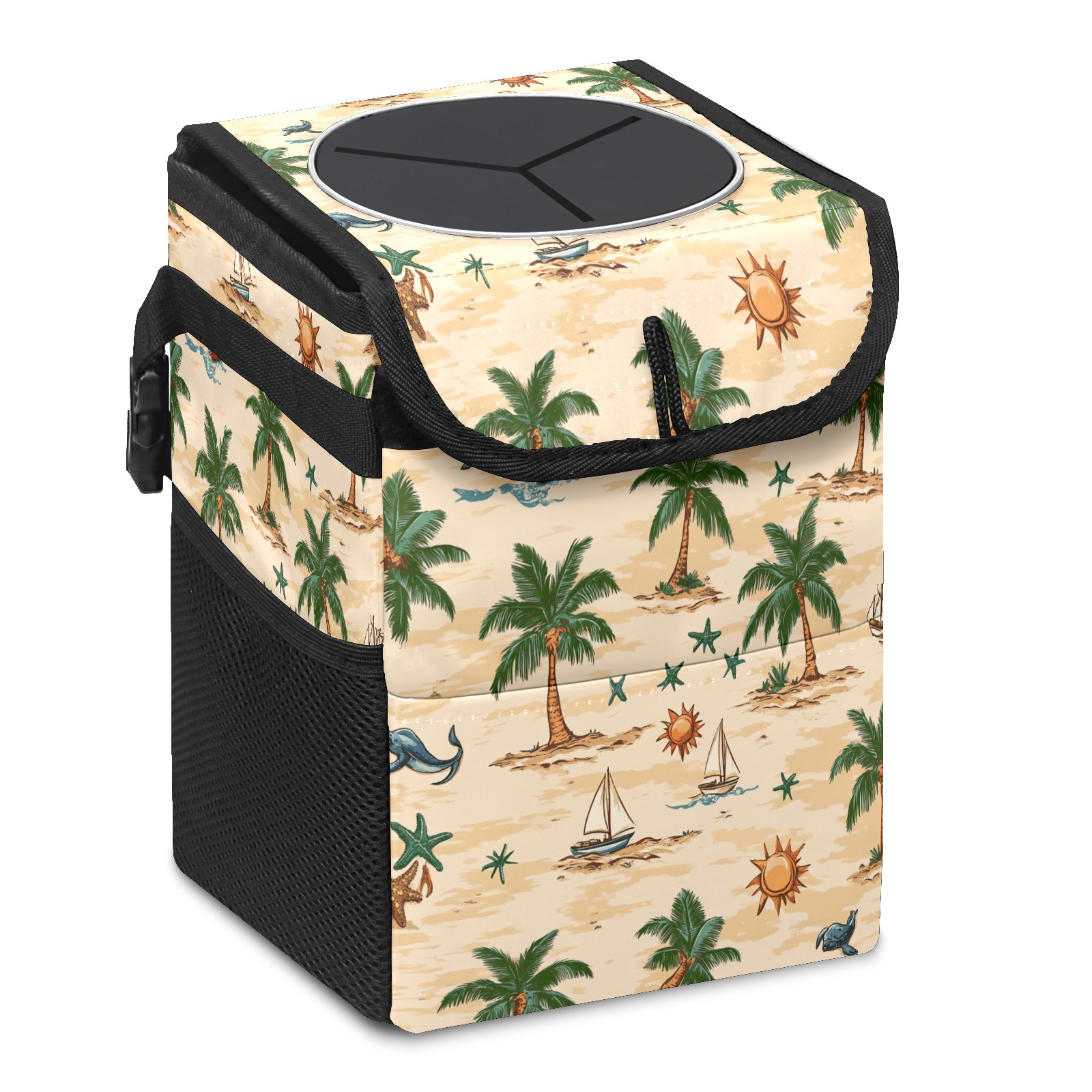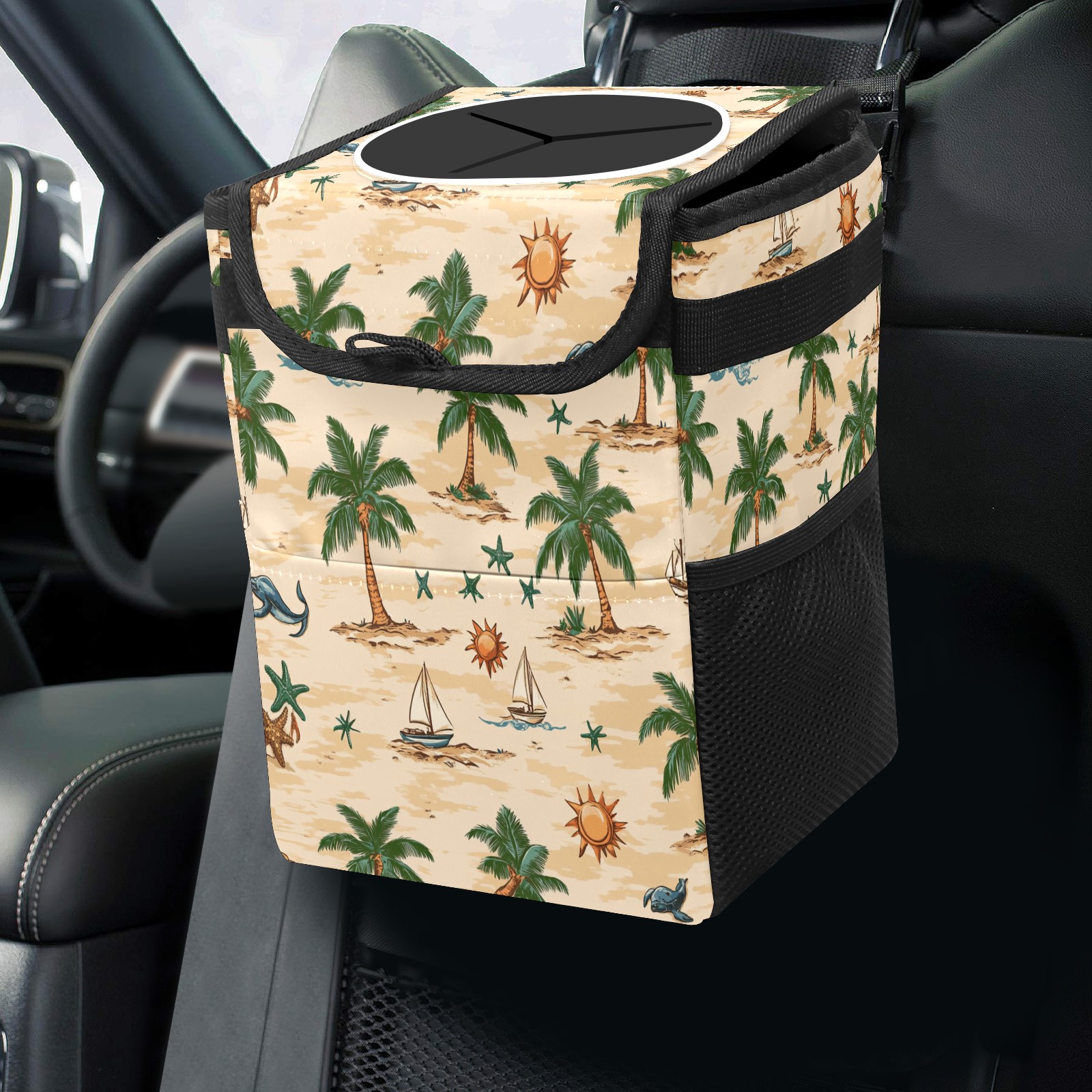 Car Trash Can with Lid, Small Portable Hanging Automotive Garbage Bin for Vehicles, Leakproof Waste Bag Container for SUV Truck Van Interior Auto Travel Road Trips(Palm Trees Suns And Starfish)