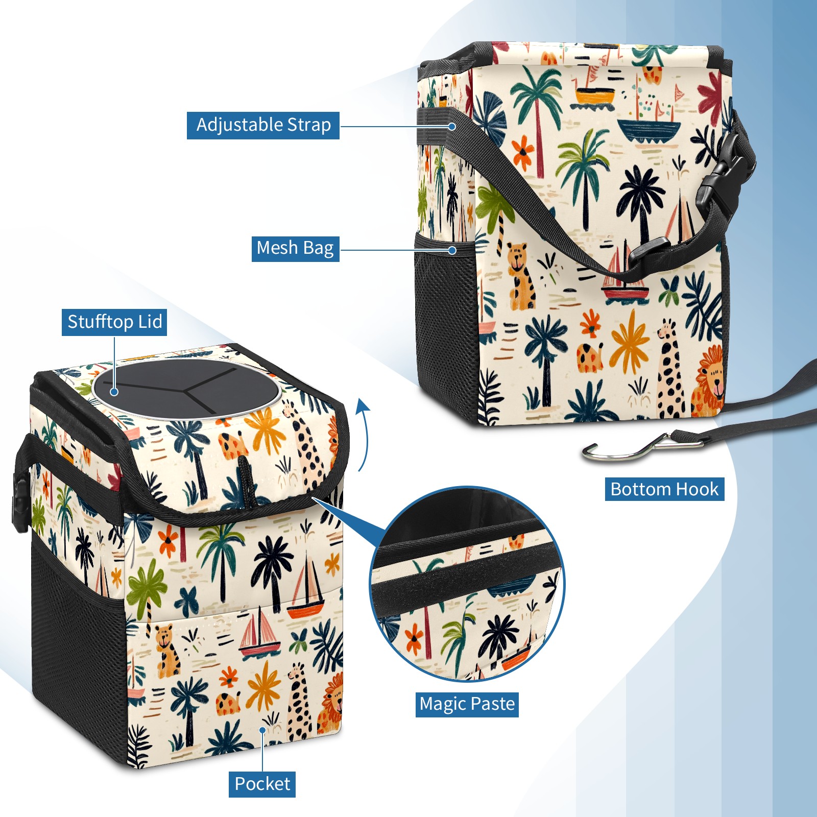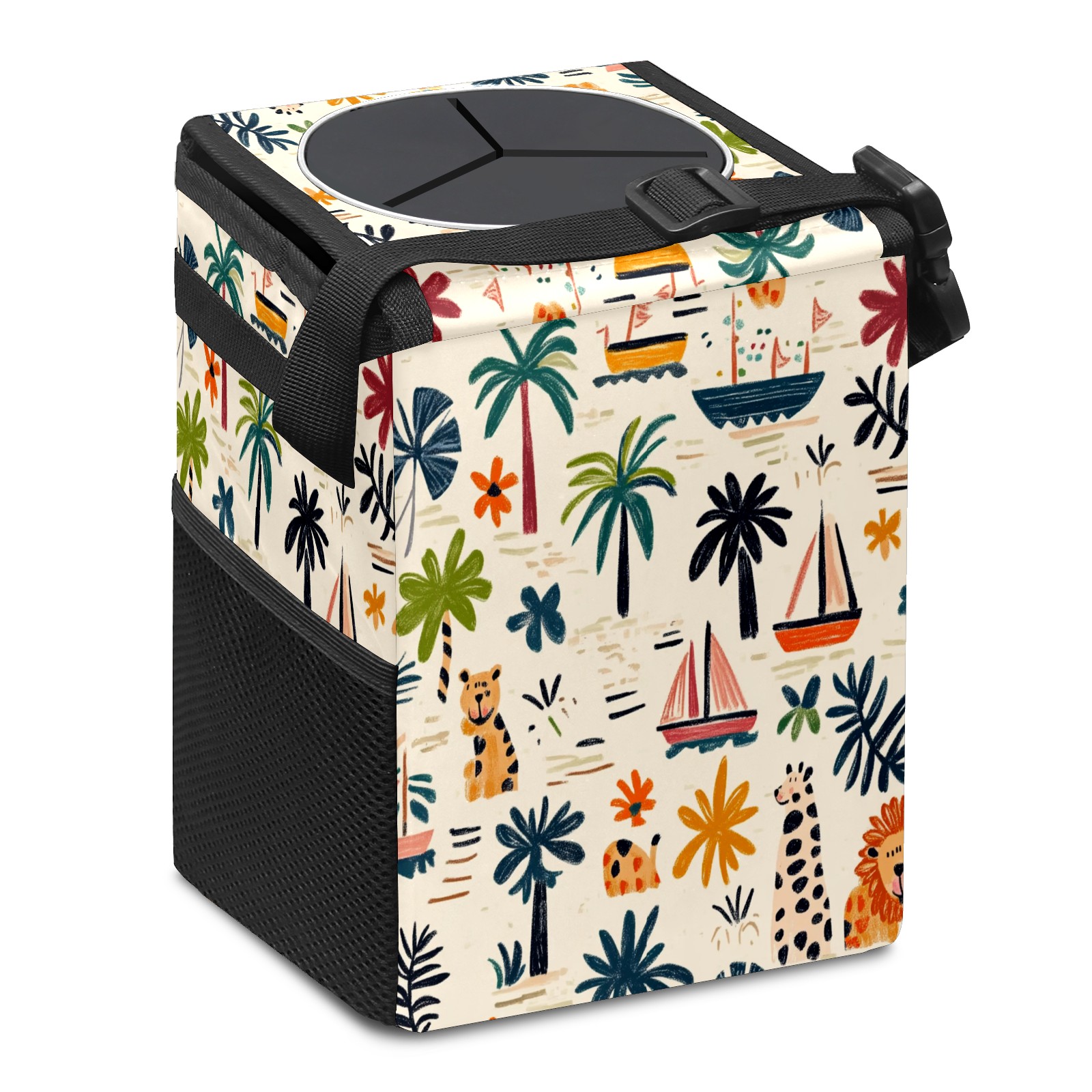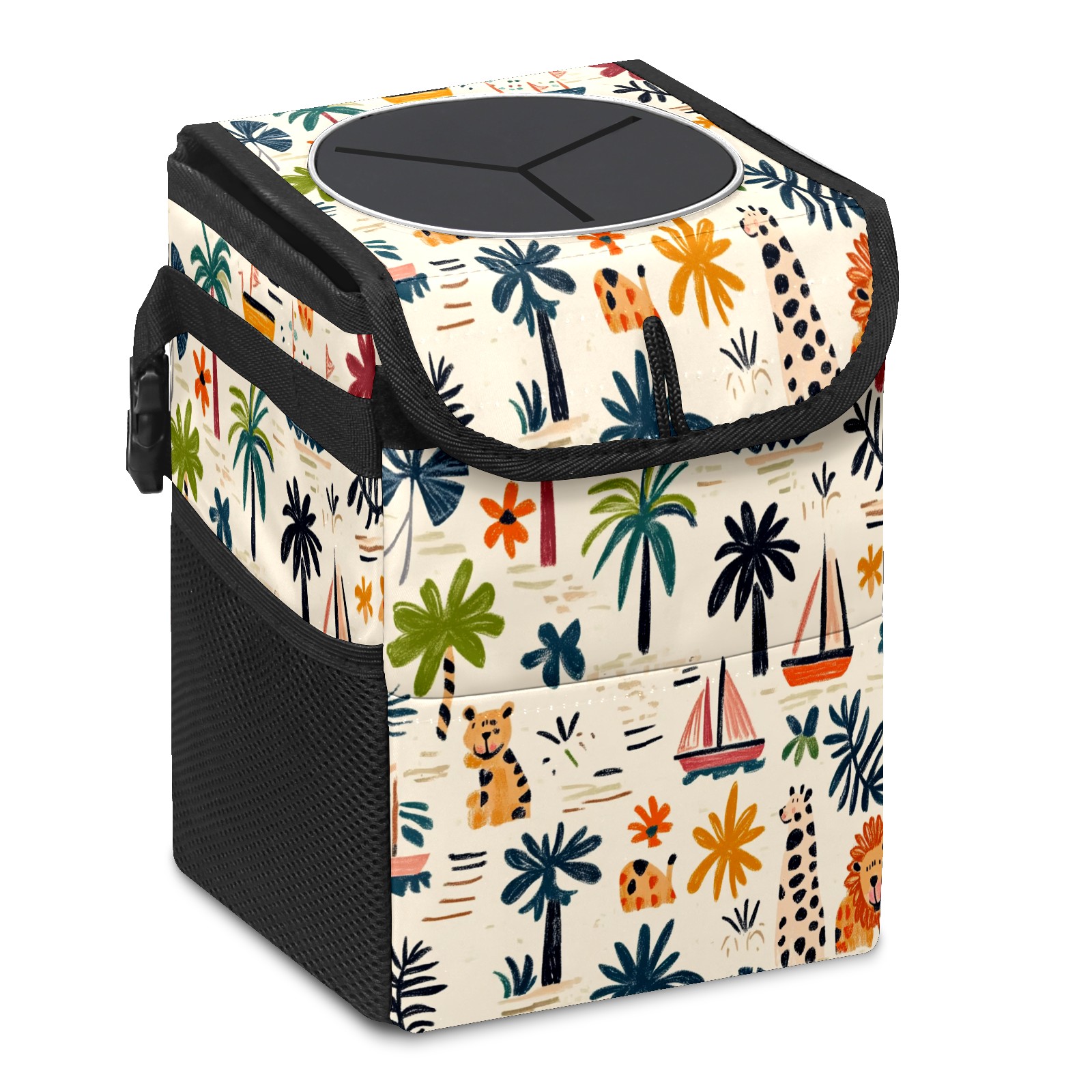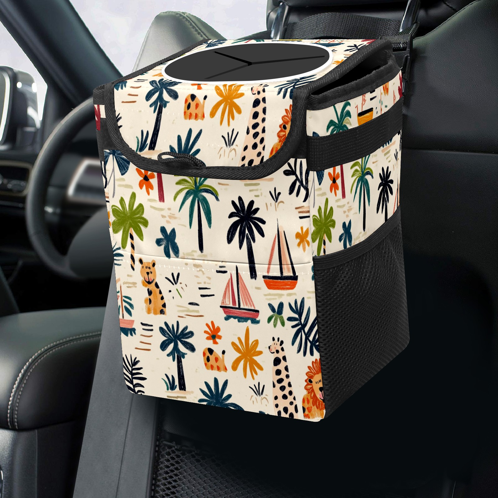 Car Trash Can with Lid, Small Portable Hanging Automotive Garbage Bin for Vehicles, Leakproof Waste Bag Container for SUV Truck Van Interior Auto Travel Road Trips(Palm Trees Boats And Lions)