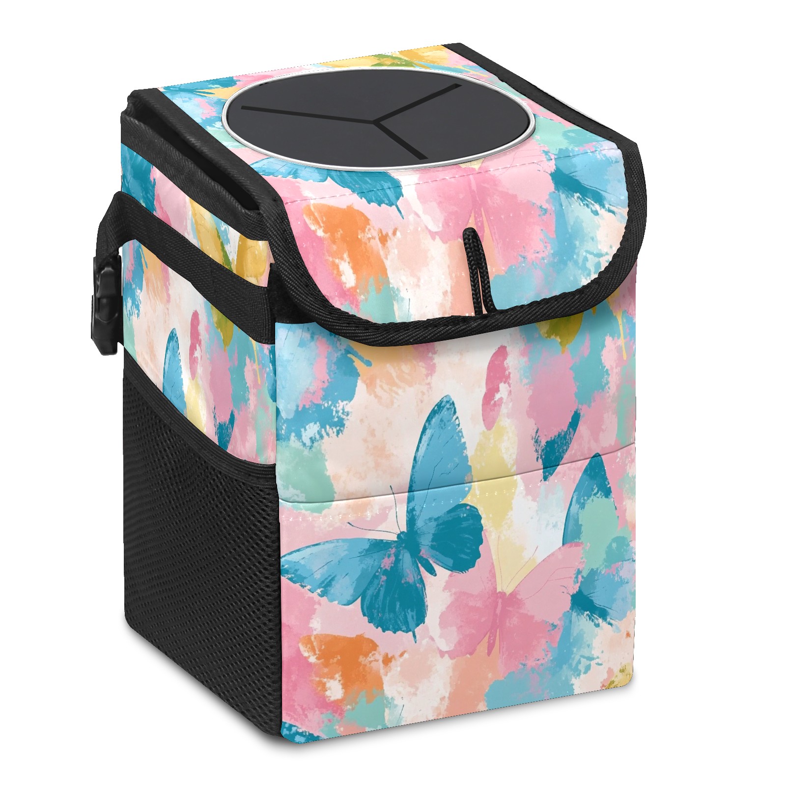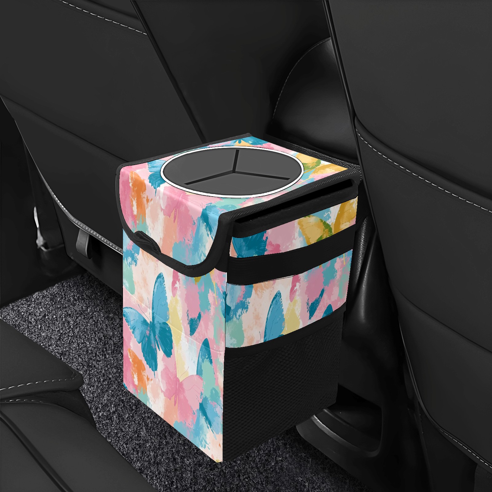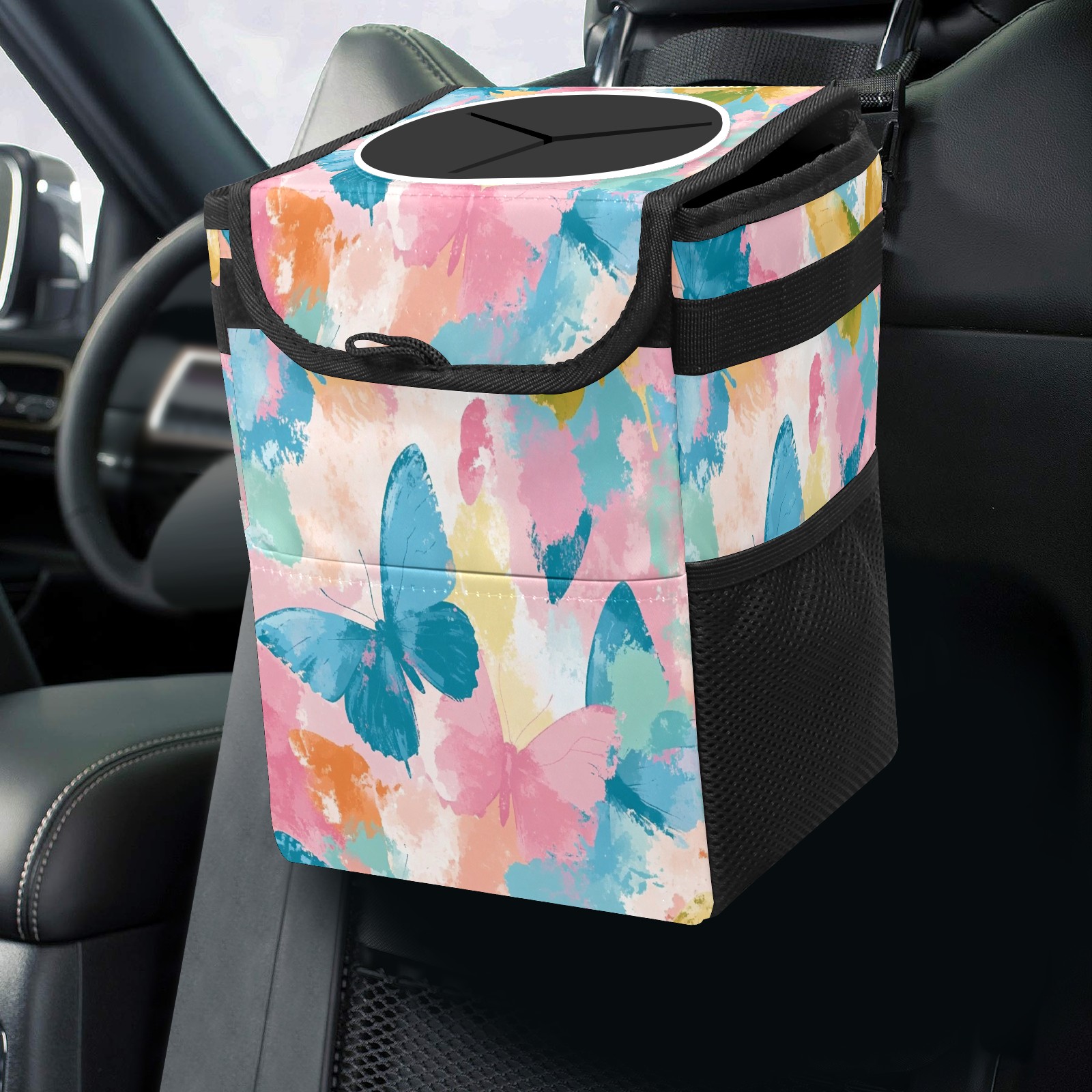 Car Trash Can with Lid, Small Portable Hanging Automotive Garbage Bin for Vehicles, Leakproof Waste Bag Container for SUV Truck Van Interior Auto Travel Road Trips(Pastel-color Butterflies)
