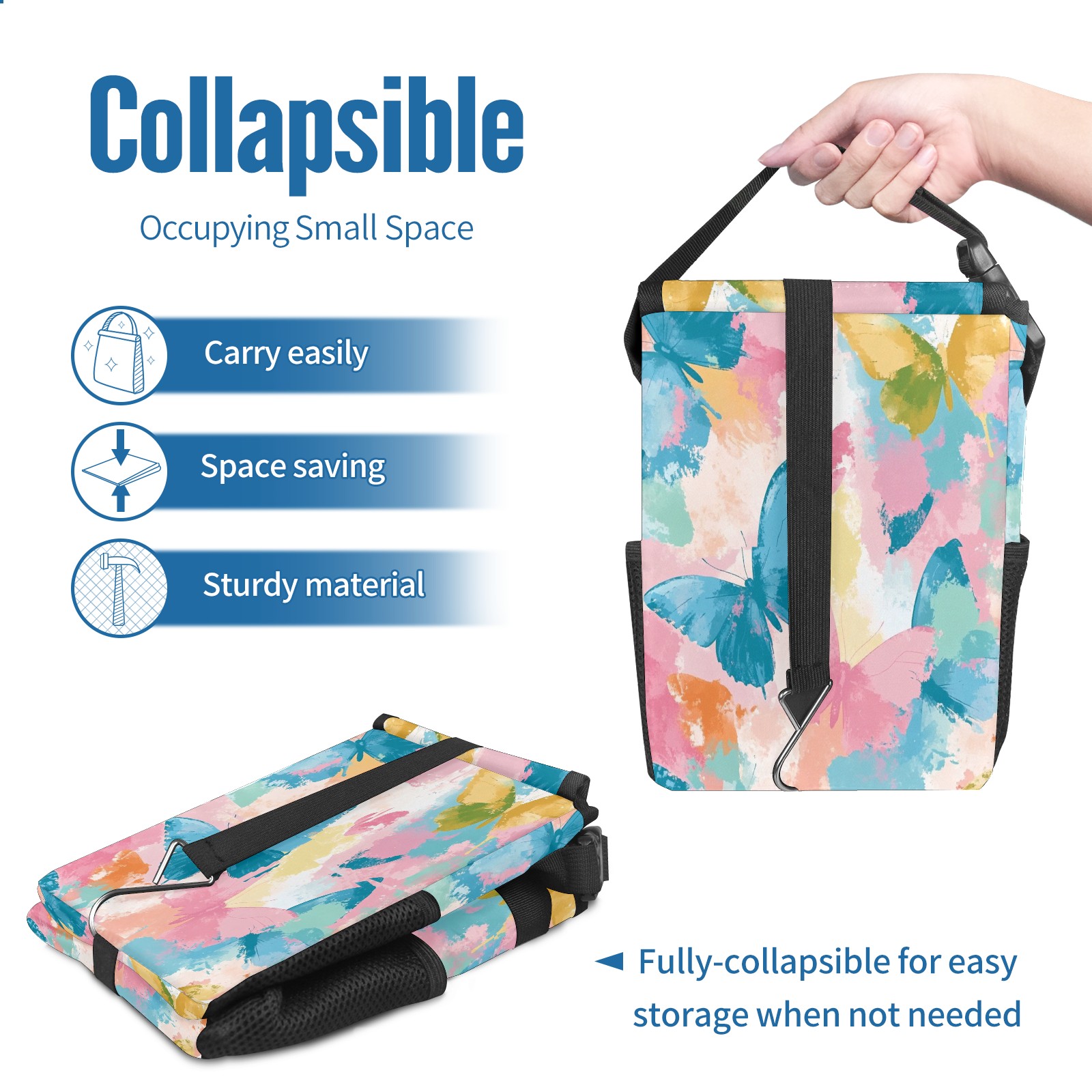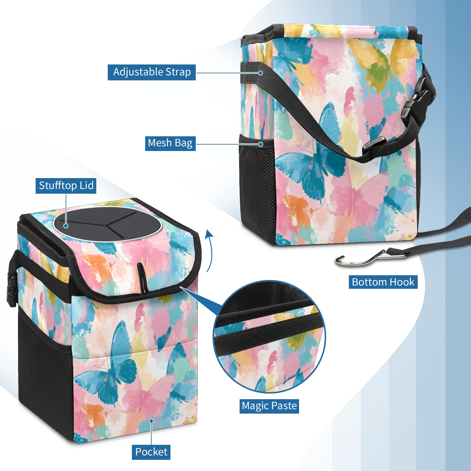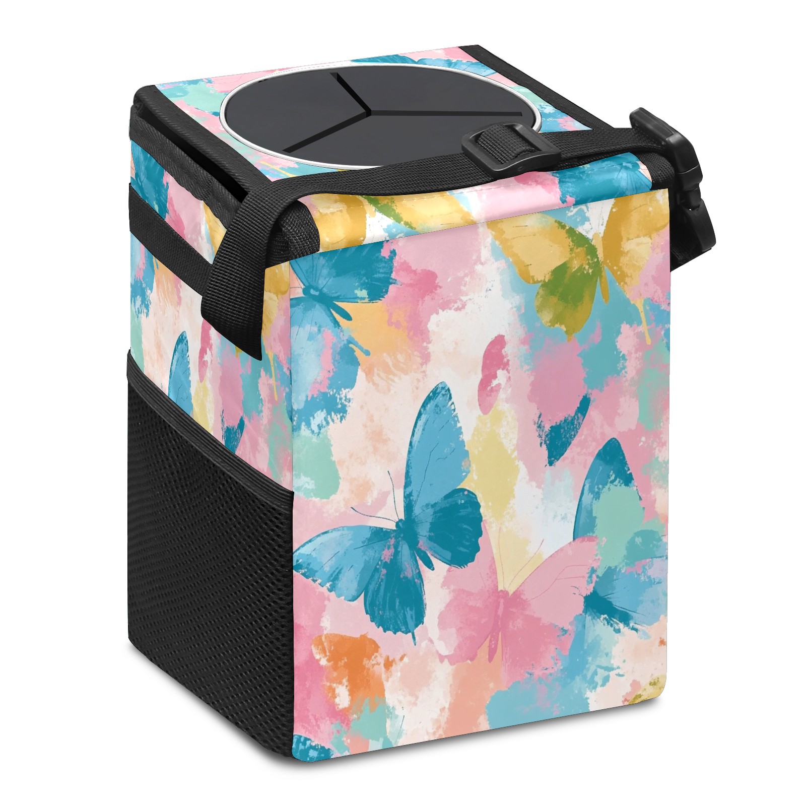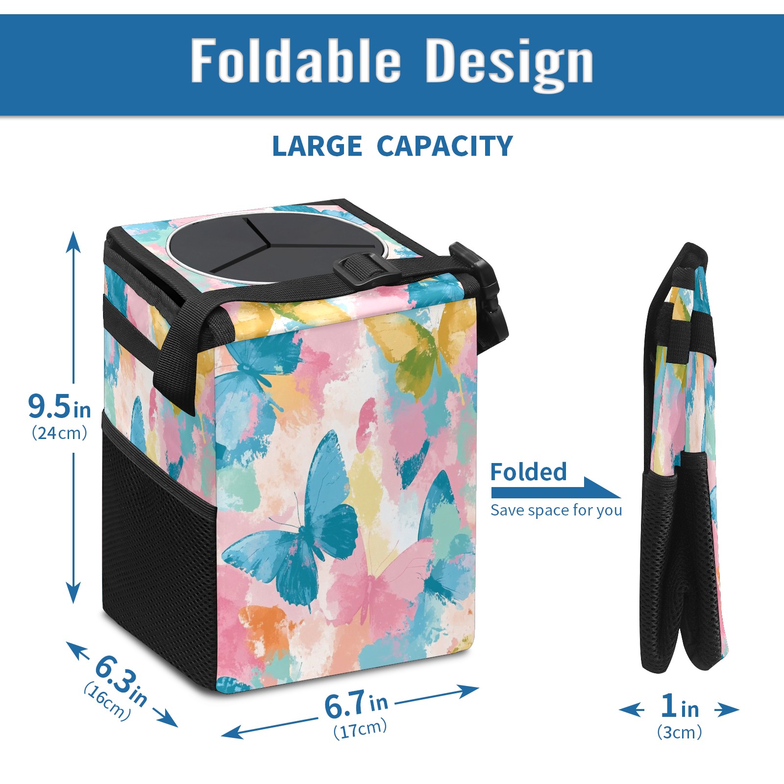 Car Trash Can with Lid, Small Portable Hanging Automotive Garbage Bin for Vehicles, Leakproof Waste Bag Container for SUV Truck Van Interior Auto Travel Road Trips(Pastel-color Butterflies)