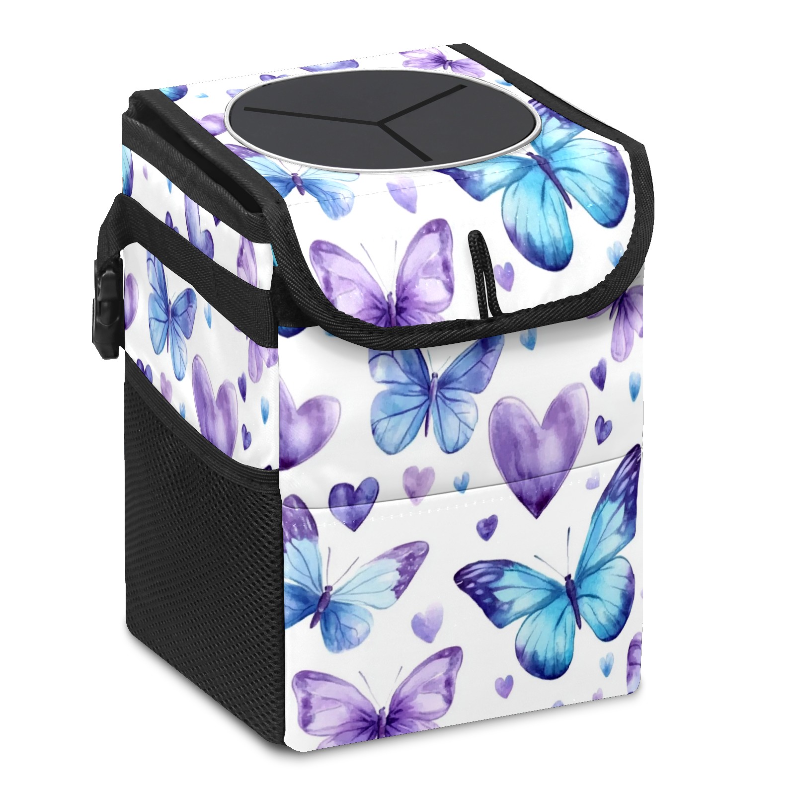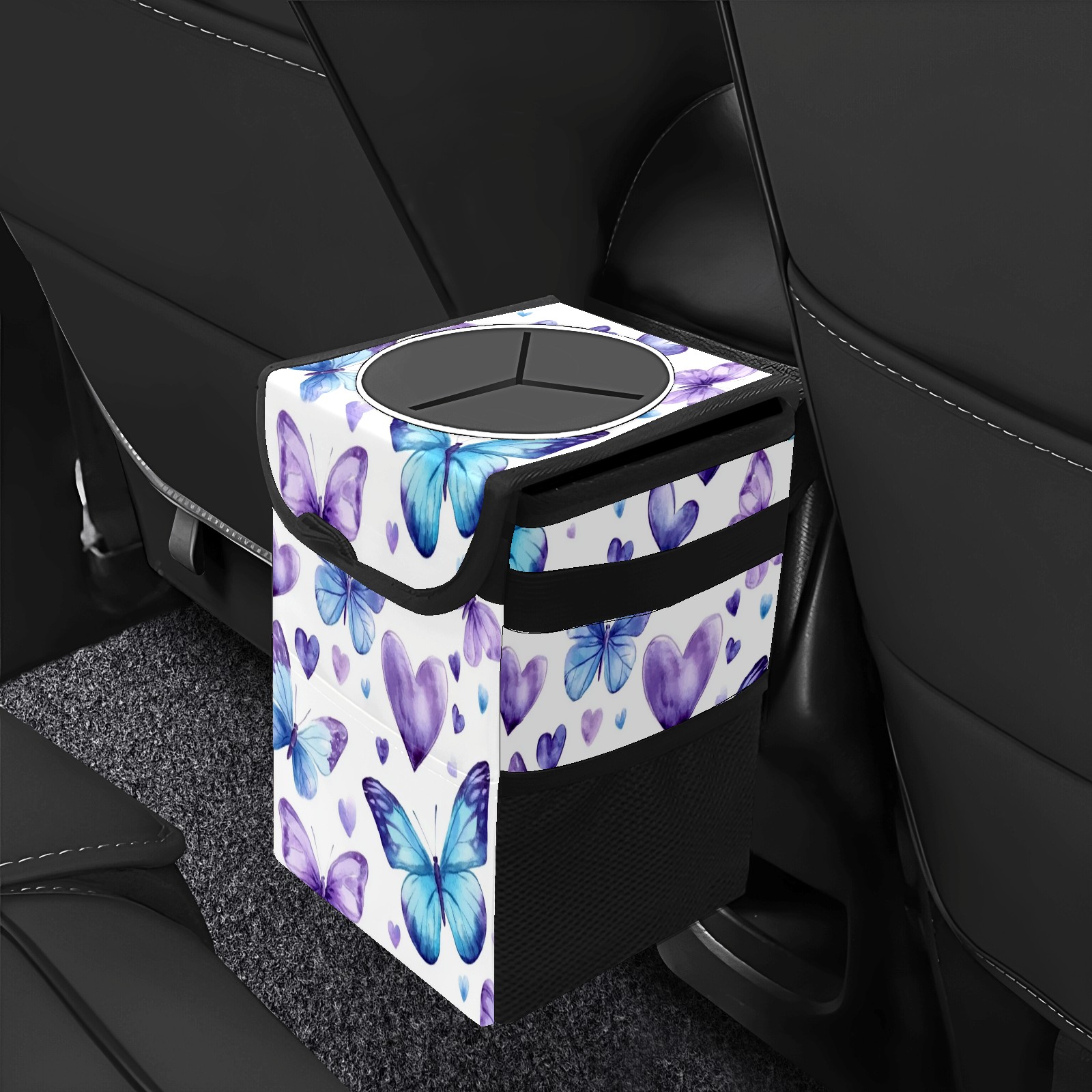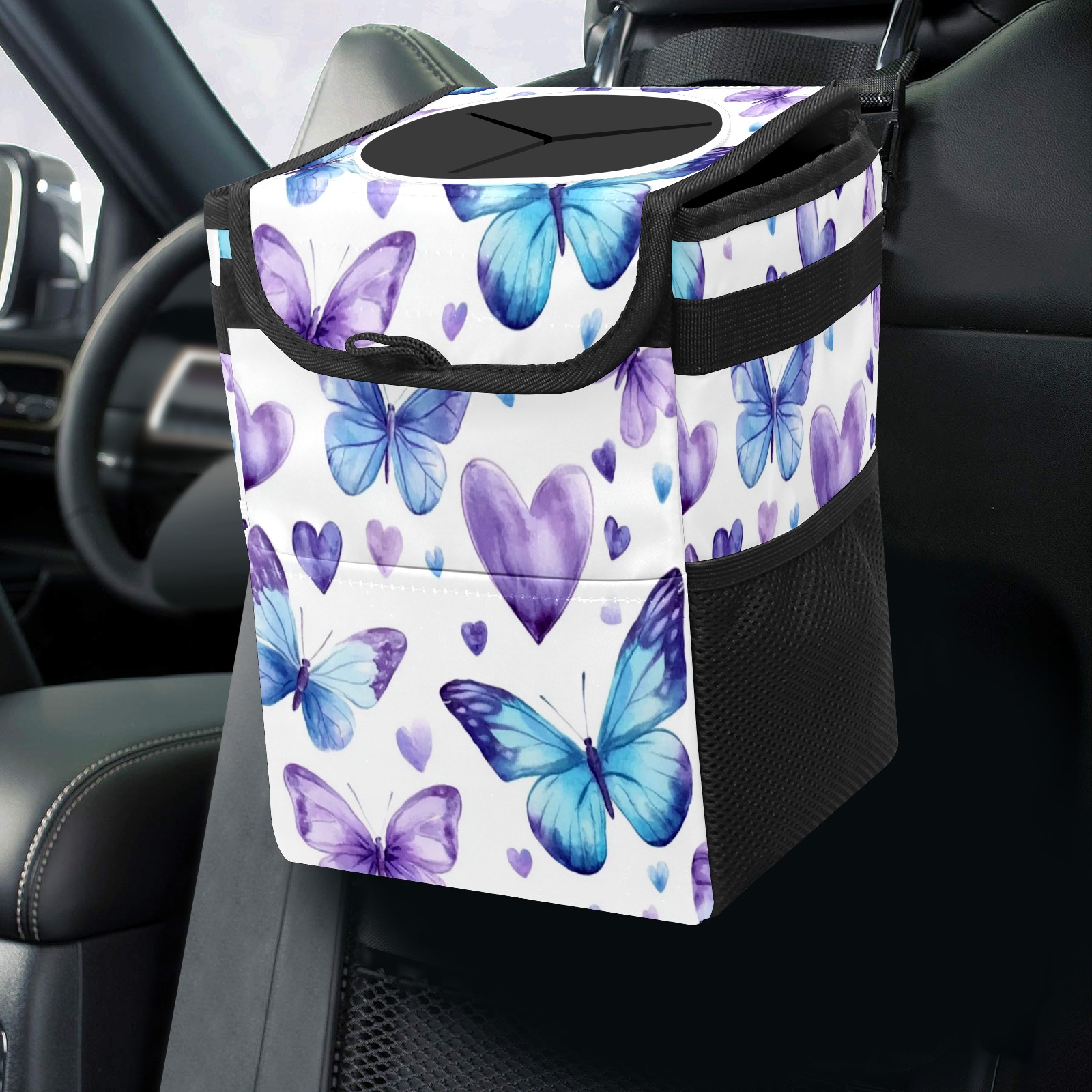 Car Trash Can with Lid, Small Portable Hanging Automotive Garbage Bin for Vehicles, Leakproof Waste Bag Container for SUV Truck Van Interior Auto Travel Road Trips(Watercolor Butterfly)