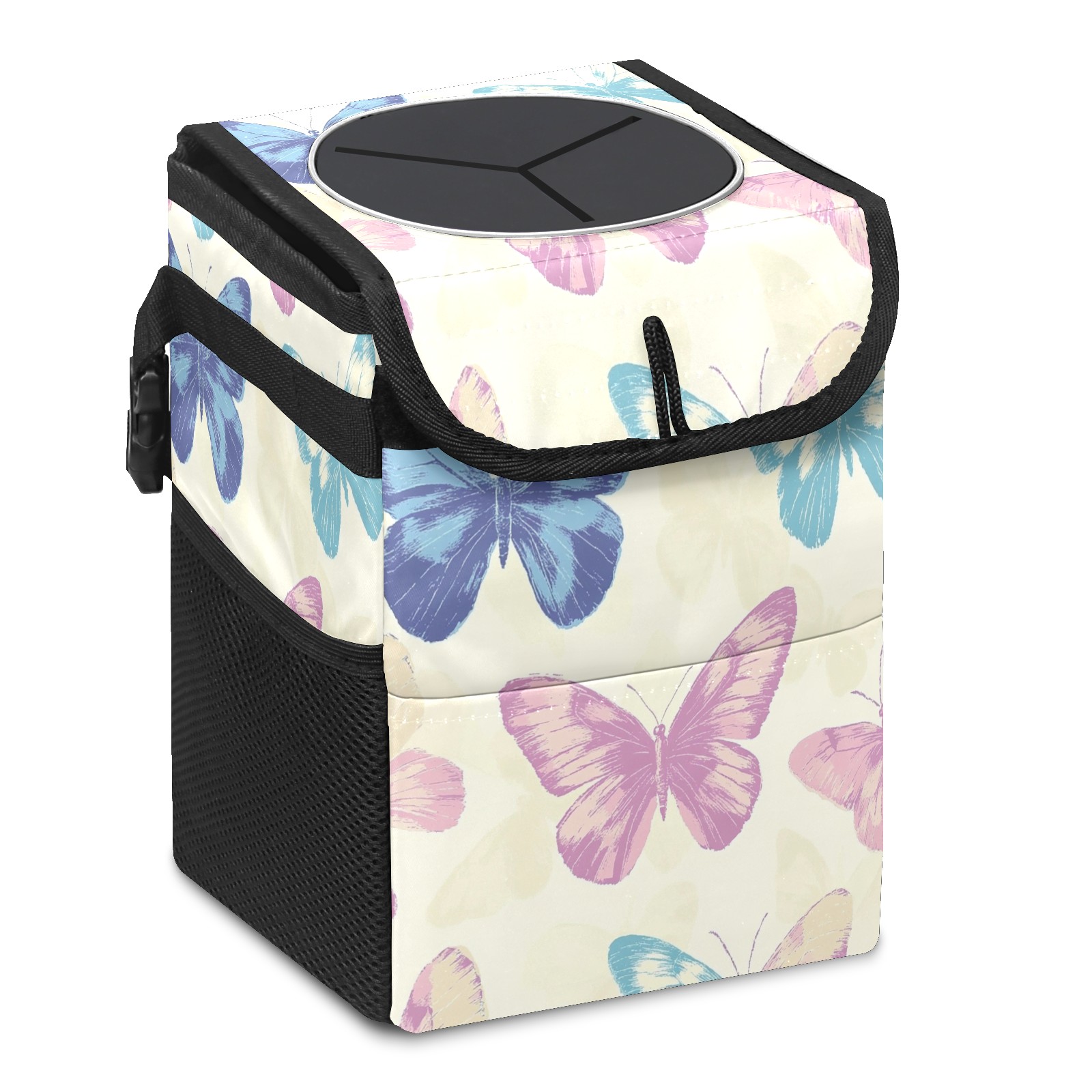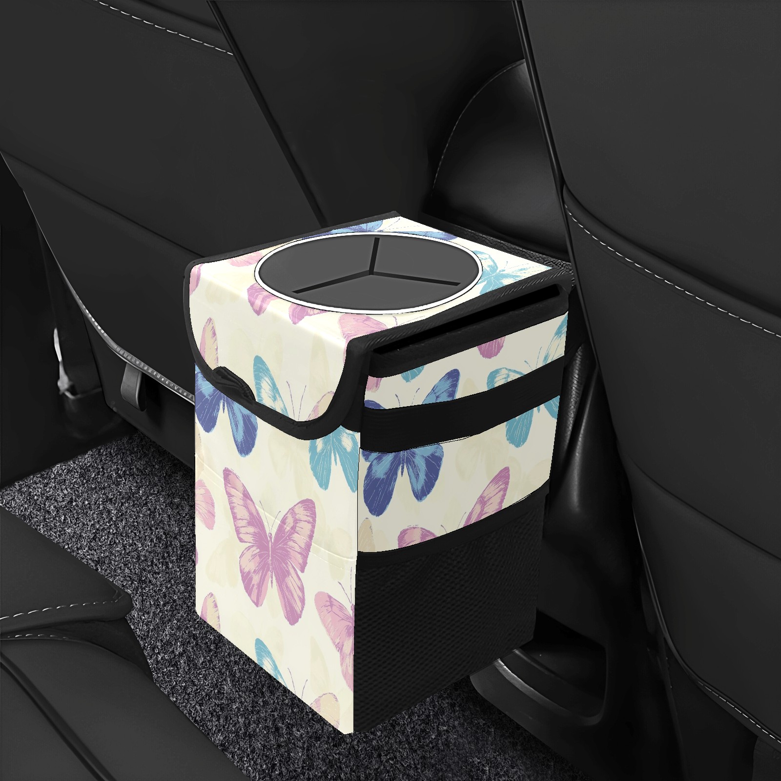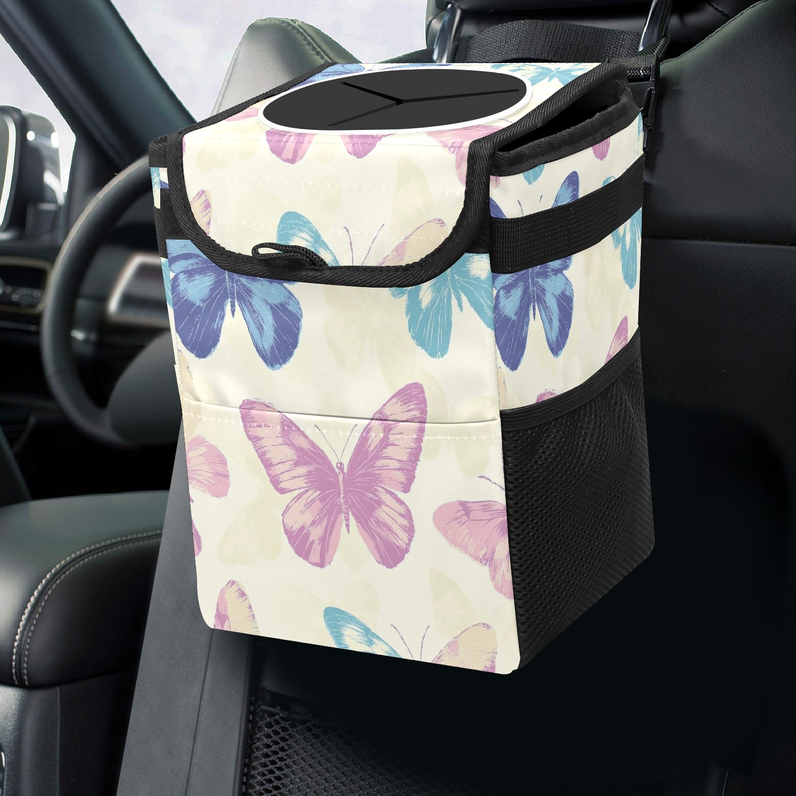 Car Trash Can with Lid, Small Portable Hanging Automotive Garbage Bin for Vehicles, Leakproof Waste Bag Container for SUV Truck Van Interior Auto Travel Road Trips(Pink And Blue Butterflies)