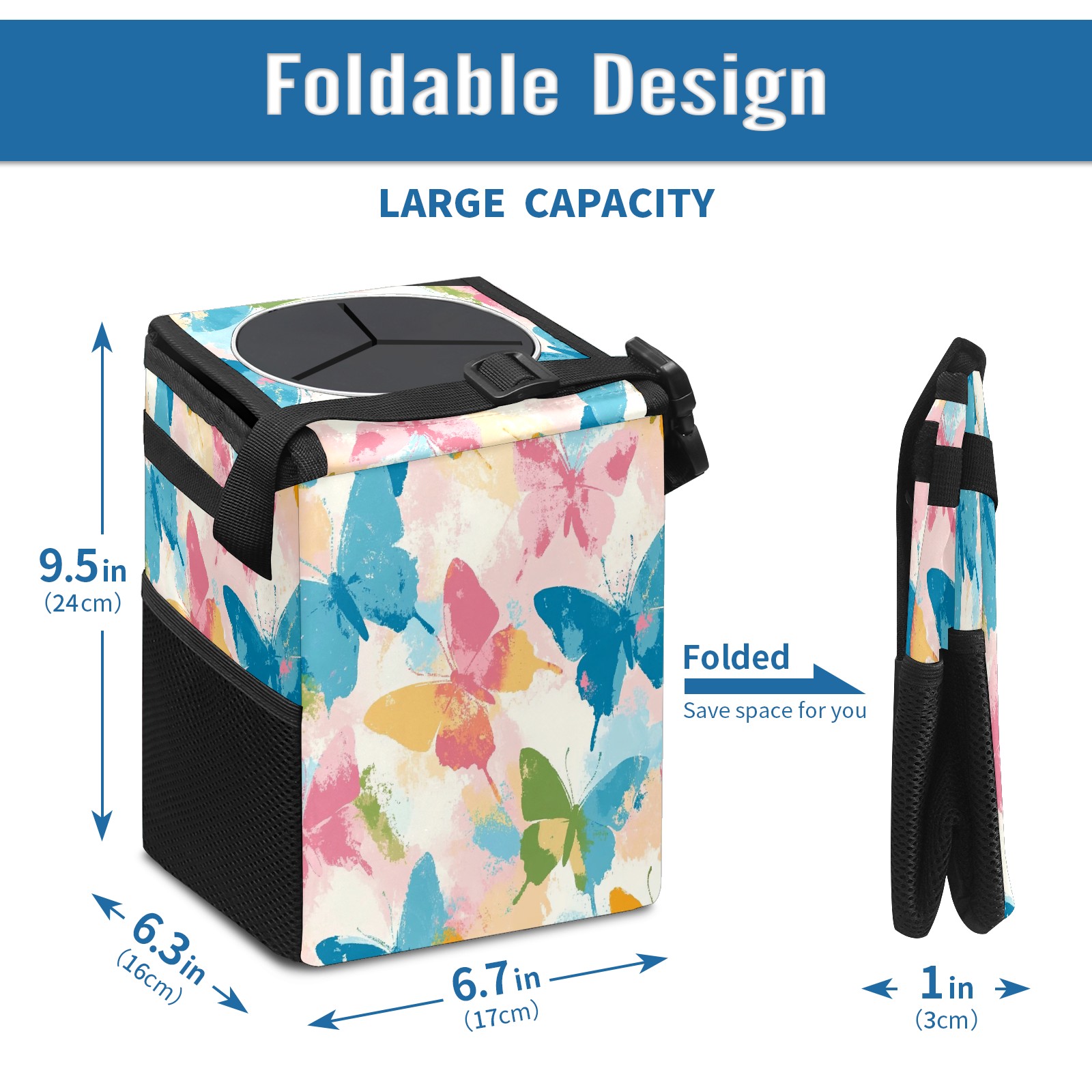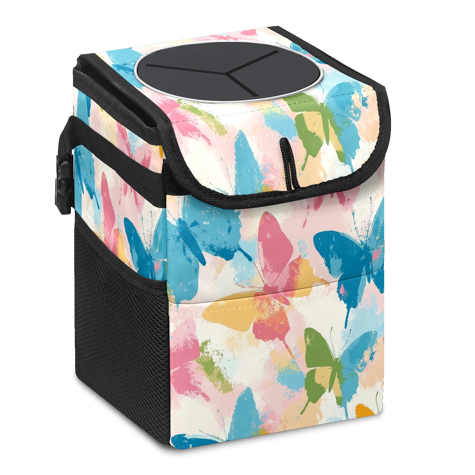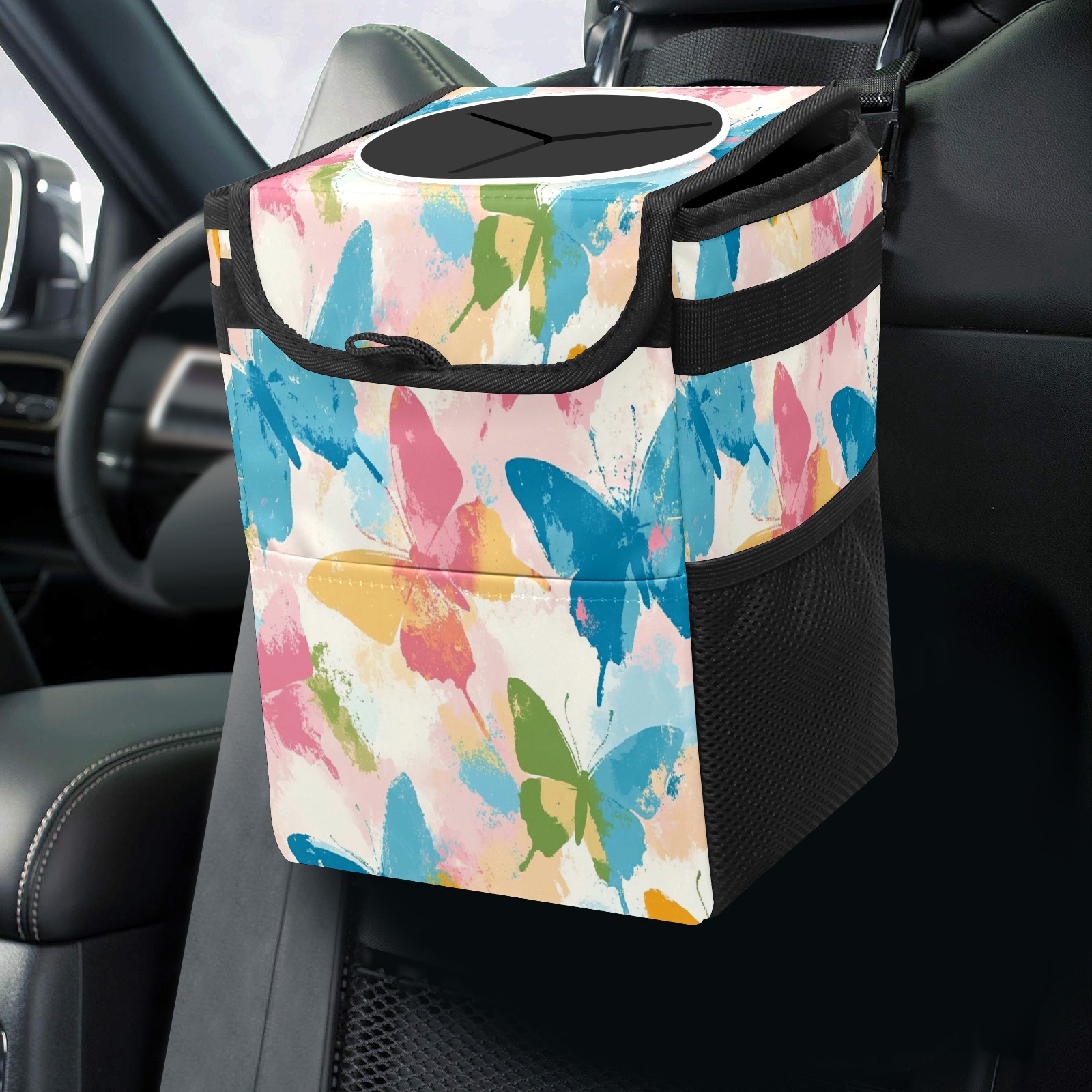 Car Trash Can with Lid, Small Portable Hanging Automotive Garbage Bin for Vehicles, Leakproof Waste Bag Container for SUV Truck Van Interior Auto Travel Road Trips(Butterflies In Pastel Colors)