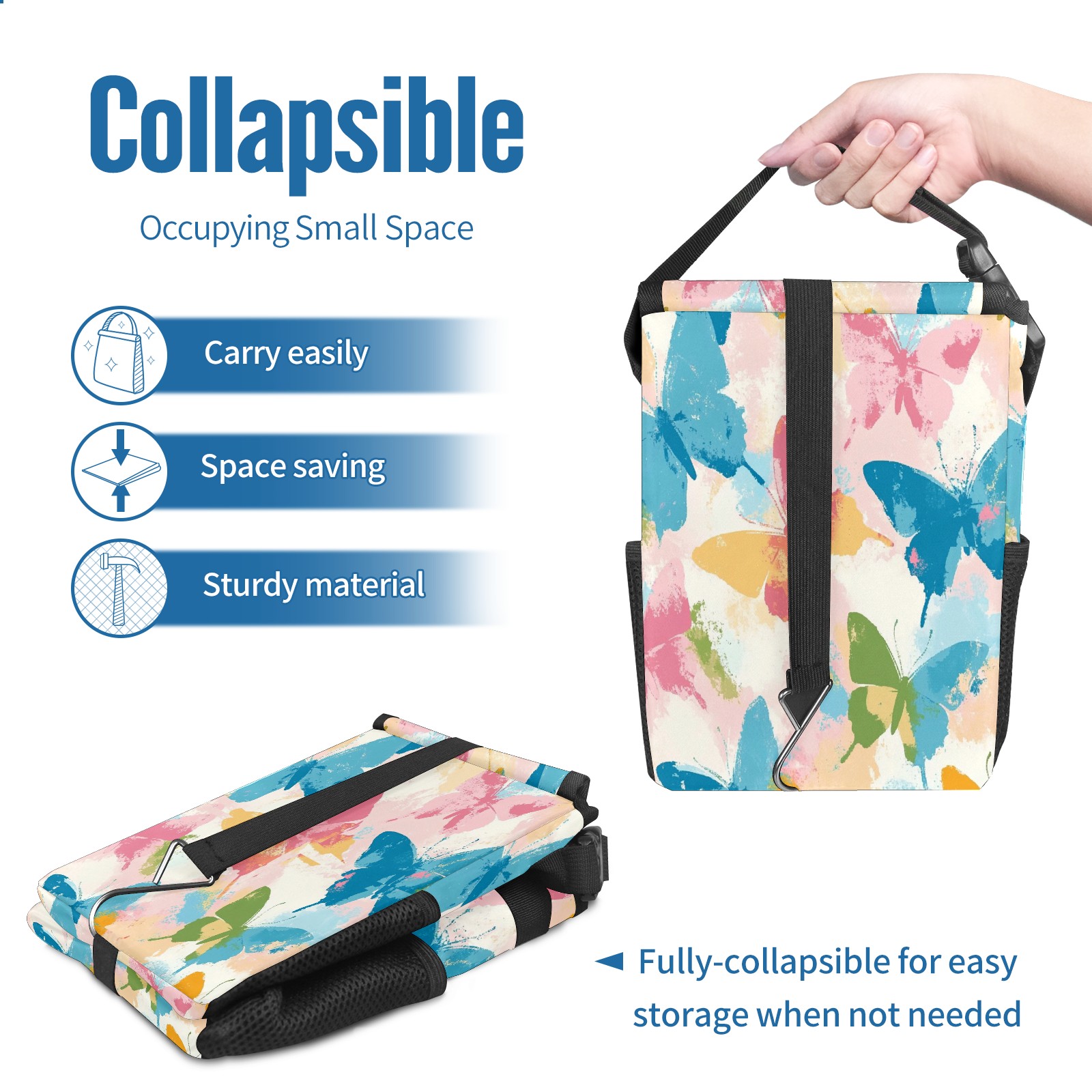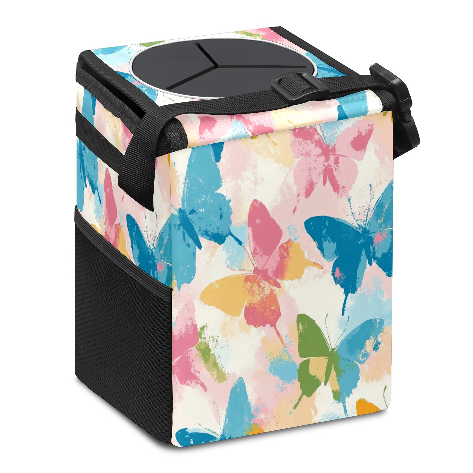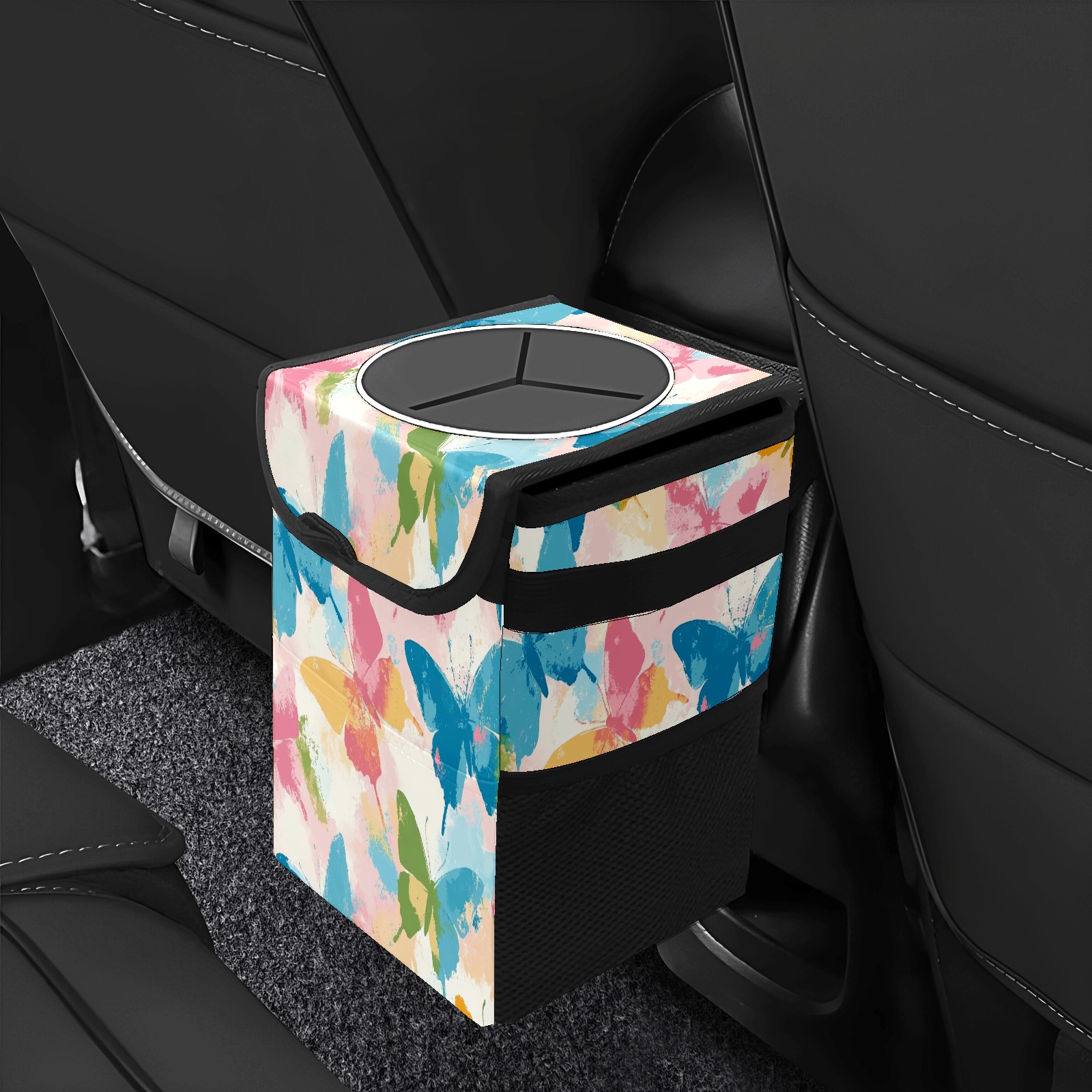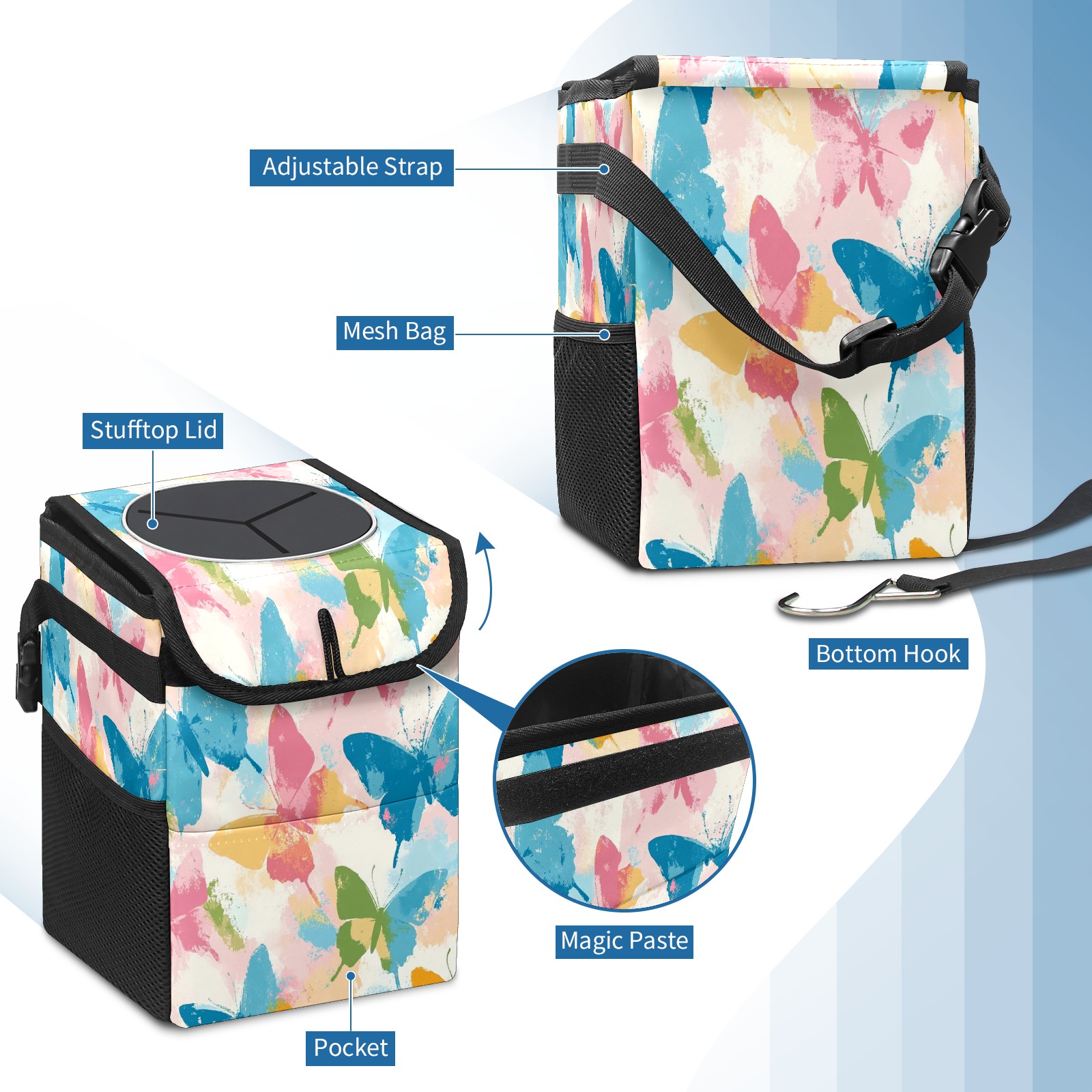 Car Trash Can with Lid, Small Portable Hanging Automotive Garbage Bin for Vehicles, Leakproof Waste Bag Container for SUV Truck Van Interior Auto Travel Road Trips(Butterflies In Pastel Colors)