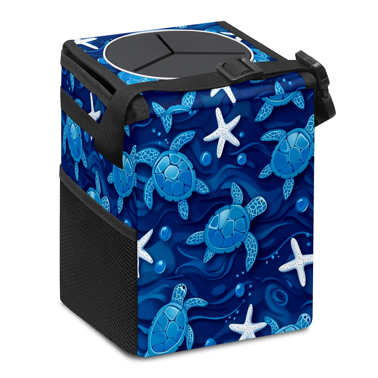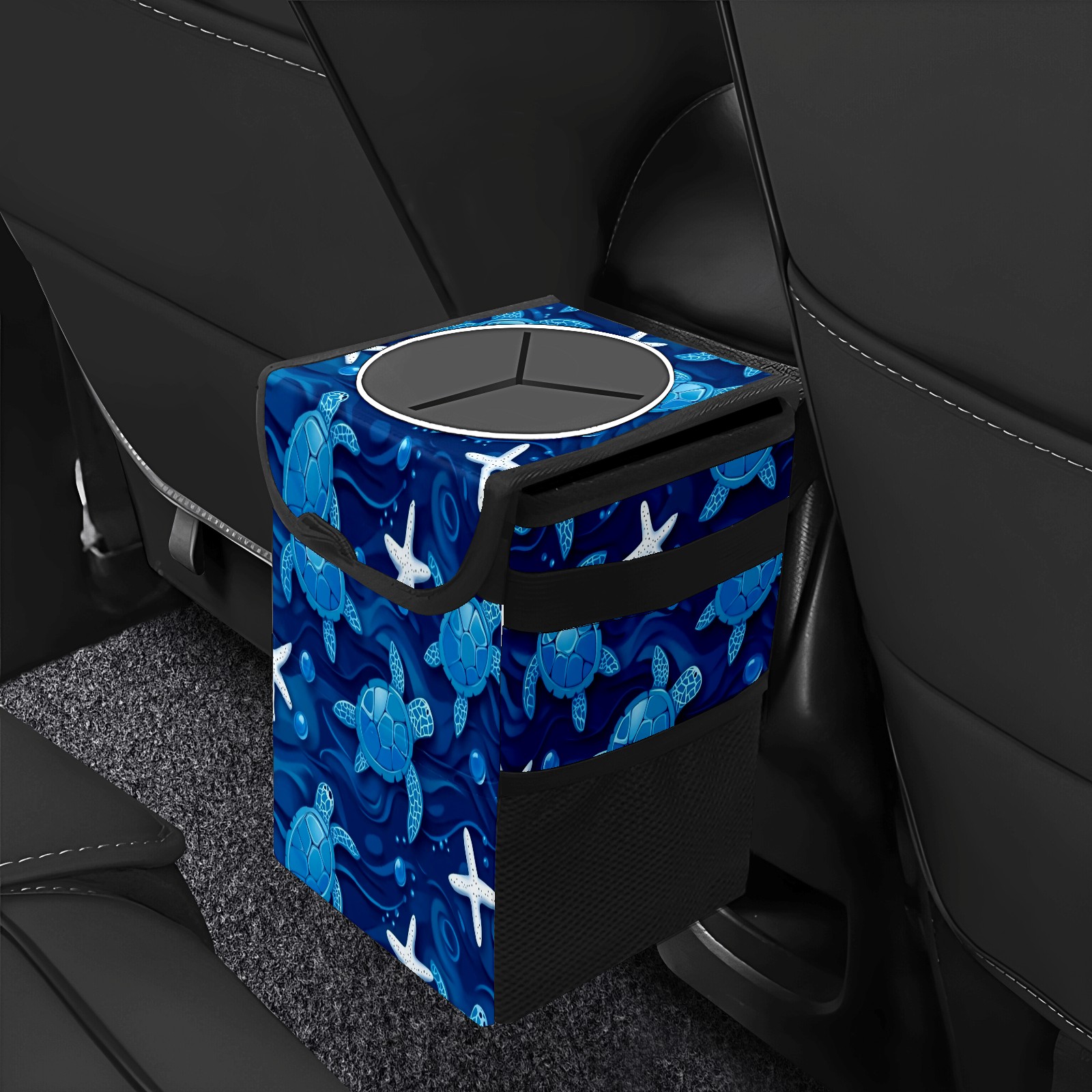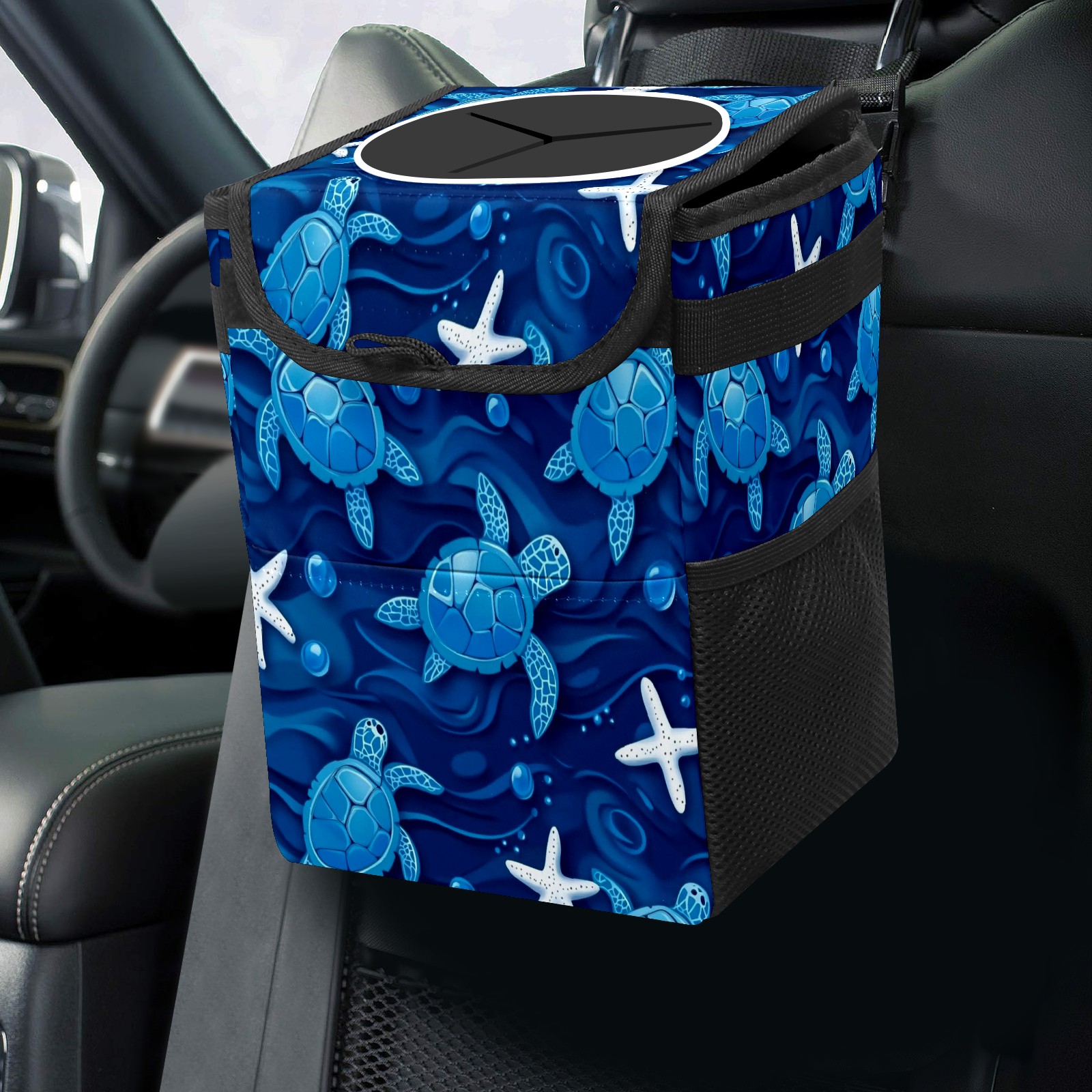 Car Trash Can with Lid, Small Portable Hanging Automotive Garbage Bin for Vehicles, Leakproof Waste Bag Container for SUV Truck Van Interior Auto Travel Road Trips(Blue Sea Turtles And White Starfish)