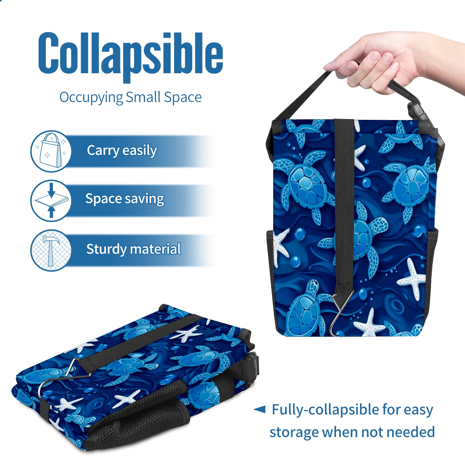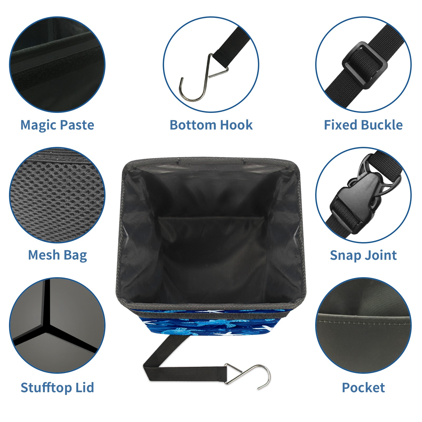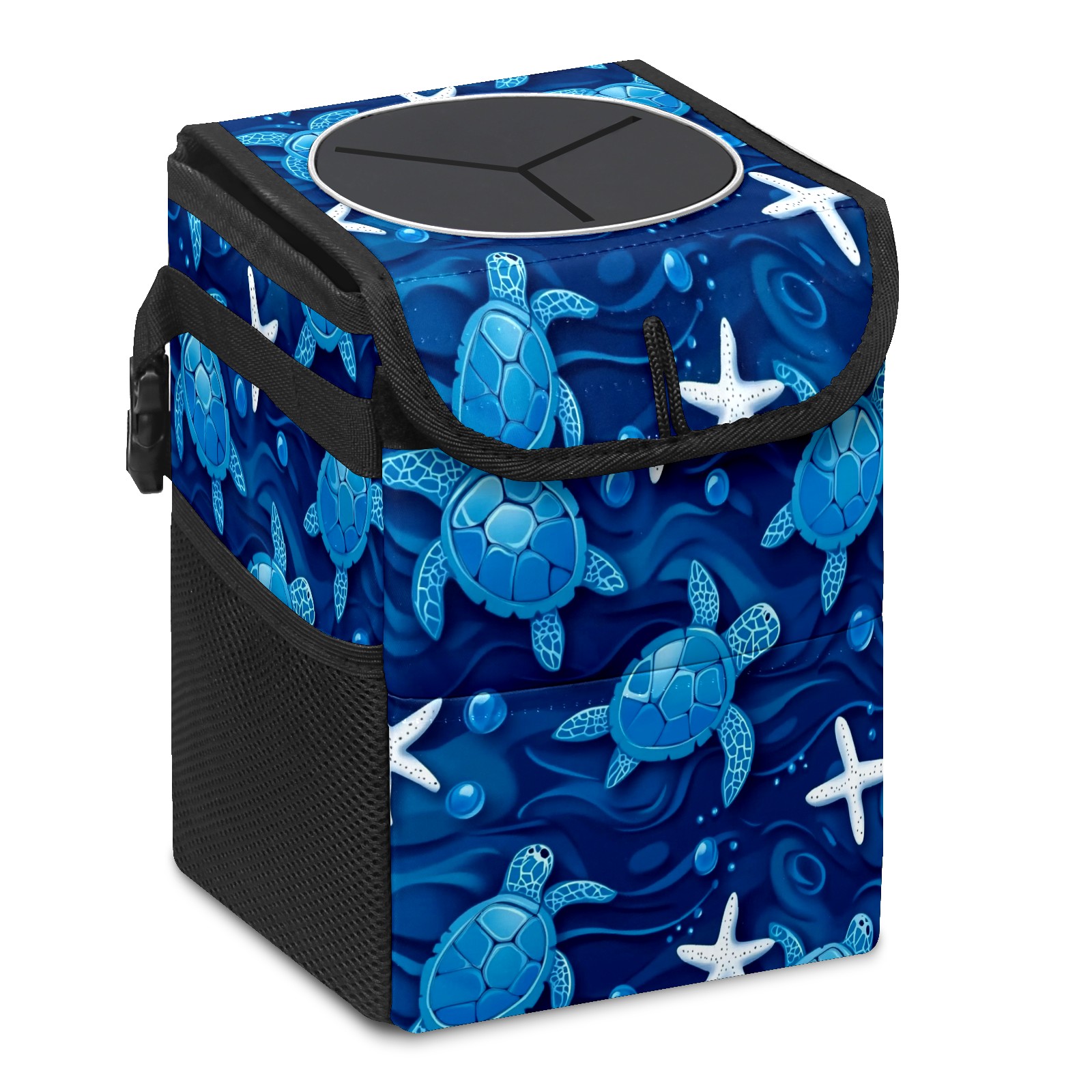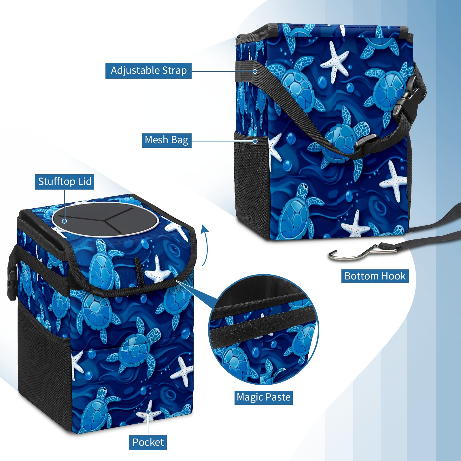 Car Trash Can with Lid, Small Portable Hanging Automotive Garbage Bin for Vehicles, Leakproof Waste Bag Container for SUV Truck Van Interior Auto Travel Road Trips(Blue Sea Turtles And White Starfish)