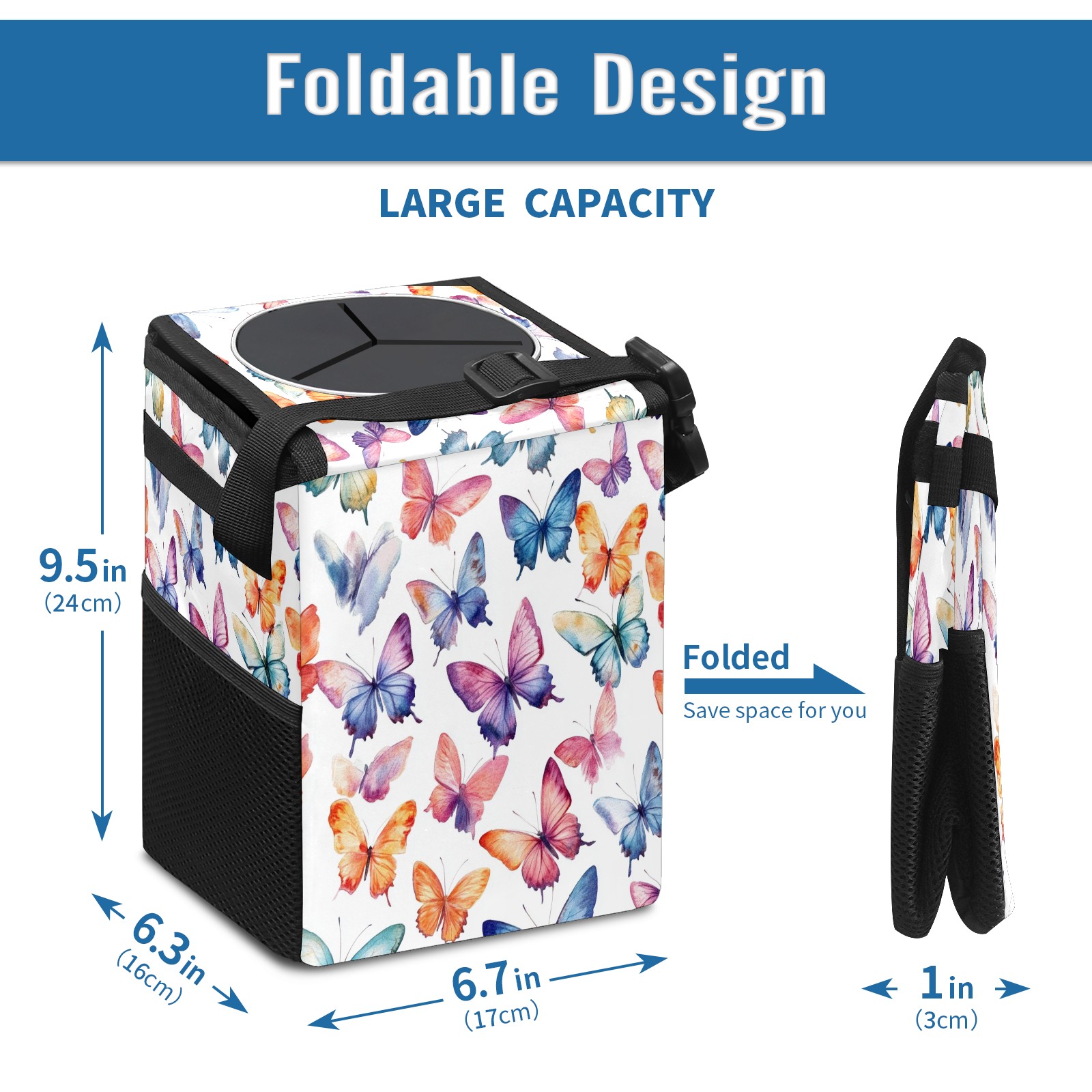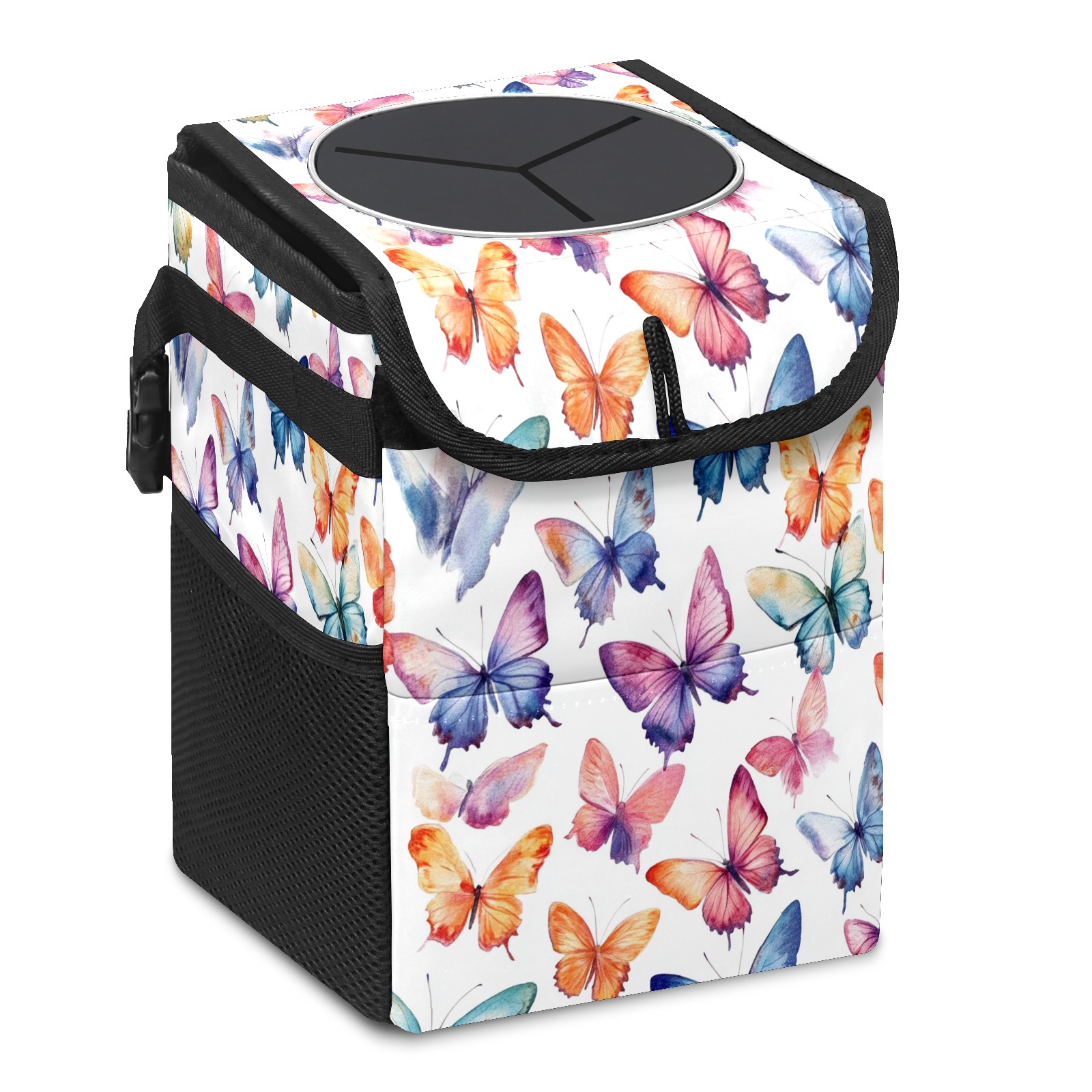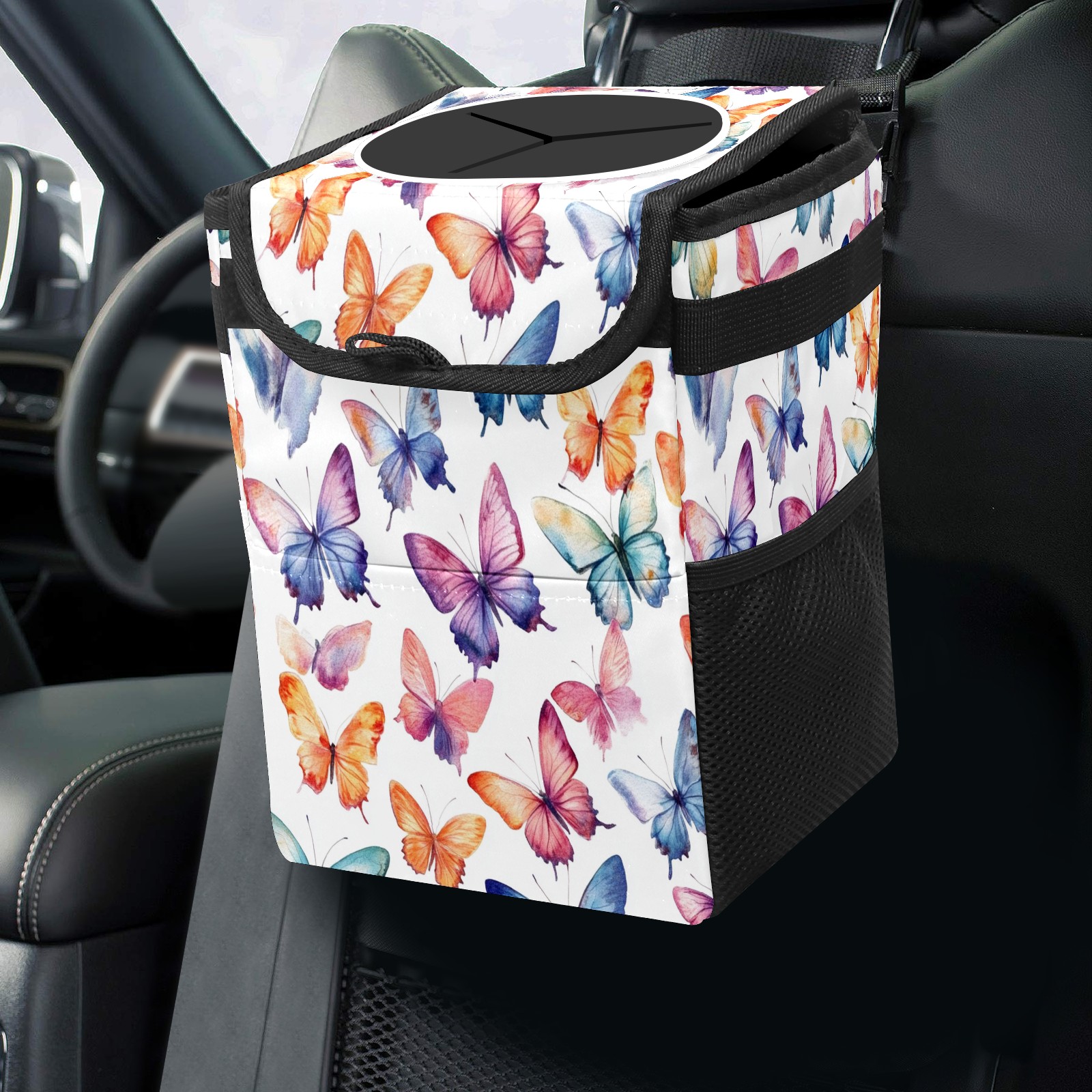 Car Trash Can with Lid, Small Portable Hanging Automotive Garbage Bin for Vehicles, Leakproof Waste Bag Container for SUV Truck Van Interior Auto Travel Road Trips(Colorful Watercolor Butterflies)