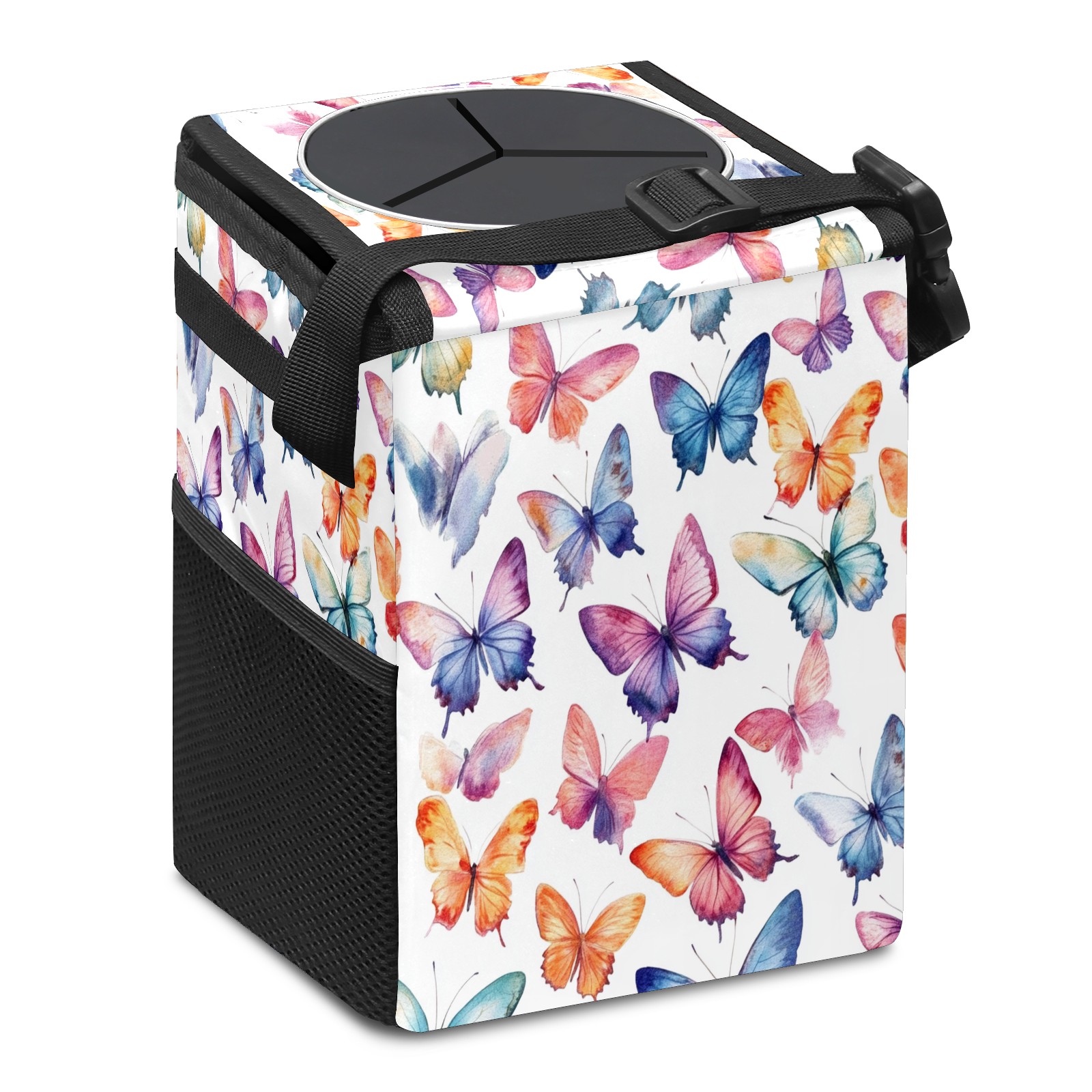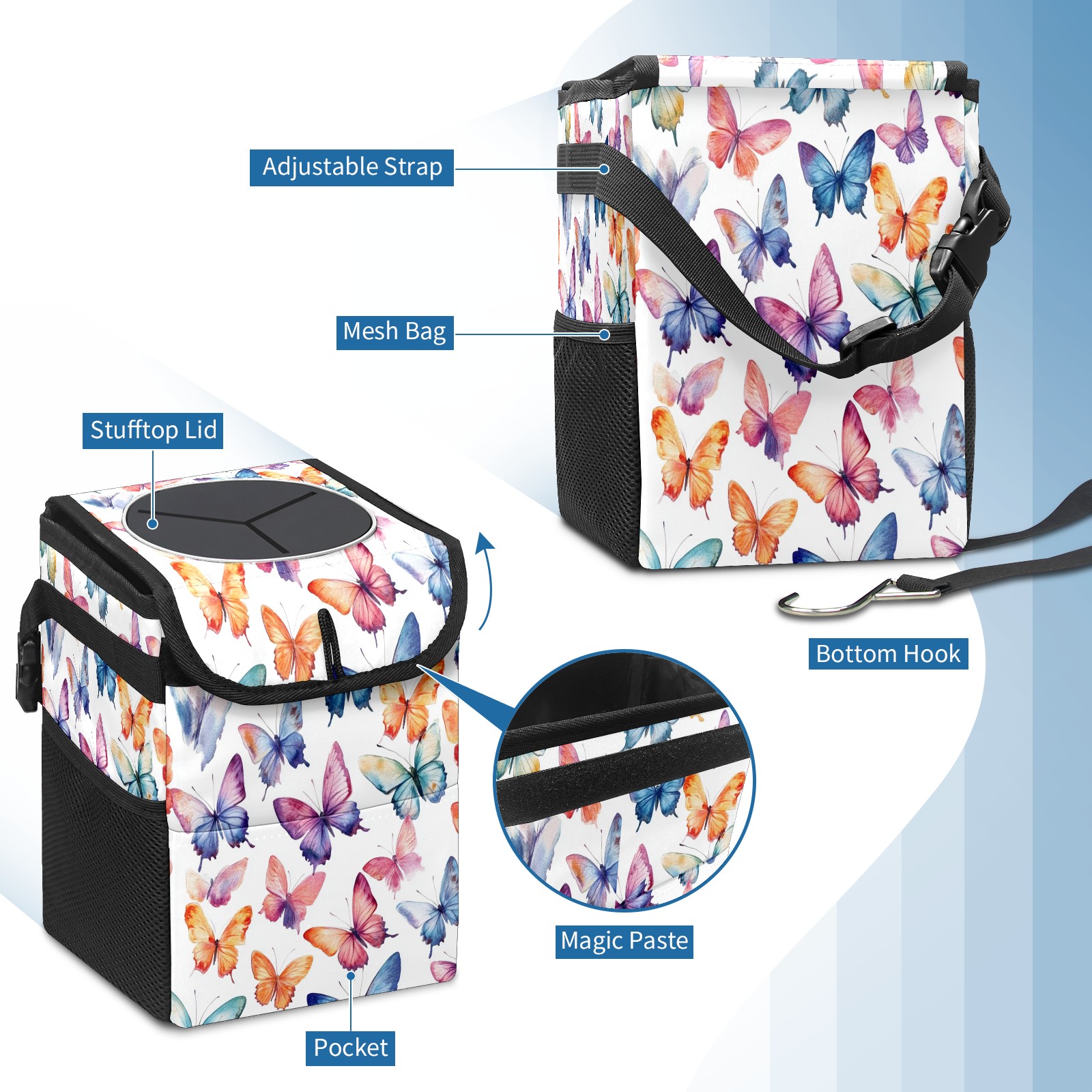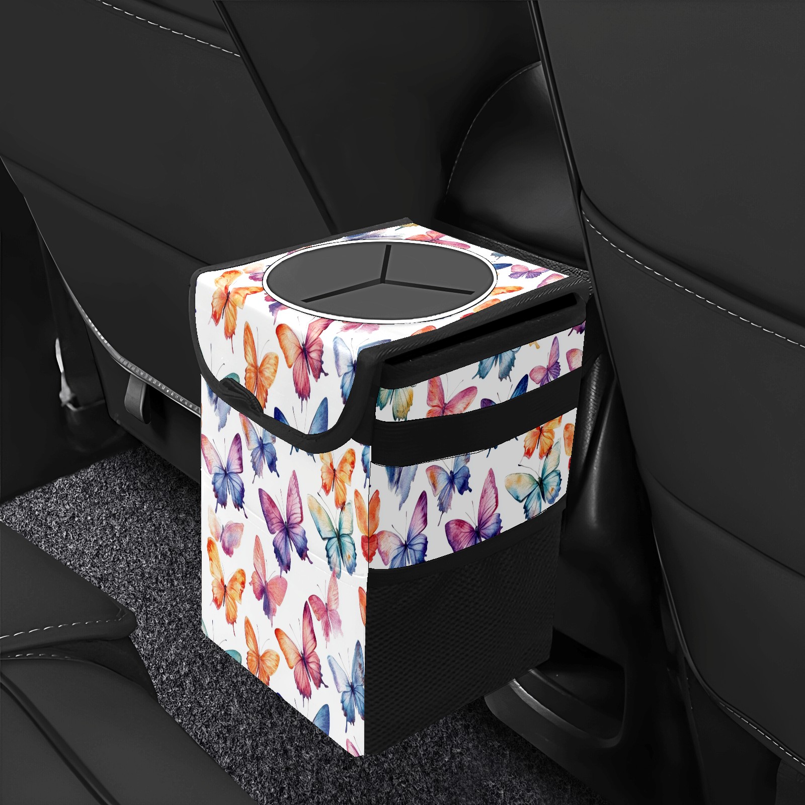 Car Trash Can with Lid, Small Portable Hanging Automotive Garbage Bin for Vehicles, Leakproof Waste Bag Container for SUV Truck Van Interior Auto Travel Road Trips(Colorful Watercolor Butterflies)