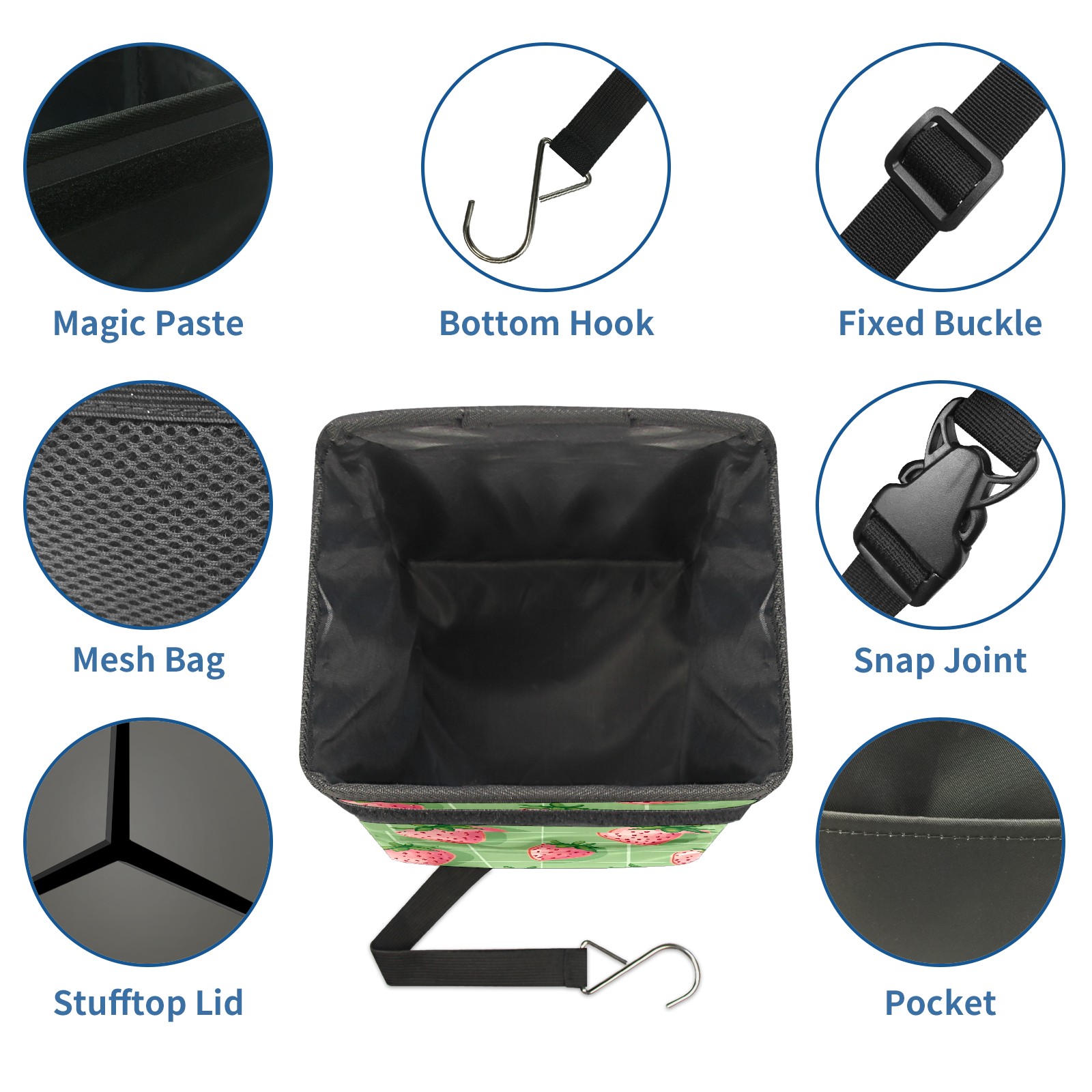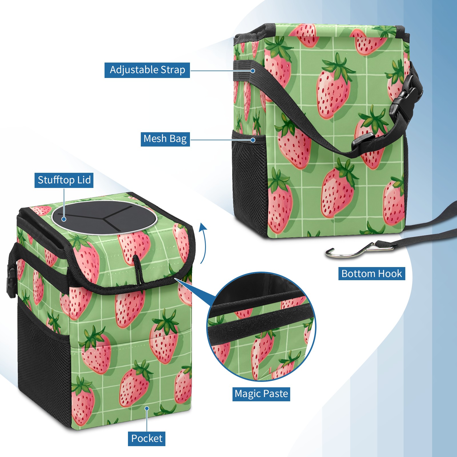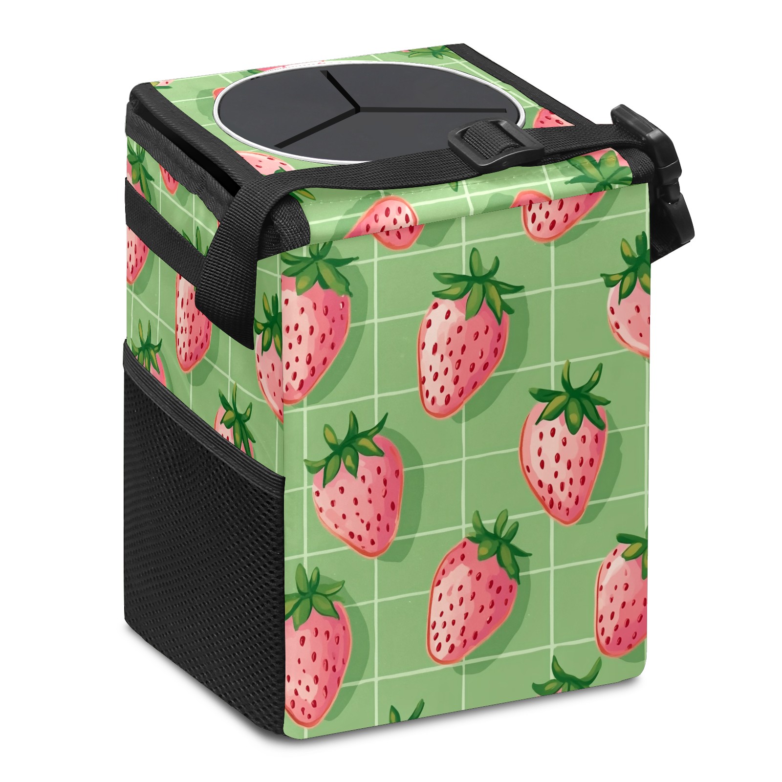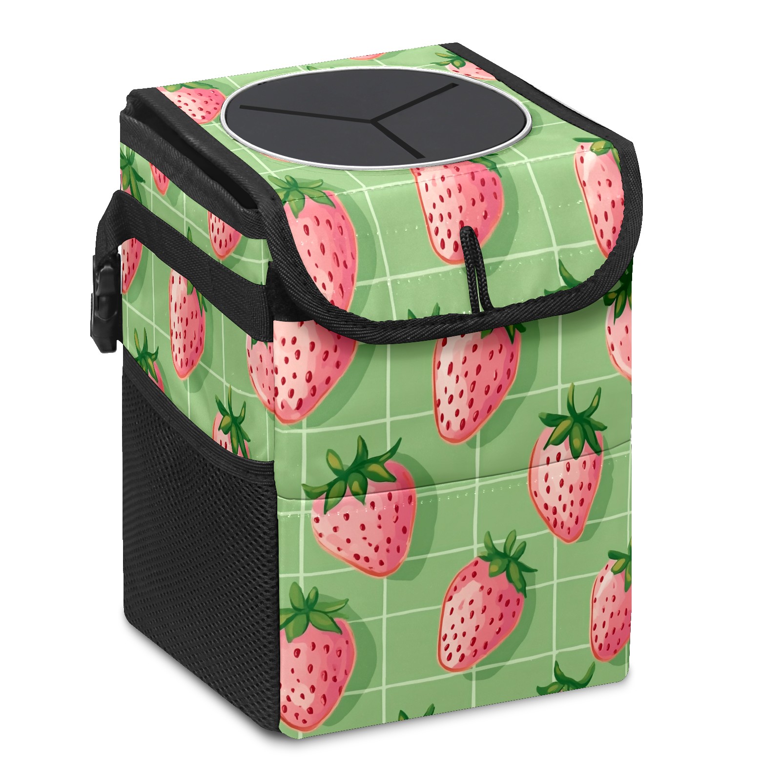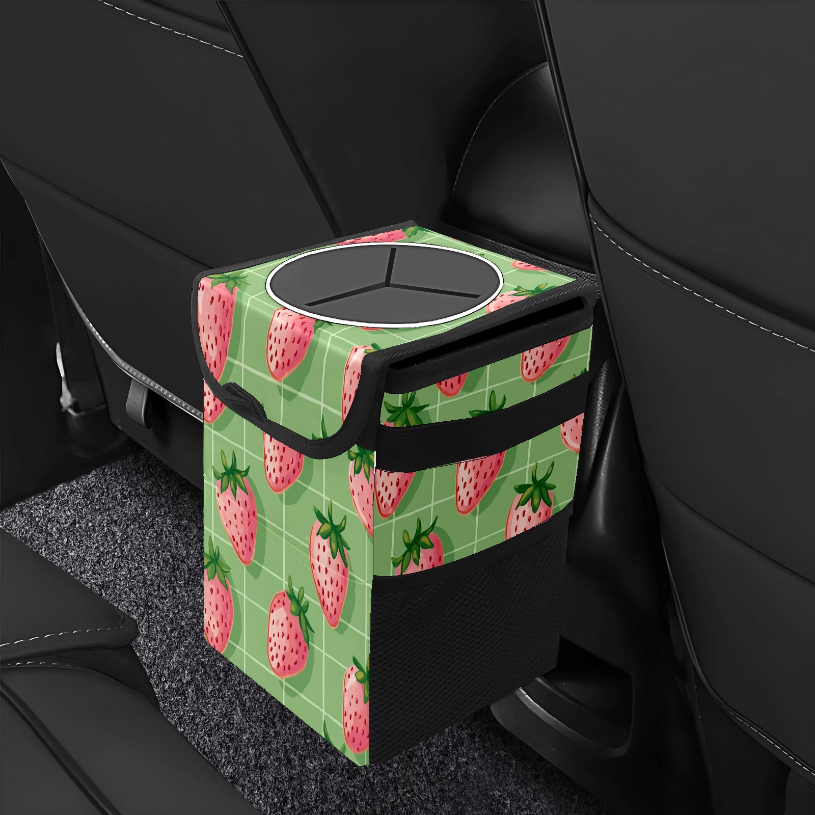 Car Trash Can with Lid, Small Portable Hanging Automotive Garbage Bin for Vehicles, Leakproof Waste Bag Container for SUV Truck Van Interior Auto Travel Road Trips(Pink Strawberries)
