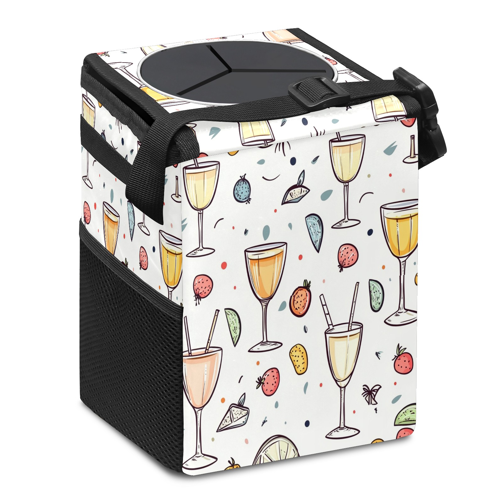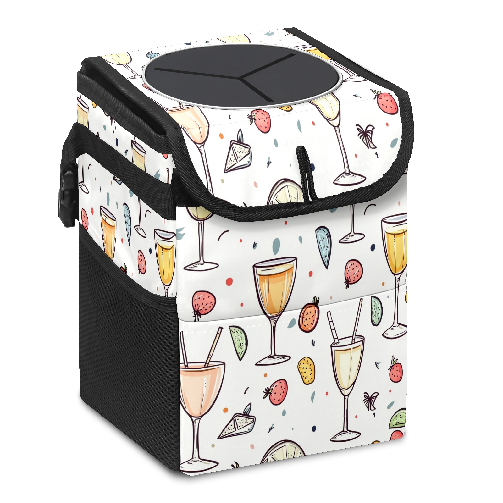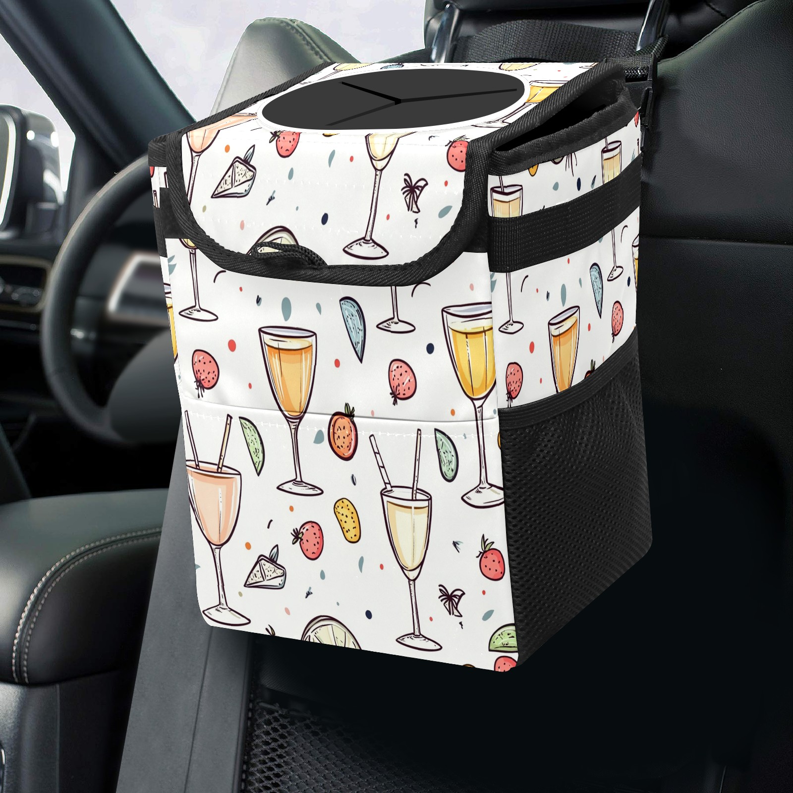 Car Trash Can with Lid, Small Portable Hanging Automotive Garbage Bin for Vehicles, Leakproof Waste Bag Container for SUV Truck Van Interior Auto Travel Road Trips(Champagne Glasses Pattern)