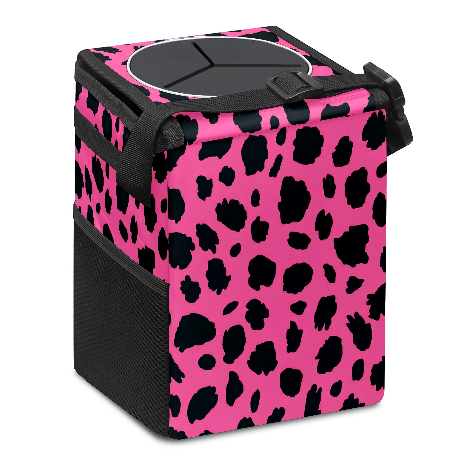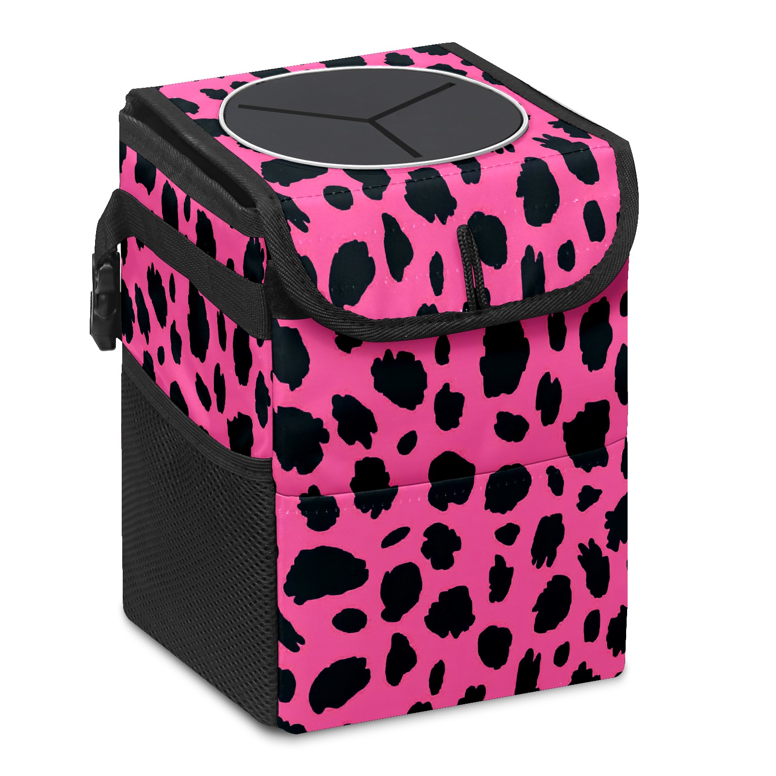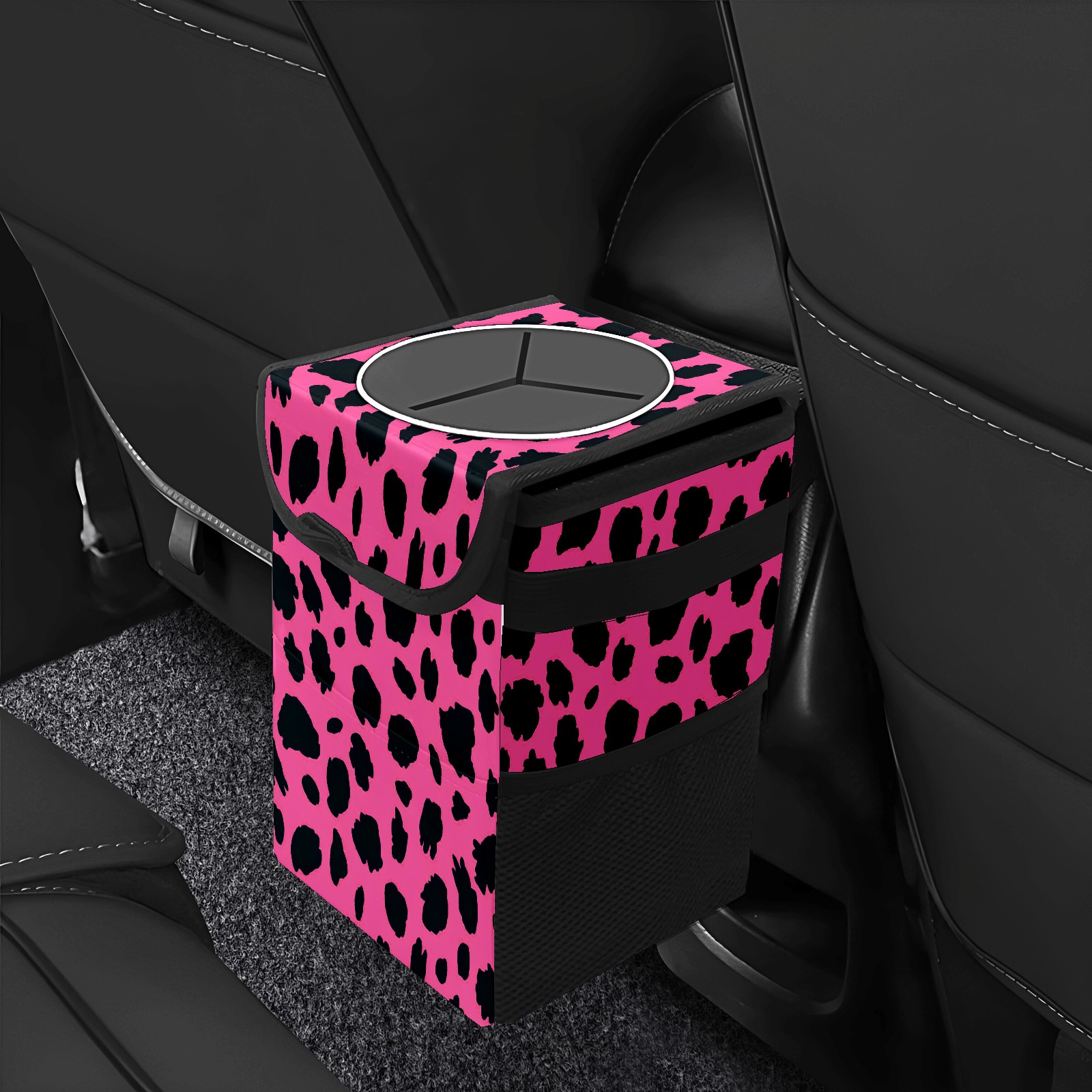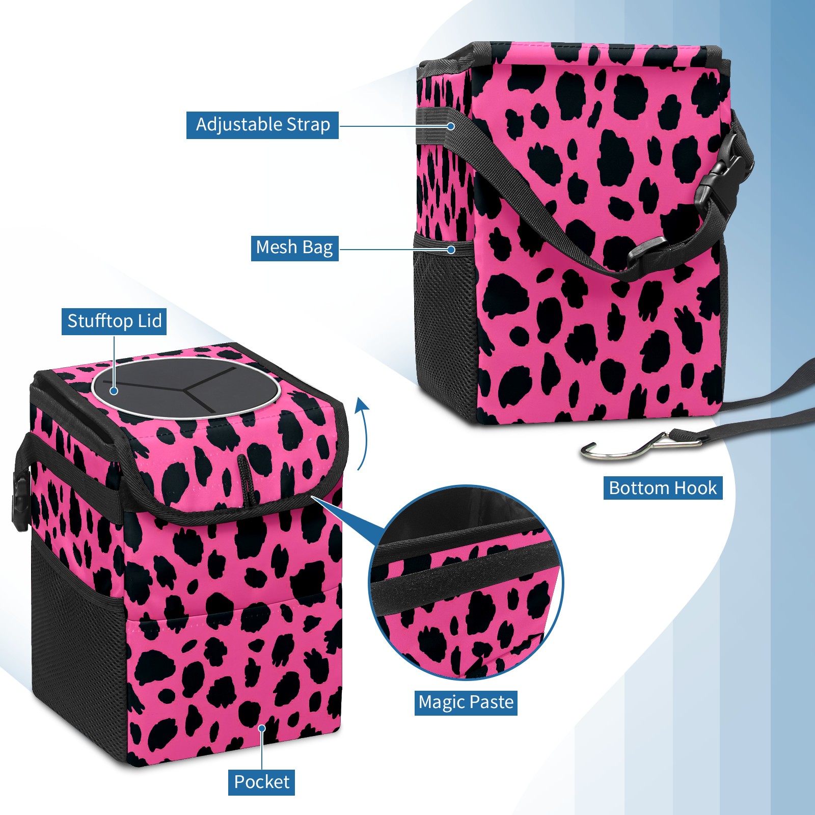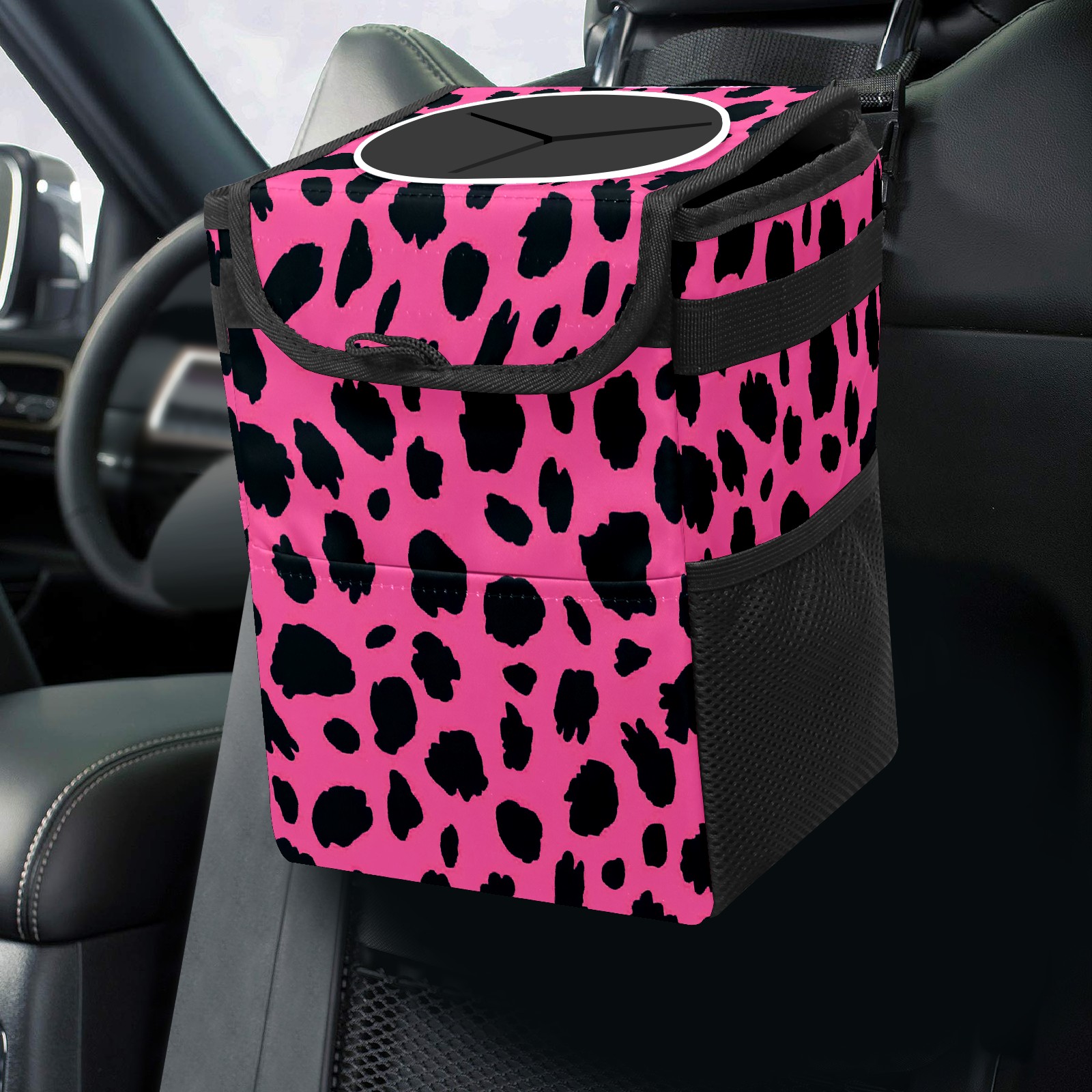 Car Trash Can with Lid, Small Portable Hanging Automotive Garbage Bin for Vehicles, Leakproof Waste Bag Container for SUV Truck Van Interior Auto Travel Road Trips(Pink Leopard Print)