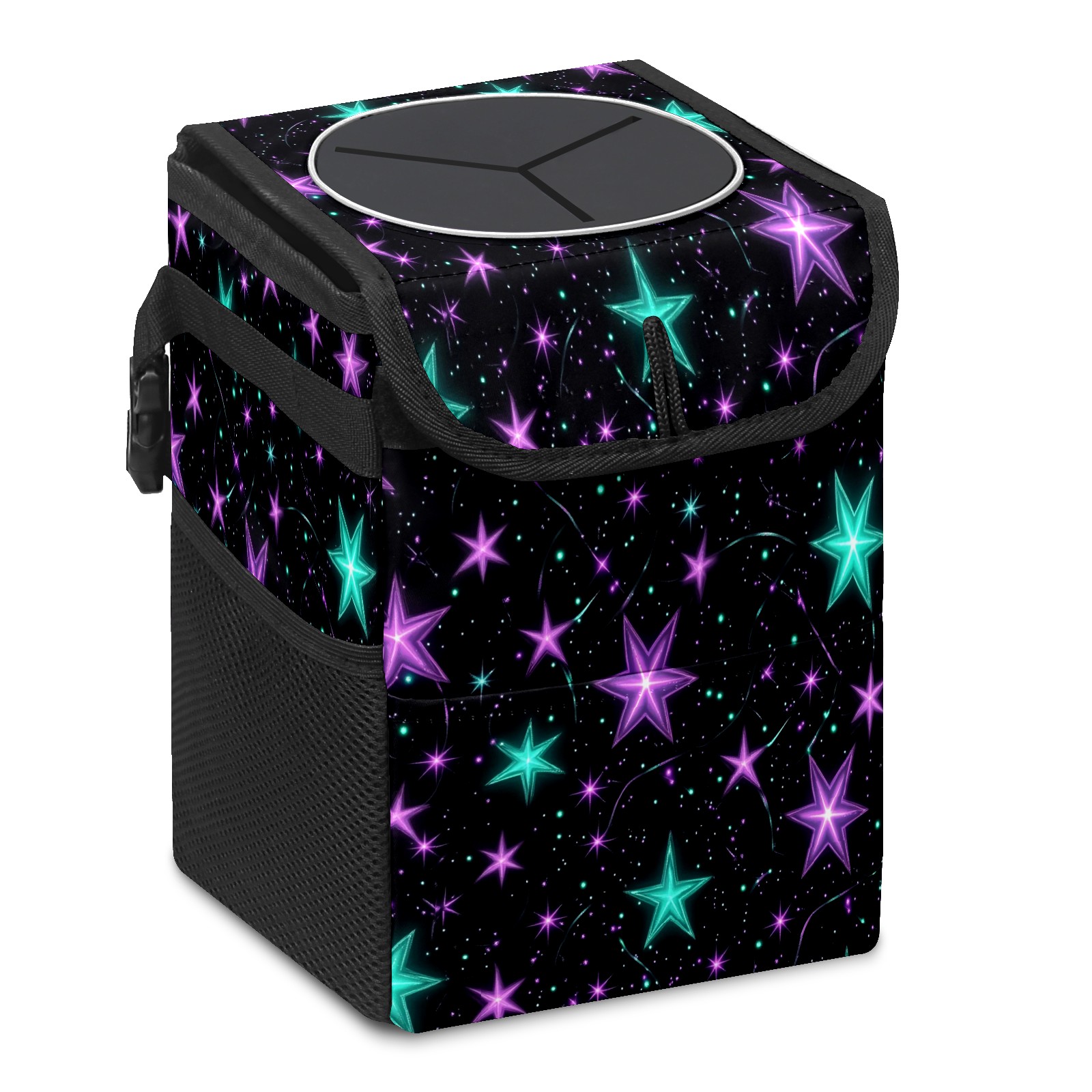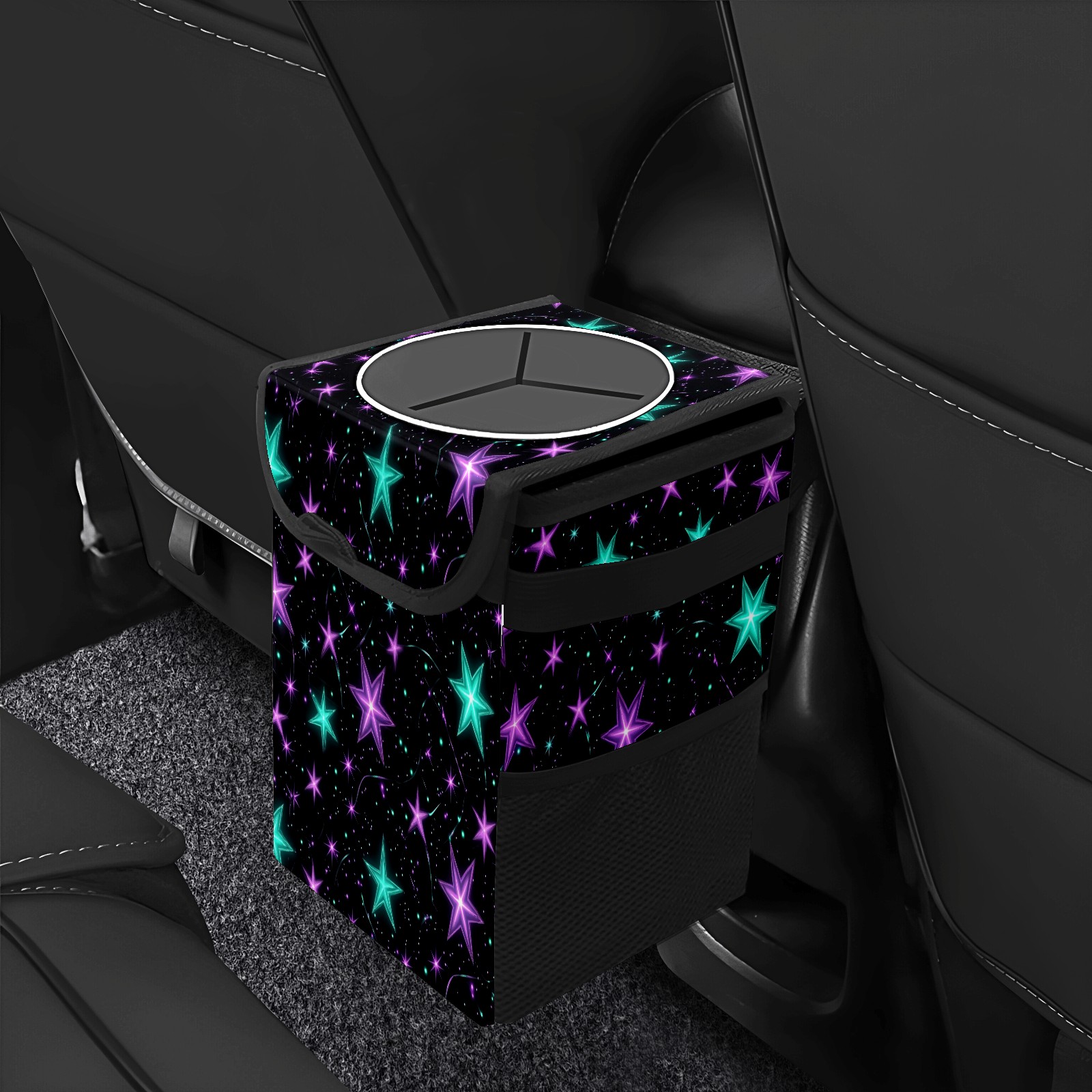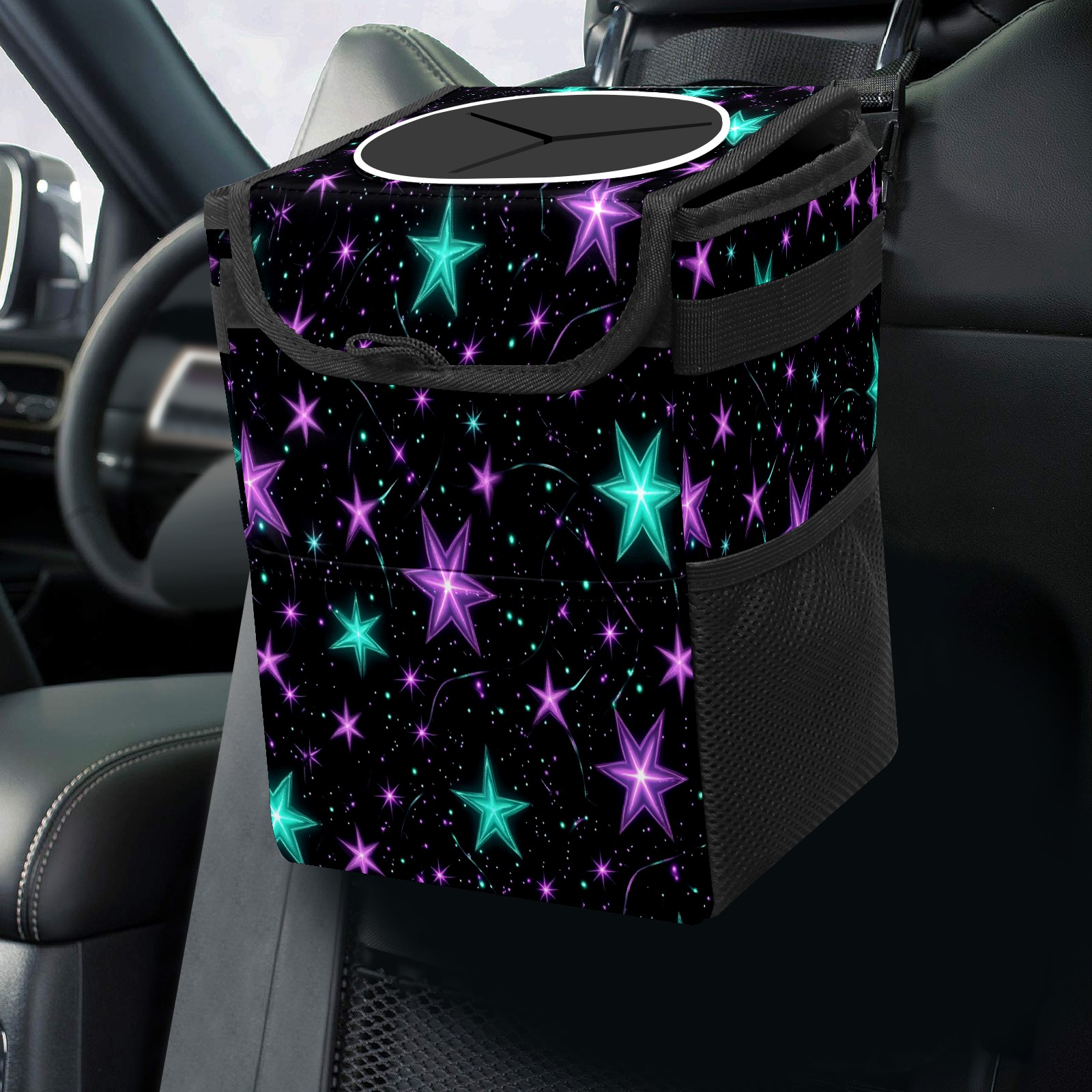 Car Trash Can with Lid, Small Portable Hanging Automotive Garbage Bin for Vehicles, Leakproof Waste Bag Container for SUV Truck Van Interior Auto Travel Road Trips(Glowing Purple And Teal Stars)