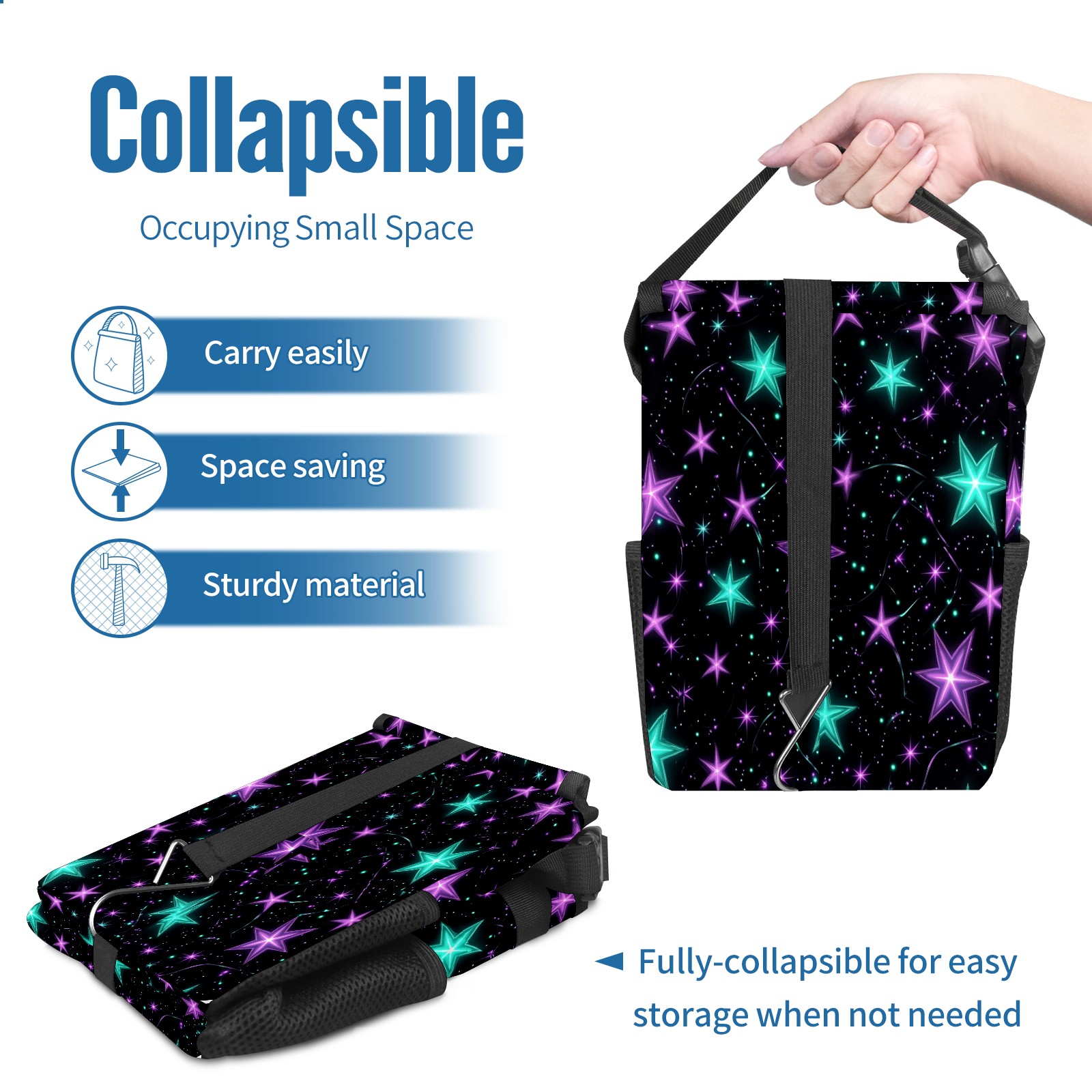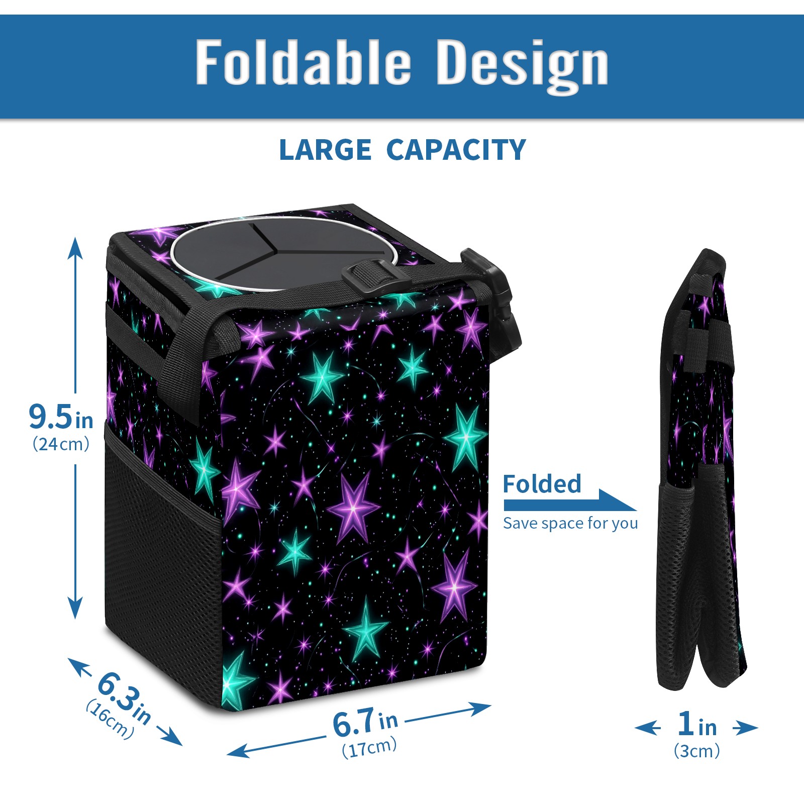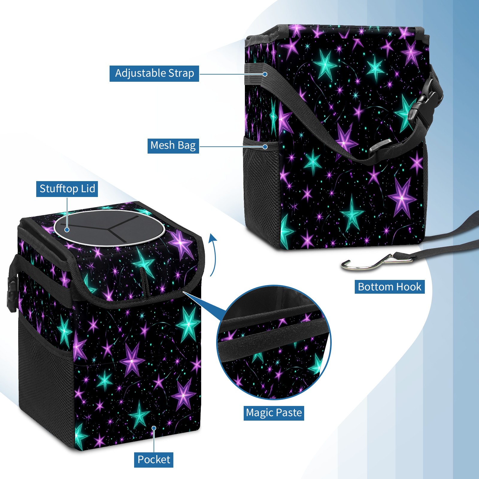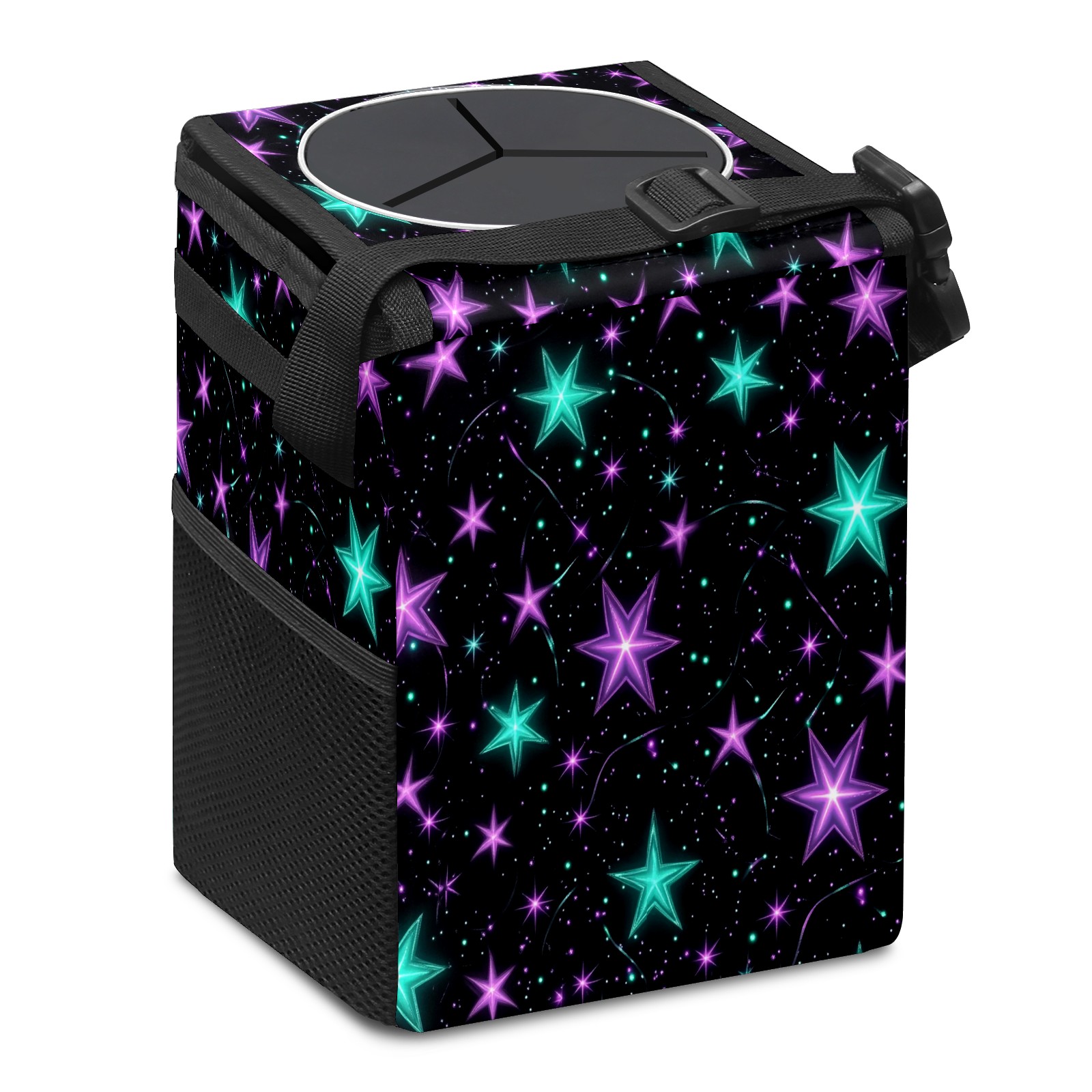 Car Trash Can with Lid, Small Portable Hanging Automotive Garbage Bin for Vehicles, Leakproof Waste Bag Container for SUV Truck Van Interior Auto Travel Road Trips(Glowing Purple And Teal Stars)