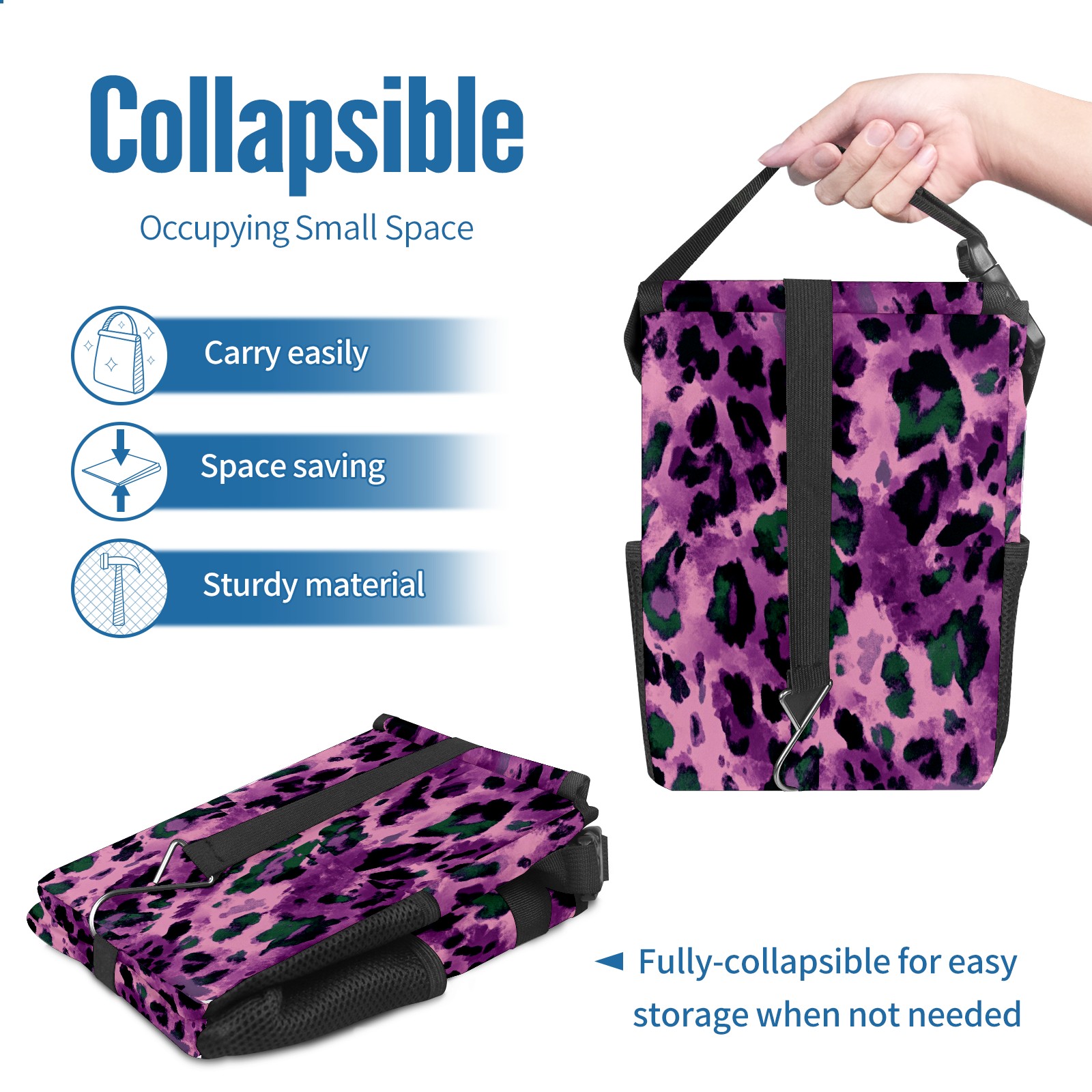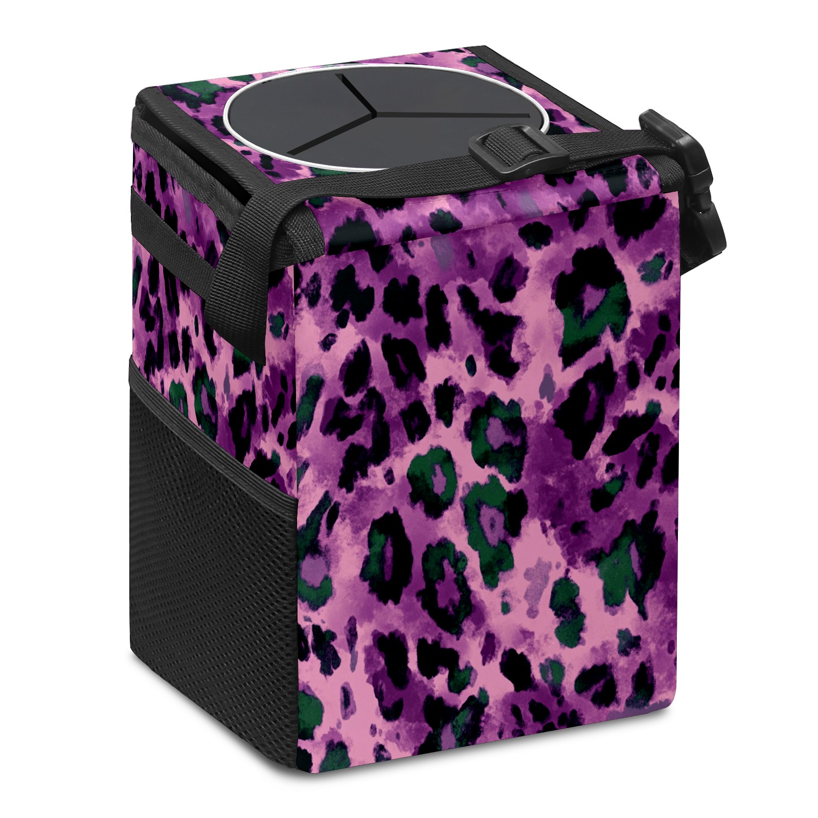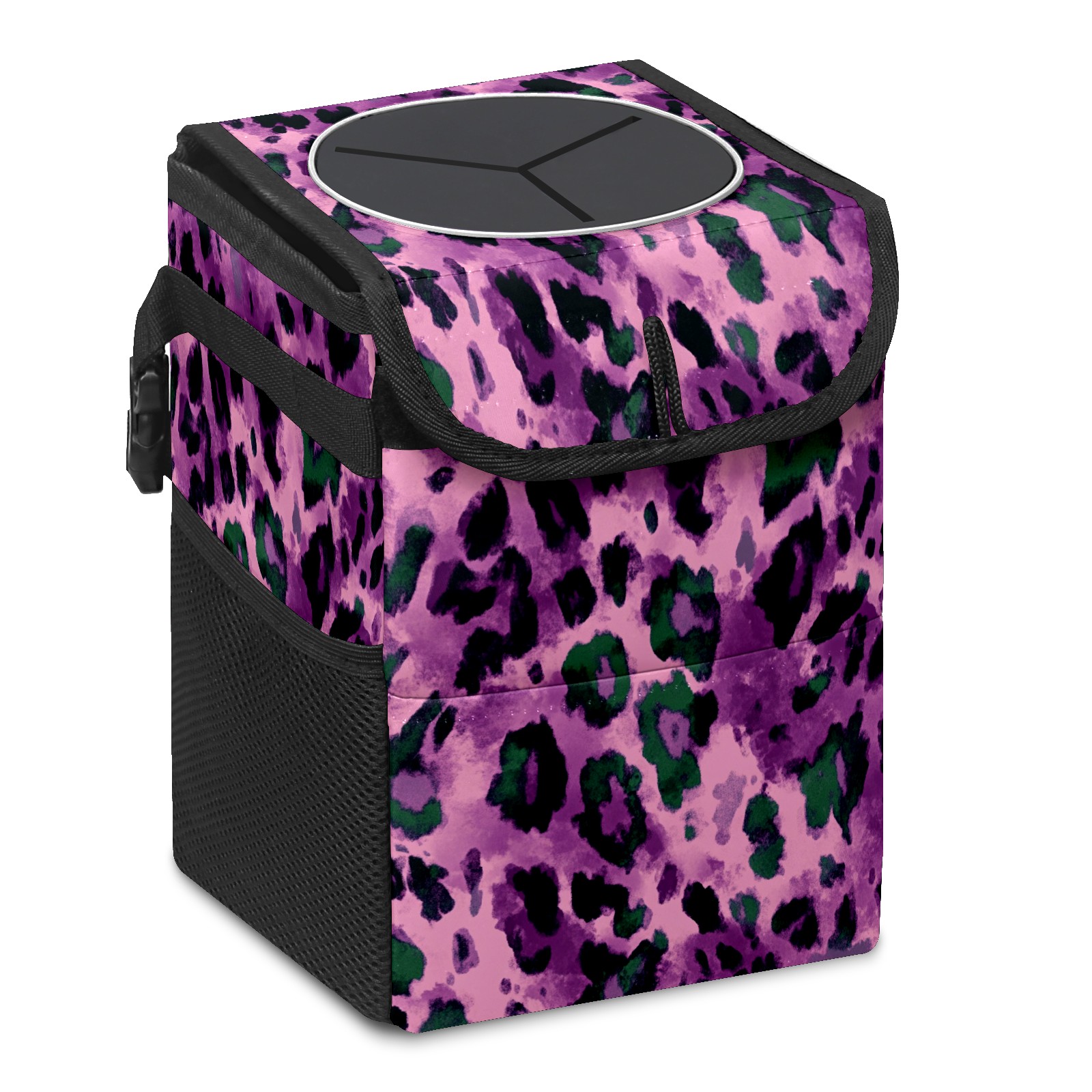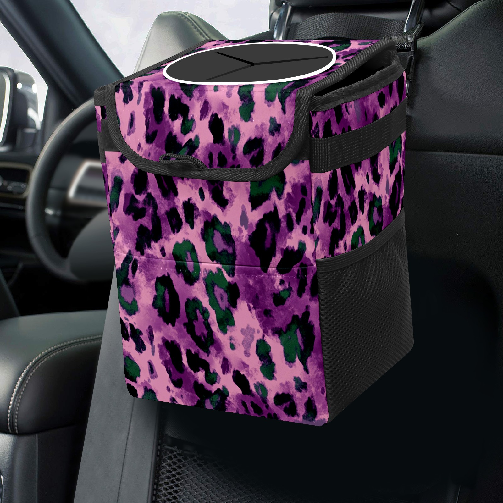Car Trash Can with Lid, Small Portable Hanging Automotive Garbage Bin for Vehicles, Leakproof Waste Bag Container for SUV Truck Van Interior Auto Travel Road Trips(Purple And Green Leopard Print)