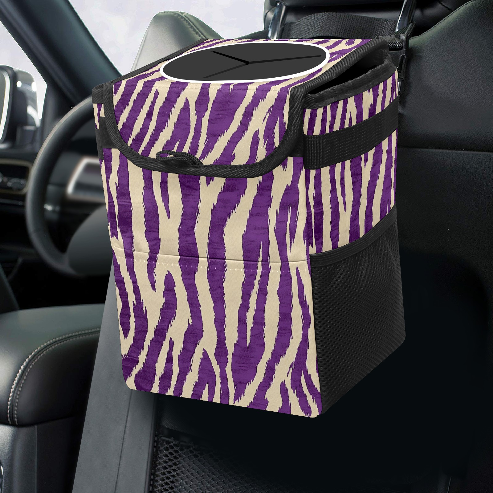 Car Trash Can with Lid, Small Portable Hanging Automotive Garbage Bin for Vehicles, Leakproof Waste Bag Container for SUV Truck Van Interior Auto Travel Road Trips(Tiger Stripes)
