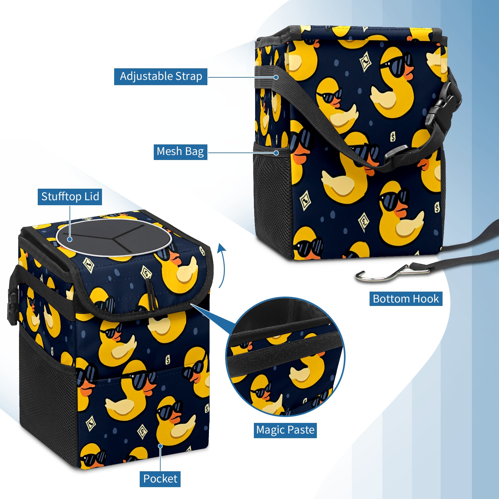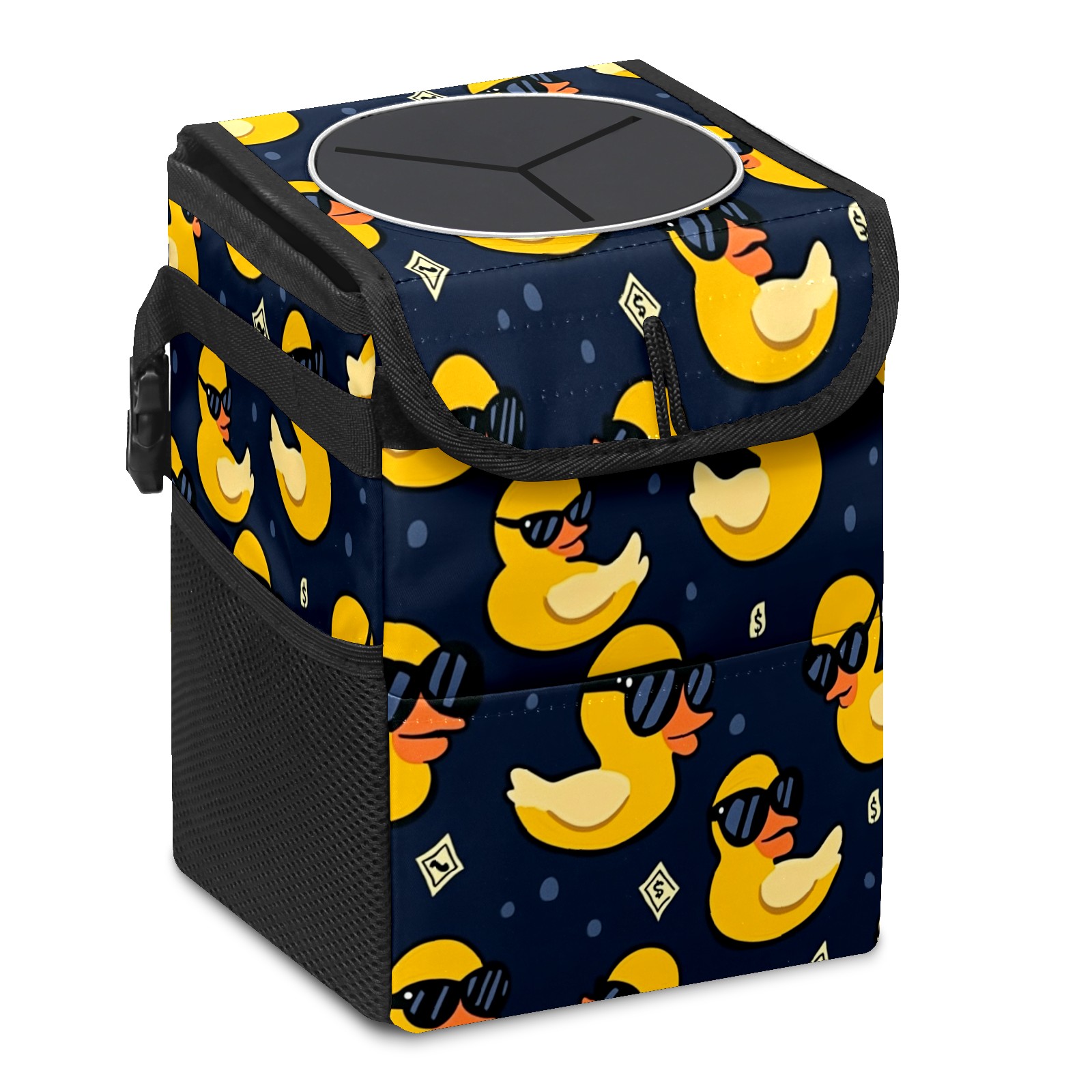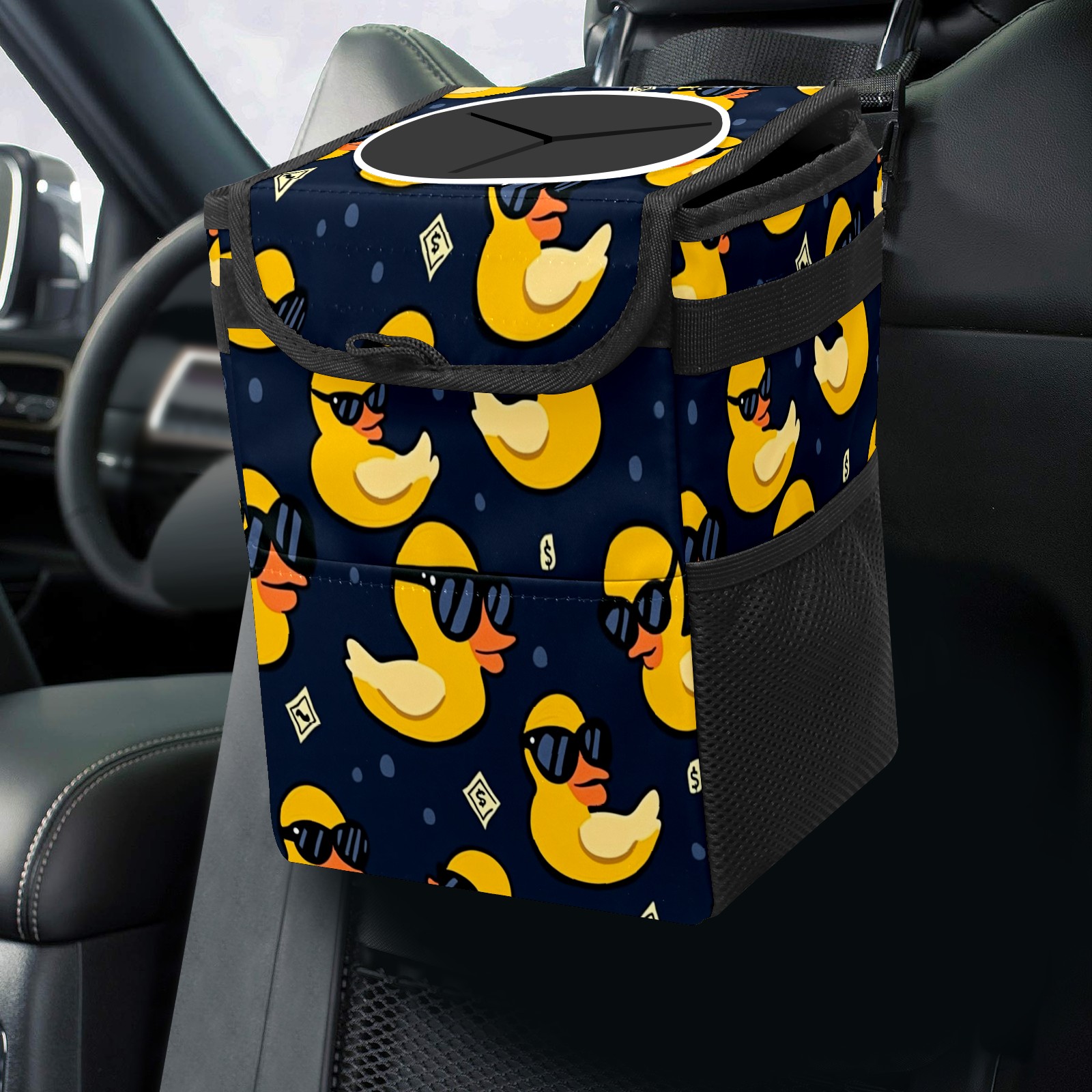 Car Trash Can with Lid, Small Portable Hanging Automotive Garbage Bin for Vehicles, Leakproof Waste Bag Container for SUV Truck Van Interior Auto Travel Road Trips(Yellow Ducks)