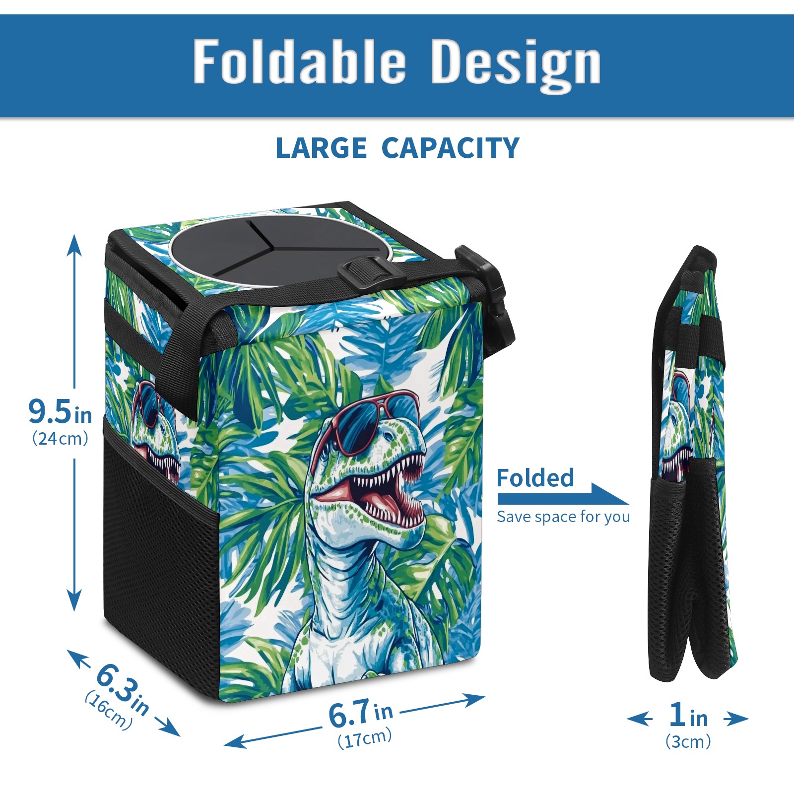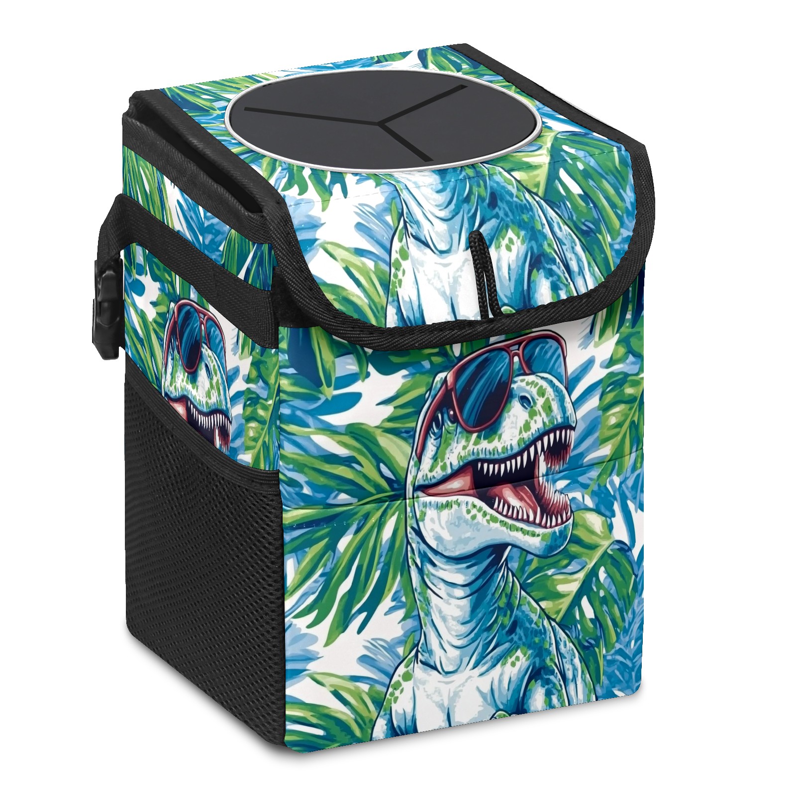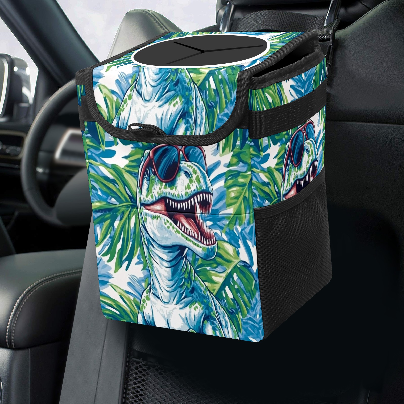 Car Trash Can with Lid, Small Portable Hanging Automotive Garbage Bin for Vehicles, Leakproof Waste Bag Container for SUV Truck Van Interior Auto Travel Road Trips(T-rex Wearing Sunglasses)