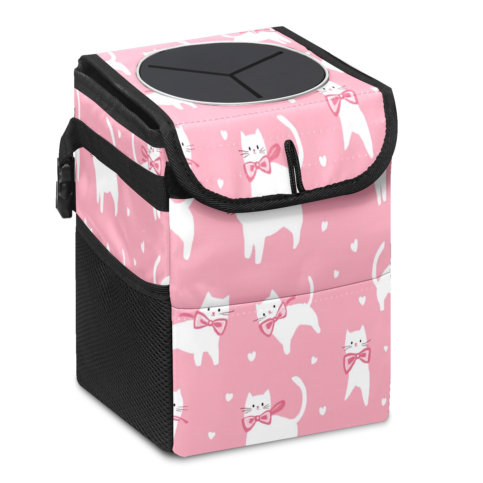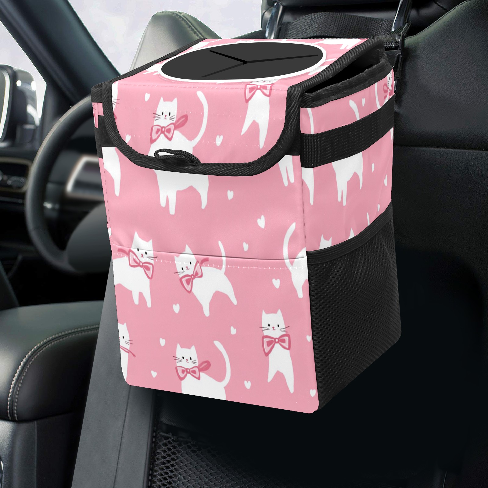Car Trash Can with Lid, Small Portable Hanging Automotive Garbage Bin for Vehicles, Leakproof Waste Bag Container for SUV Truck Van Interior Auto Travel Road Trips(White Cats And Bows)