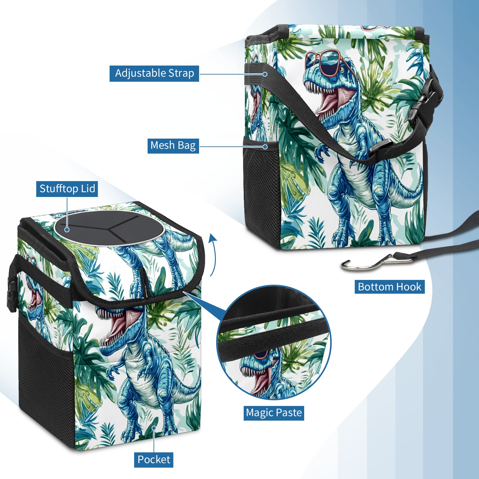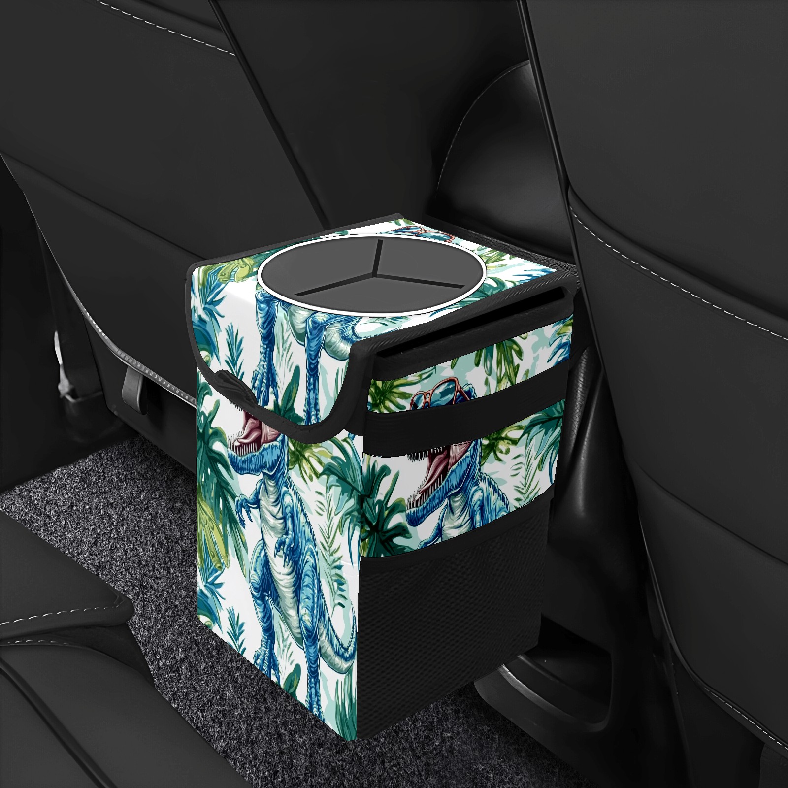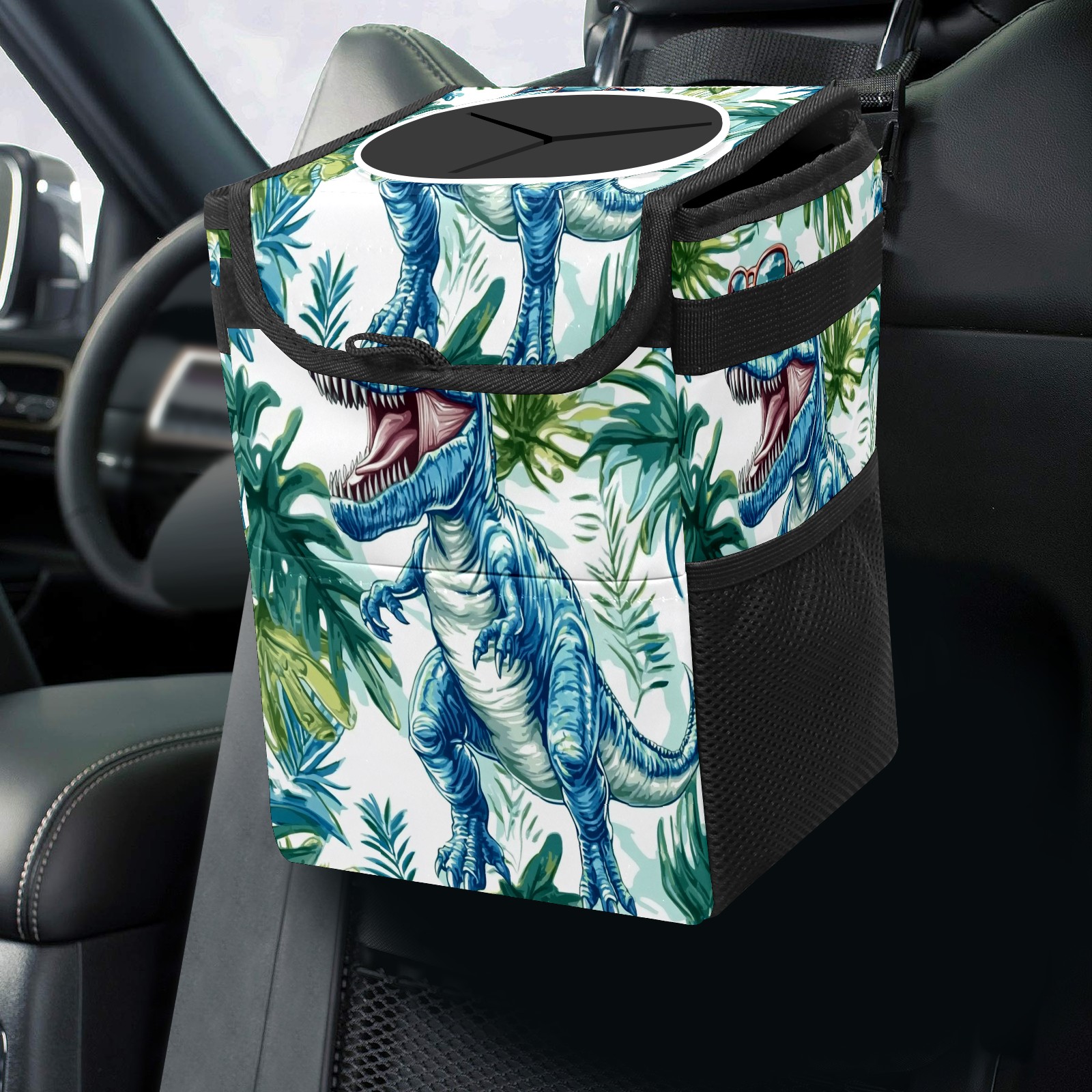 Car Trash Can with Lid, Small Portable Hanging Automotive Garbage Bin for Vehicles, Leakproof Waste Bag Container for SUV Truck Van Interior Auto Travel Road Trips(T-Rex)