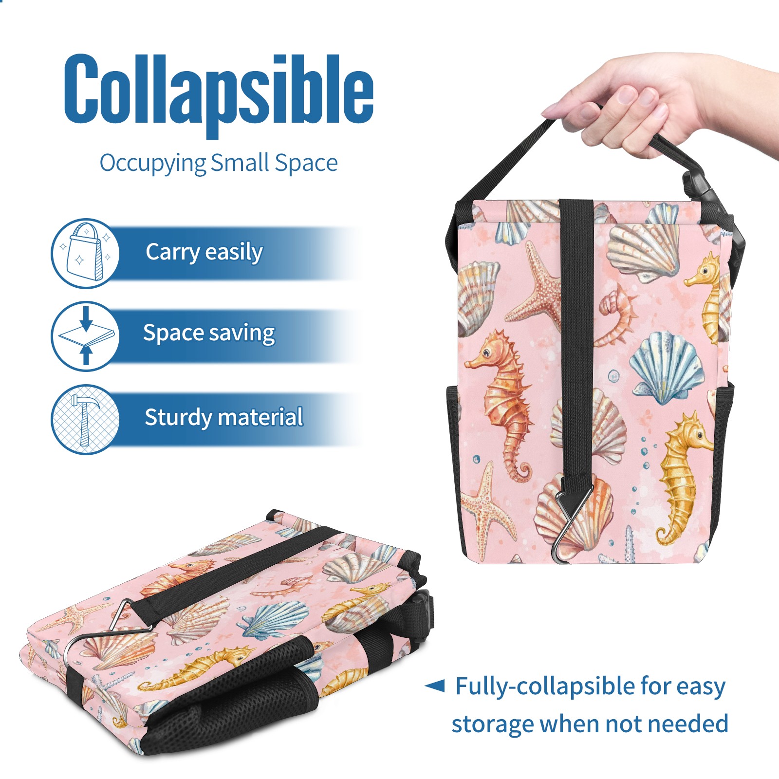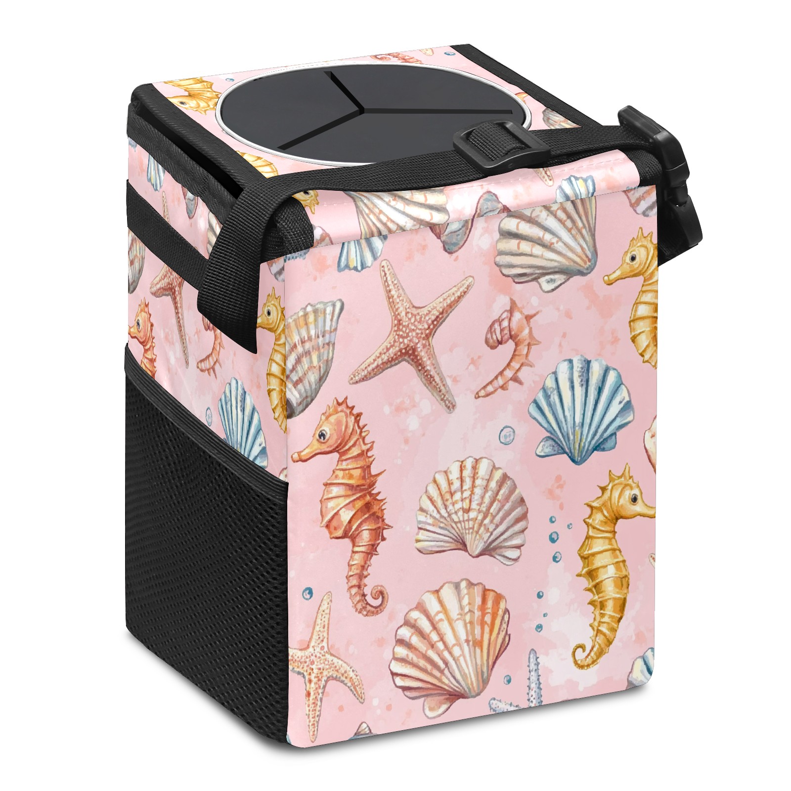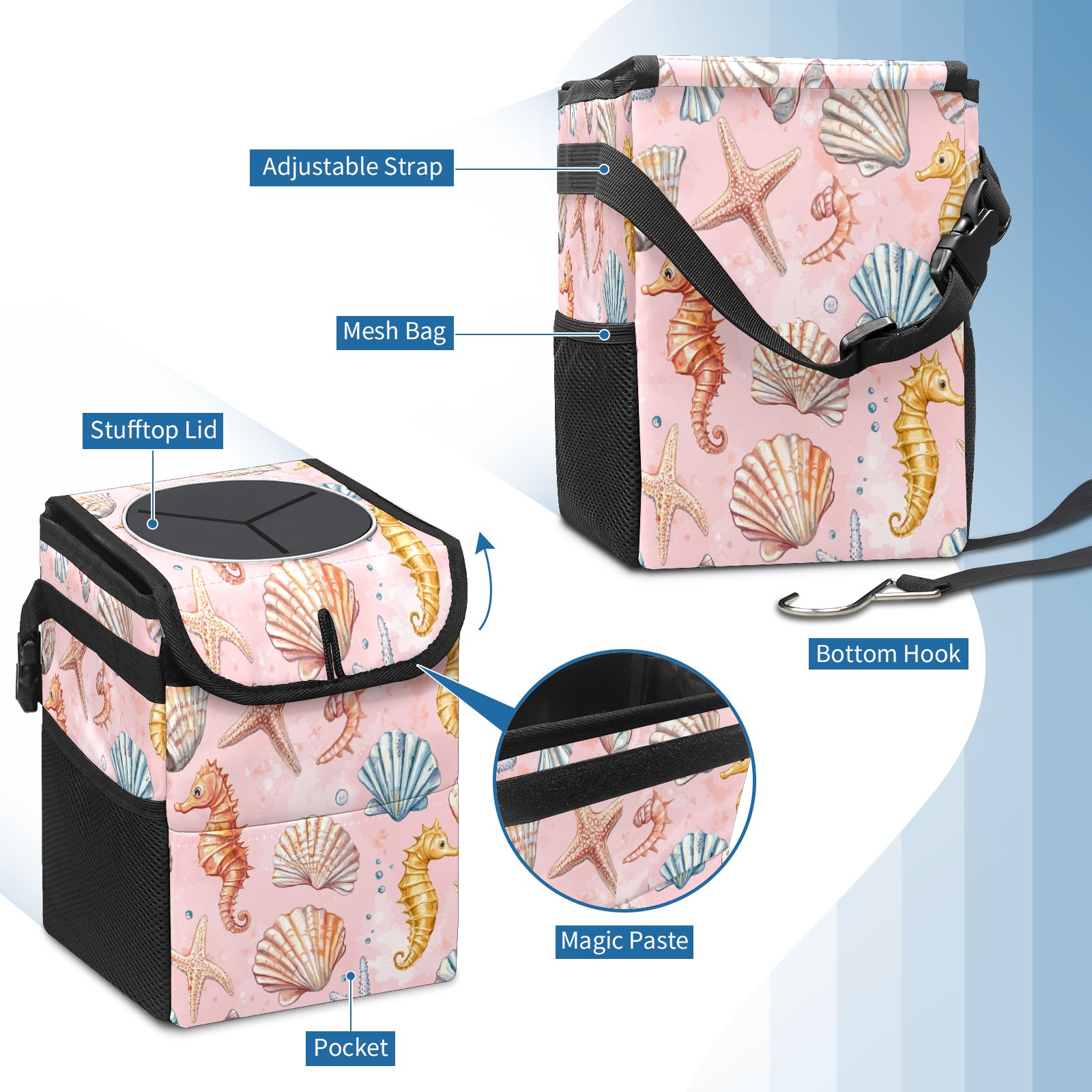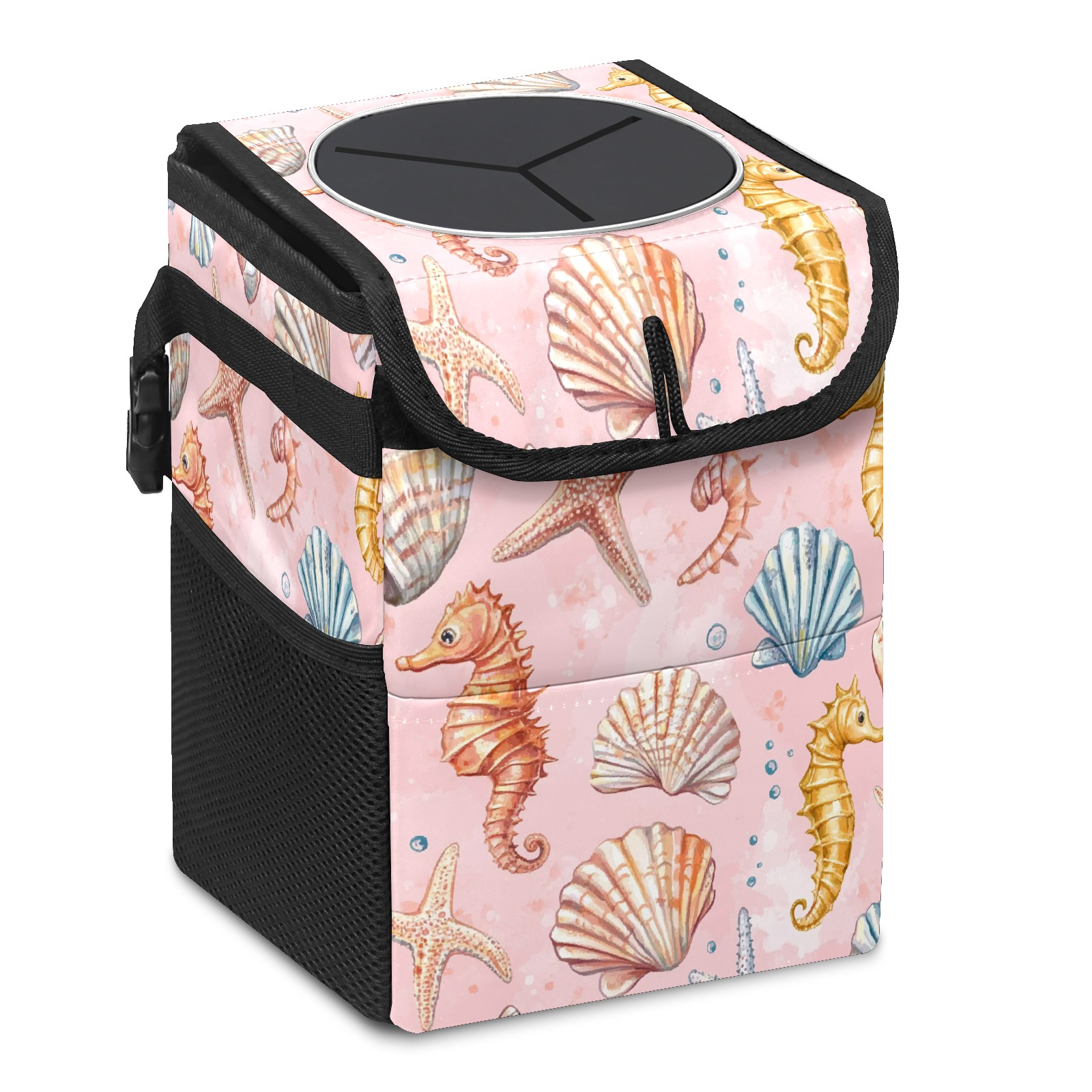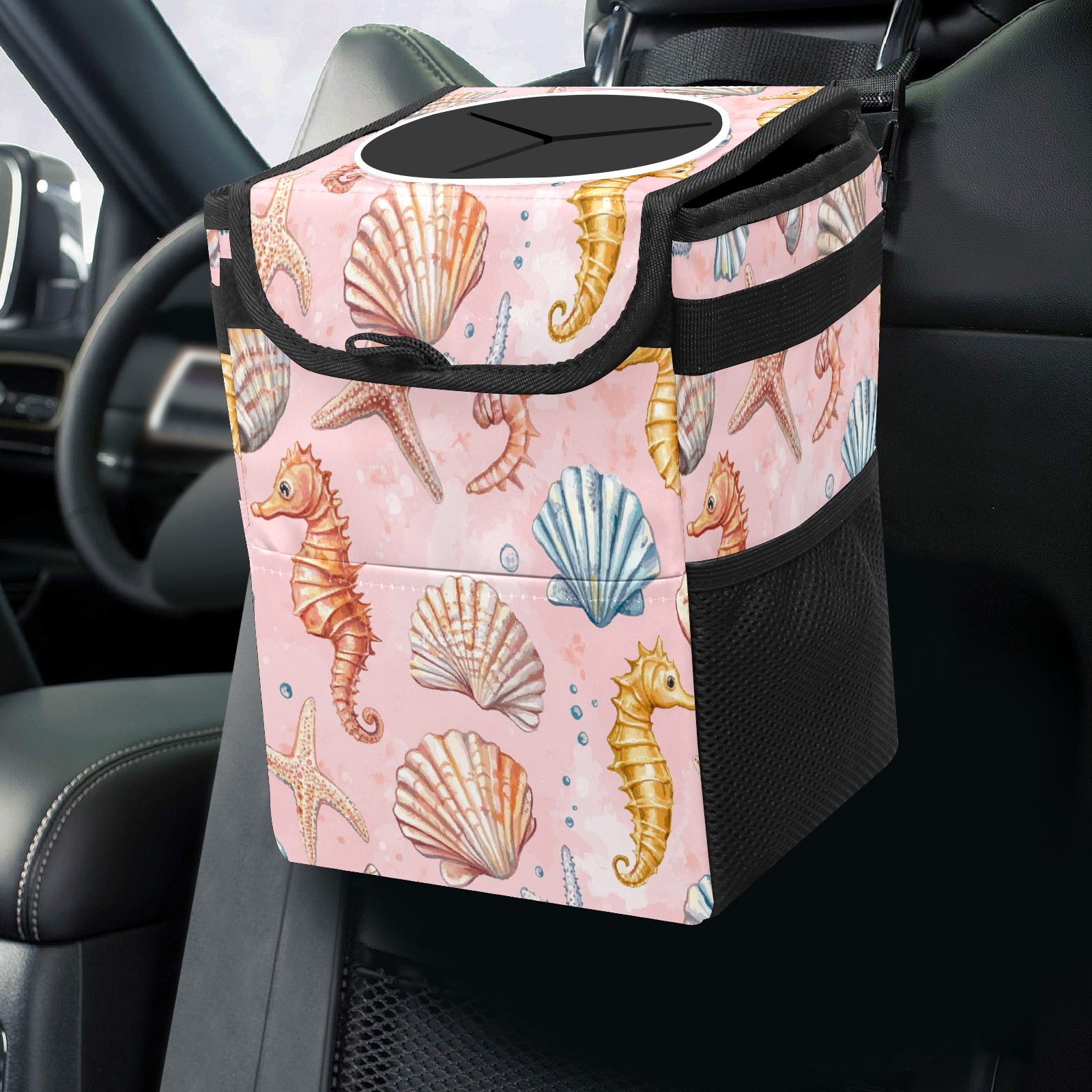 Car Trash Can with Lid, Small Portable Hanging Automotive Garbage Bin for Vehicles, Leakproof Waste Bag Container for SUV Truck Van Interior Auto Travel Road Trips(Seashells And Starfish)