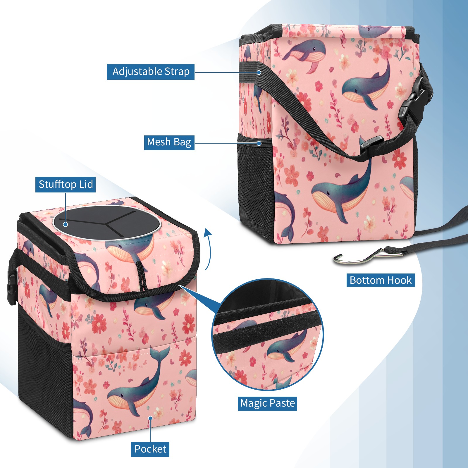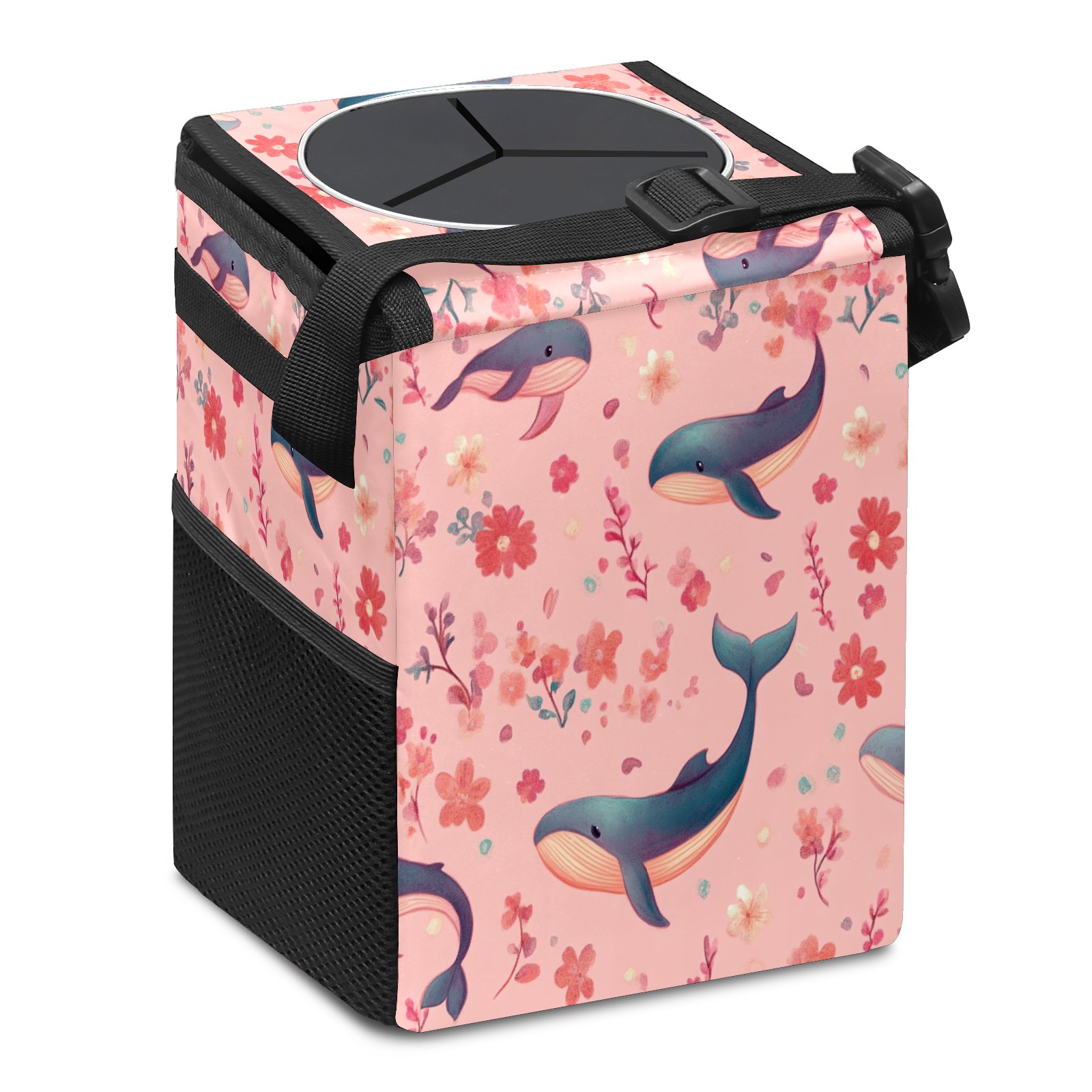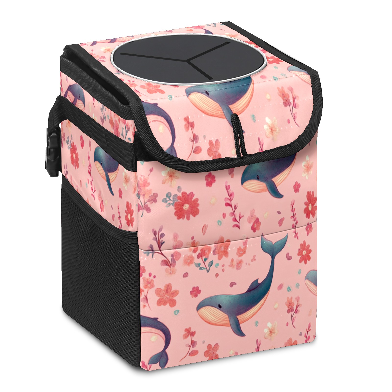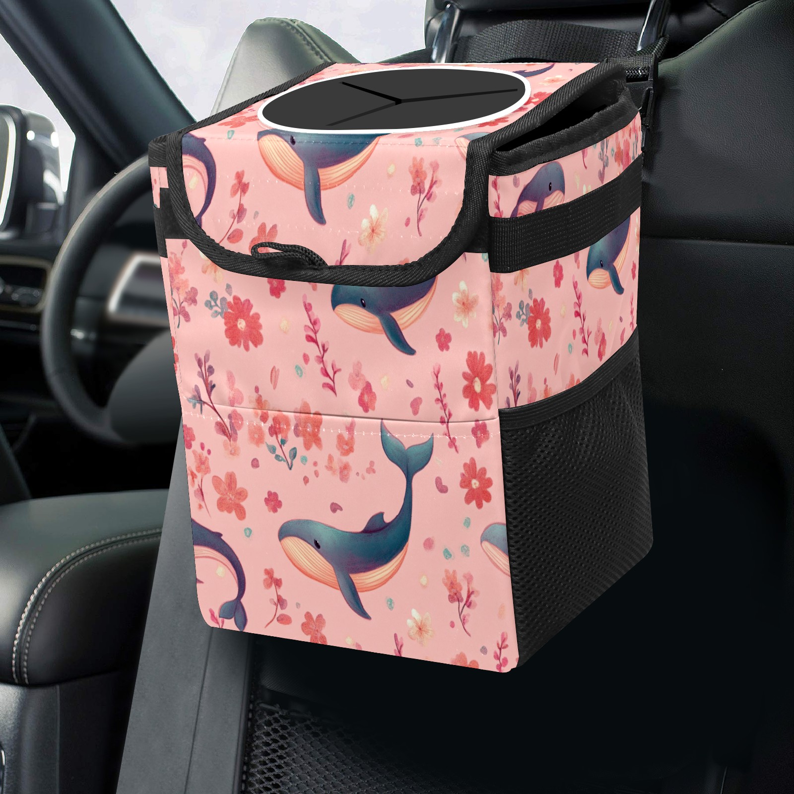 Car Trash Can with Lid, Small Portable Hanging Automotive Garbage Bin for Vehicles, Leakproof Waste Bag Container for SUV Truck Van Interior Auto Travel Road Trips(Pastel-pink Whale)
