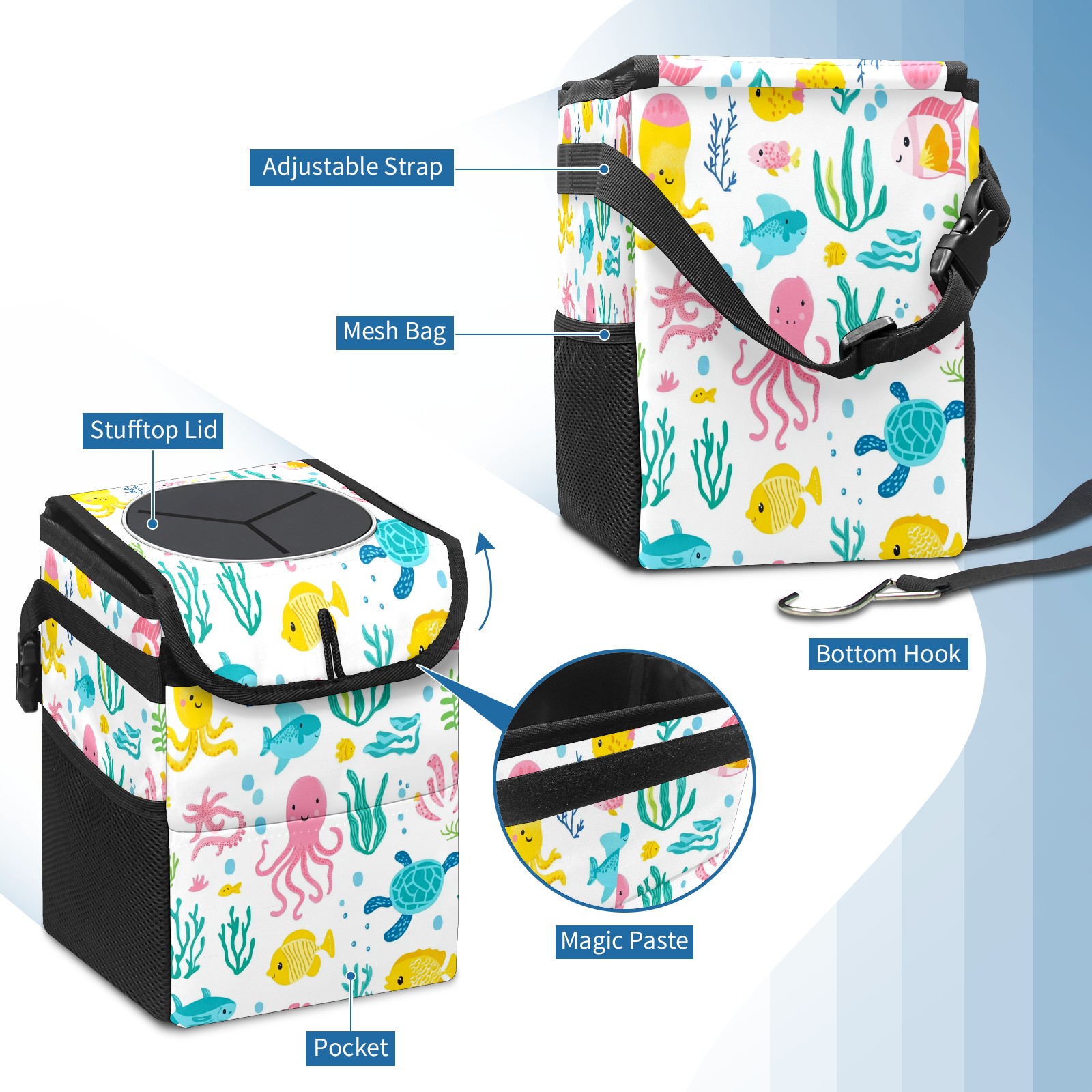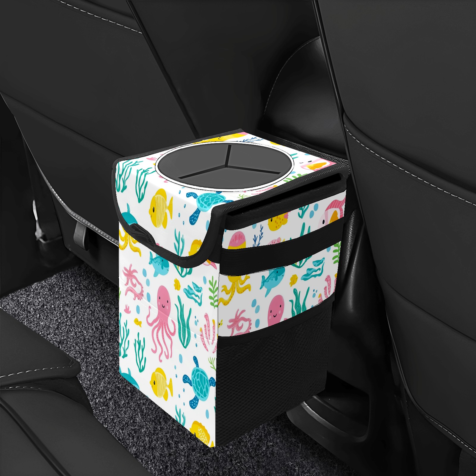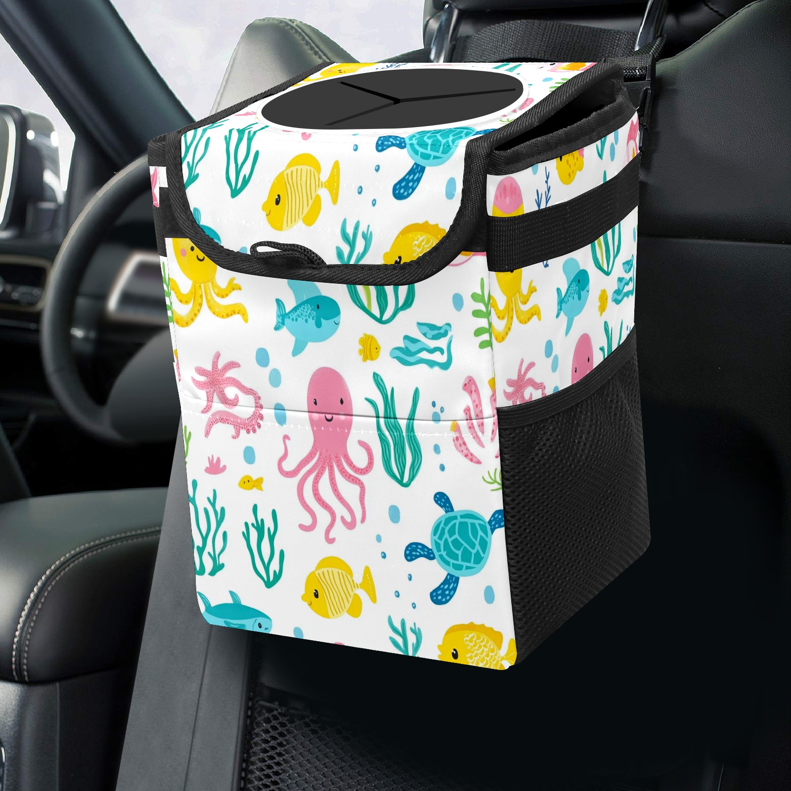 Car Trash Can with Lid, Small Portable Hanging Automotive Garbage Bin for Vehicles, Leakproof Waste Bag Container for SUV Truck Van Interior Auto Travel Road Trips(Sea Elements)