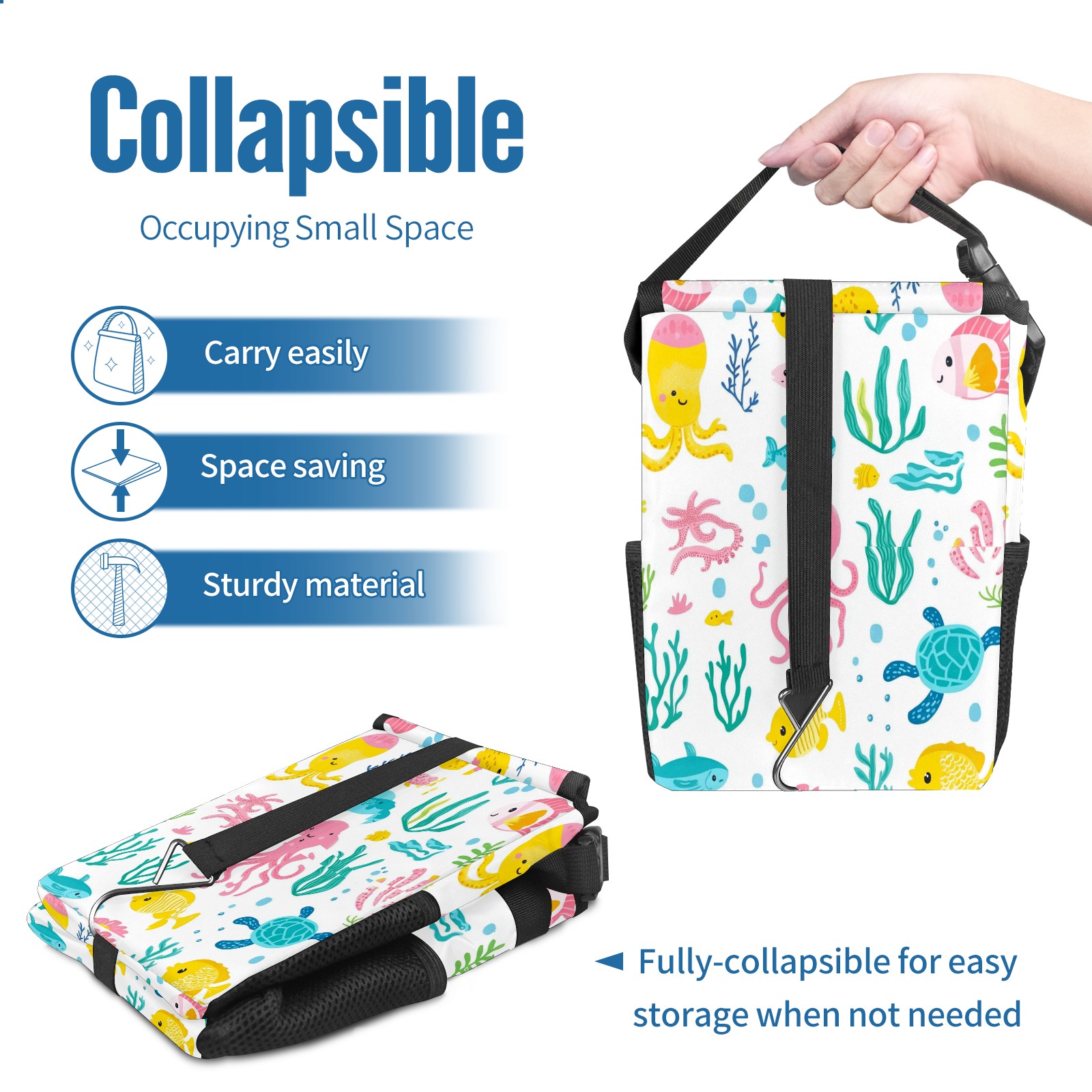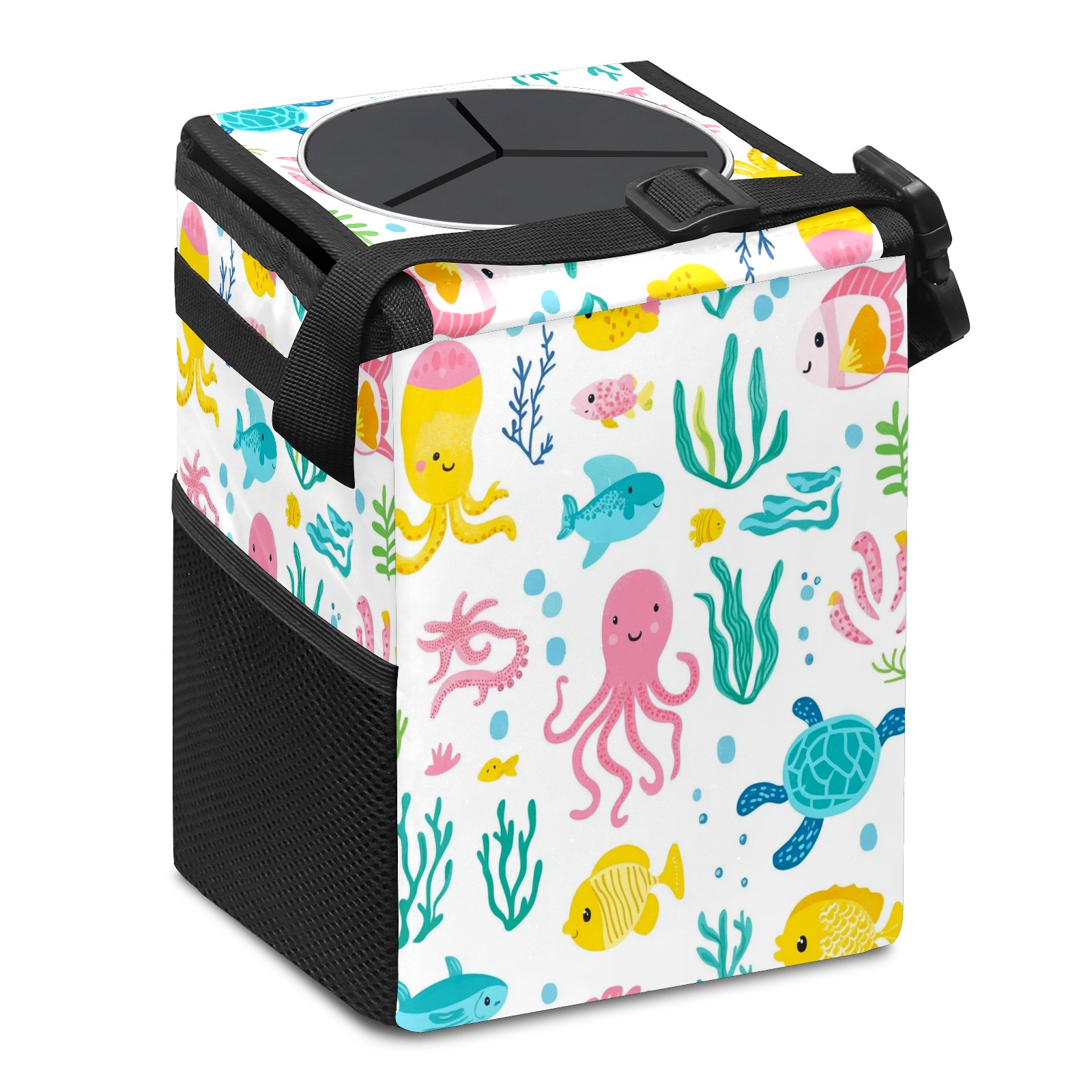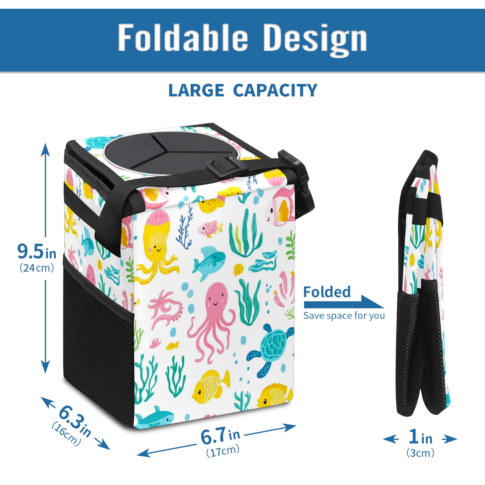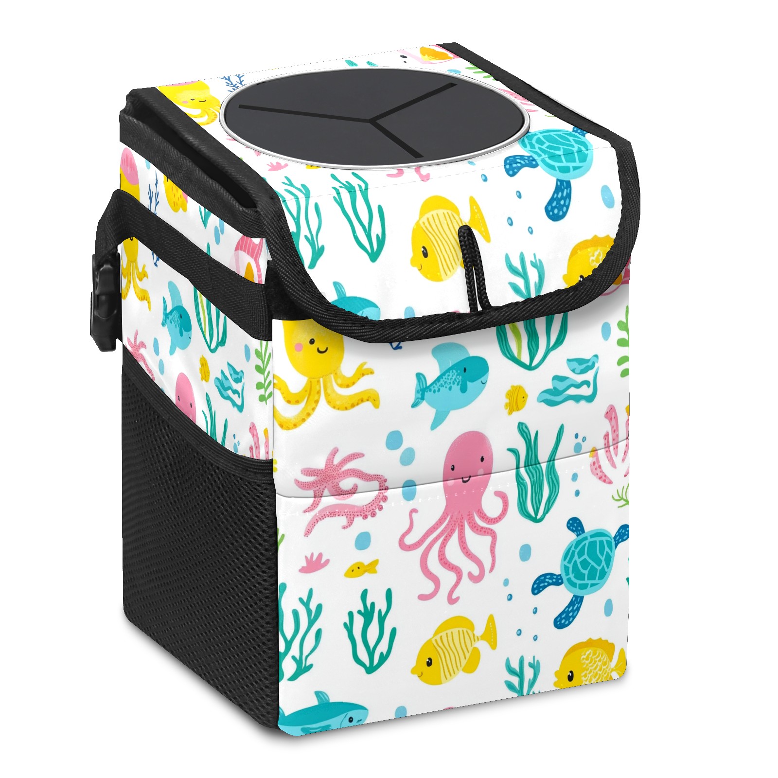 Car Trash Can with Lid, Small Portable Hanging Automotive Garbage Bin for Vehicles, Leakproof Waste Bag Container for SUV Truck Van Interior Auto Travel Road Trips(Sea Elements)
