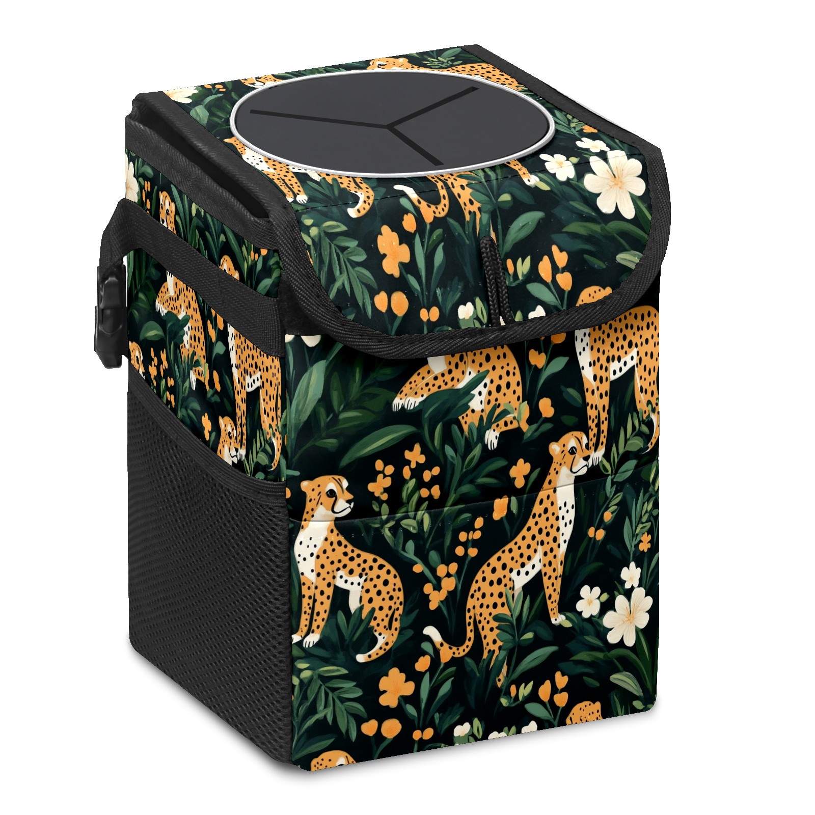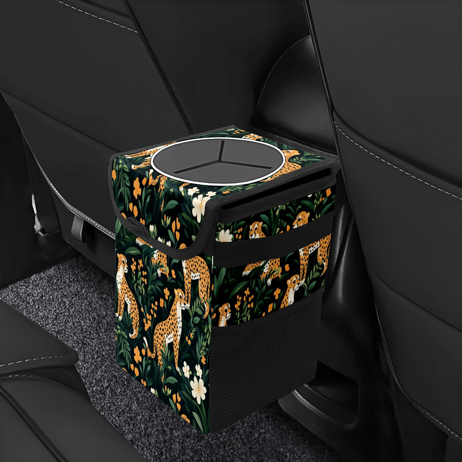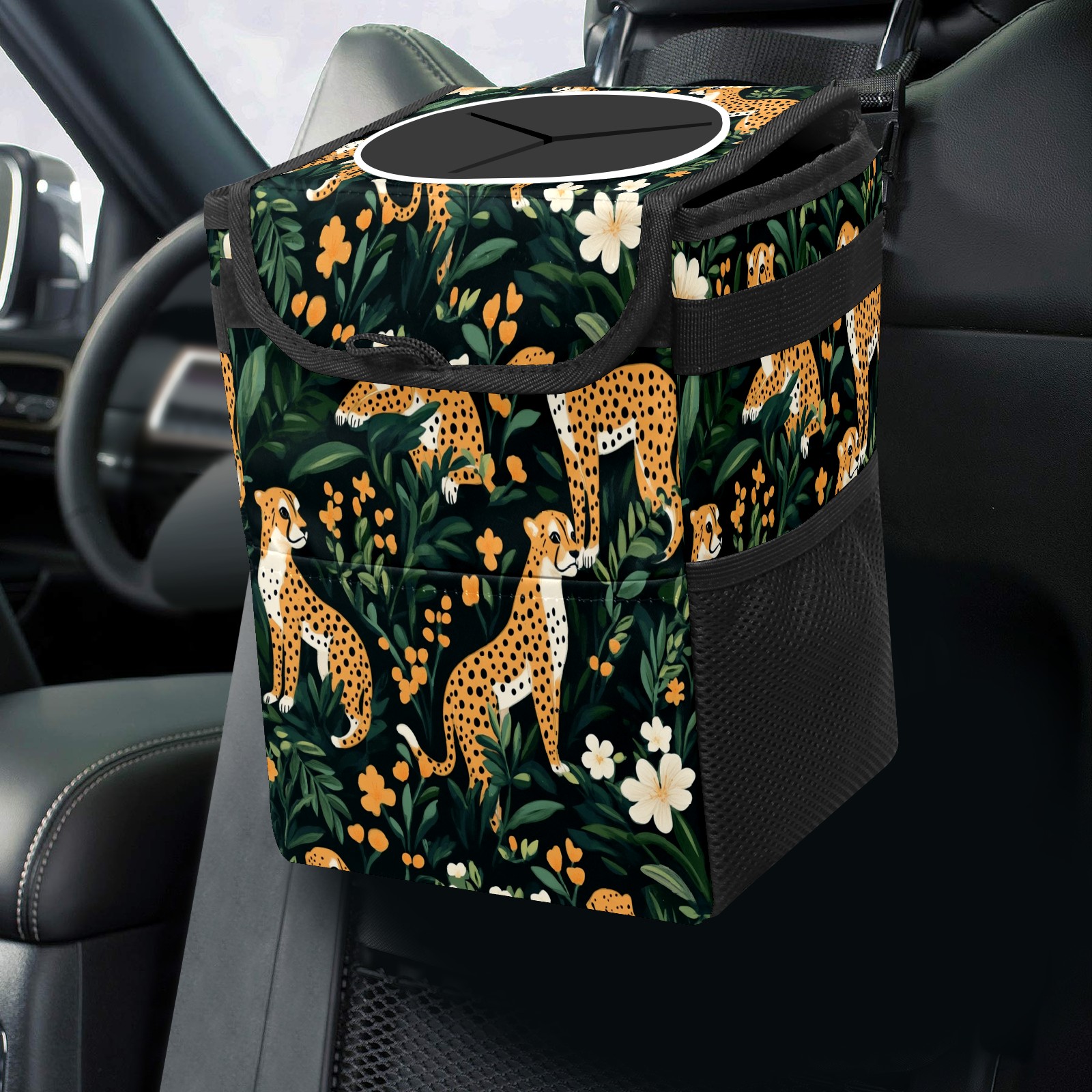 Car Trash Can with Lid, Small Portable Hanging Automotive Garbage Bin for Vehicles, Leakproof Waste Bag Container for SUV Truck Van Interior Auto Travel Road Trips(Cheetahs)