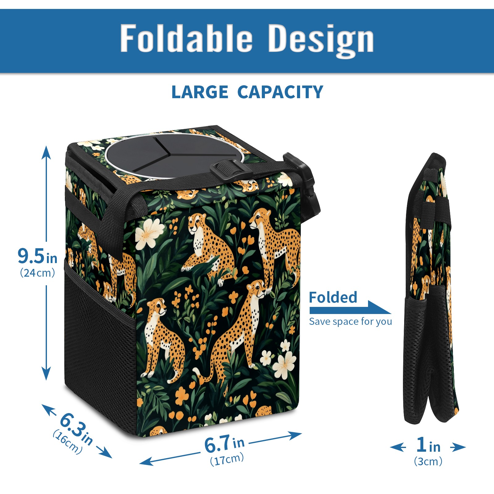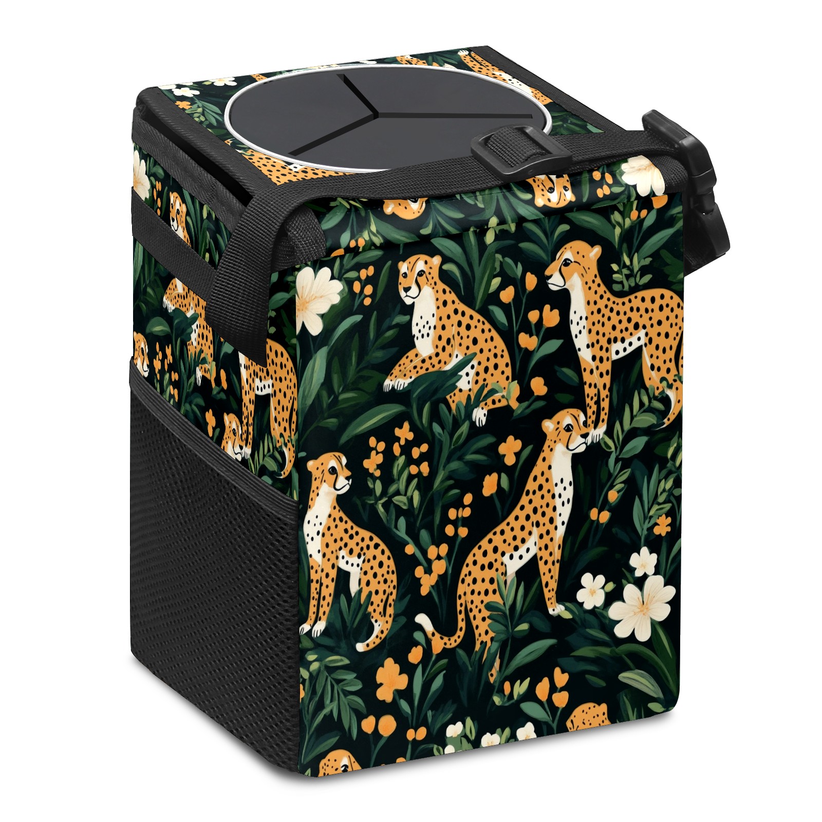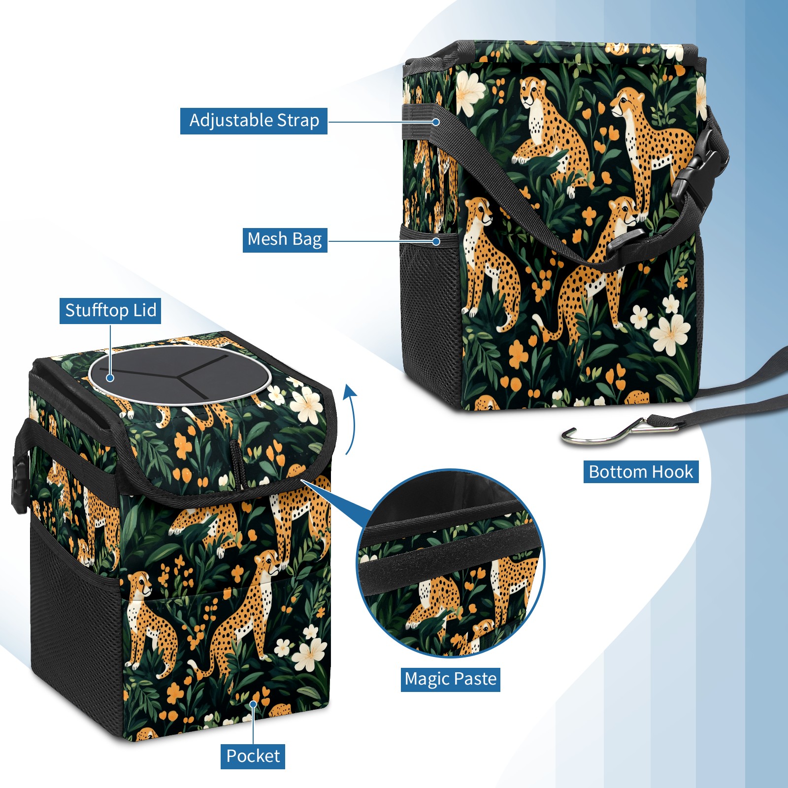 Car Trash Can with Lid, Small Portable Hanging Automotive Garbage Bin for Vehicles, Leakproof Waste Bag Container for SUV Truck Van Interior Auto Travel Road Trips(Cheetahs)
