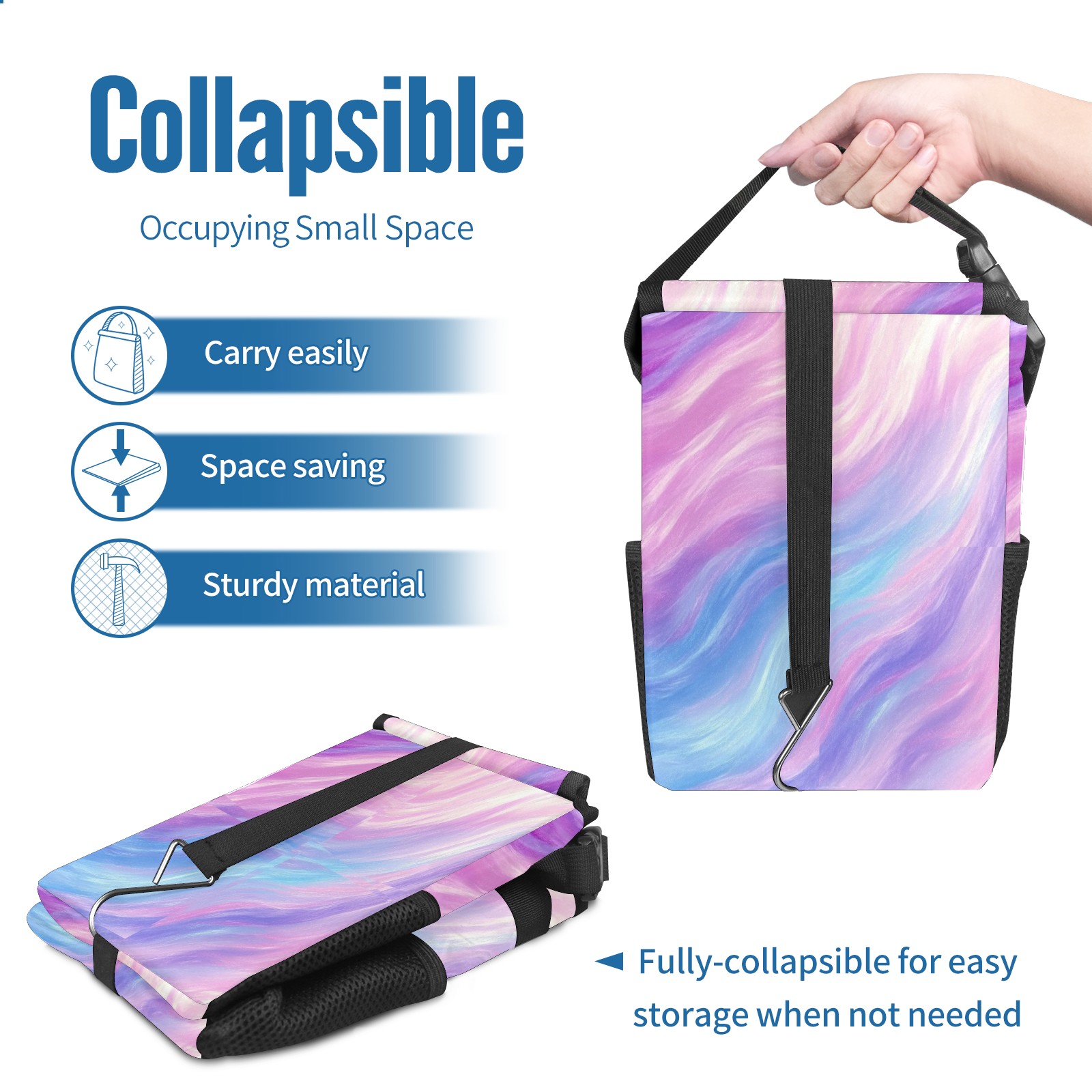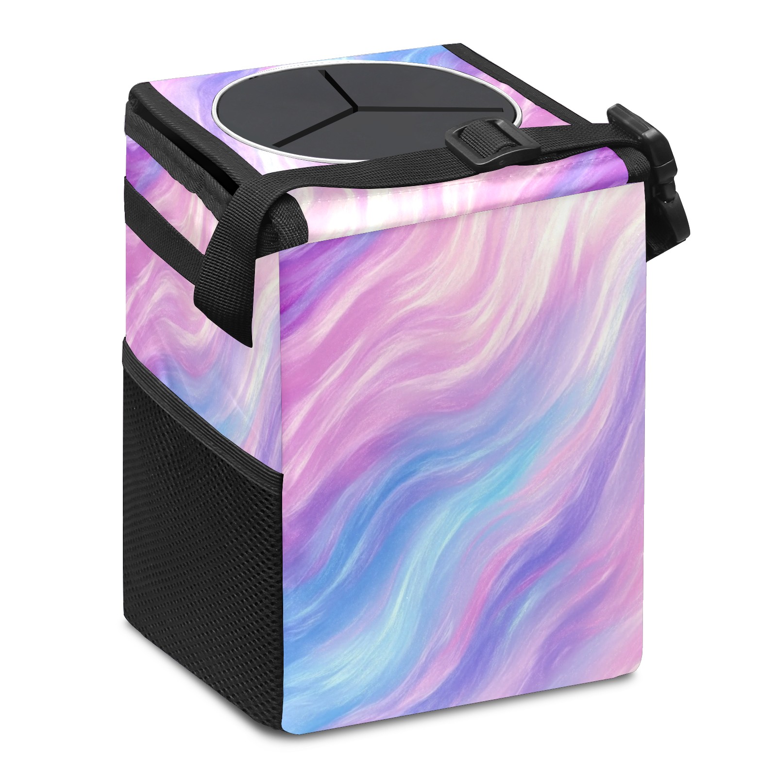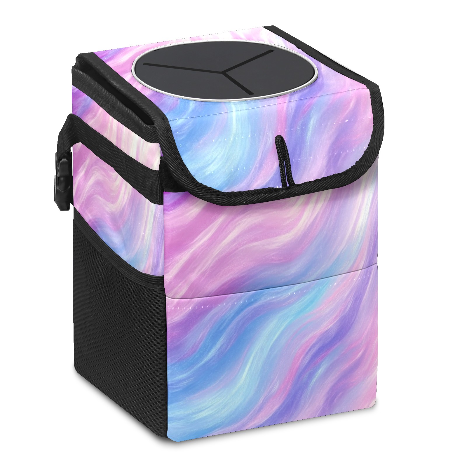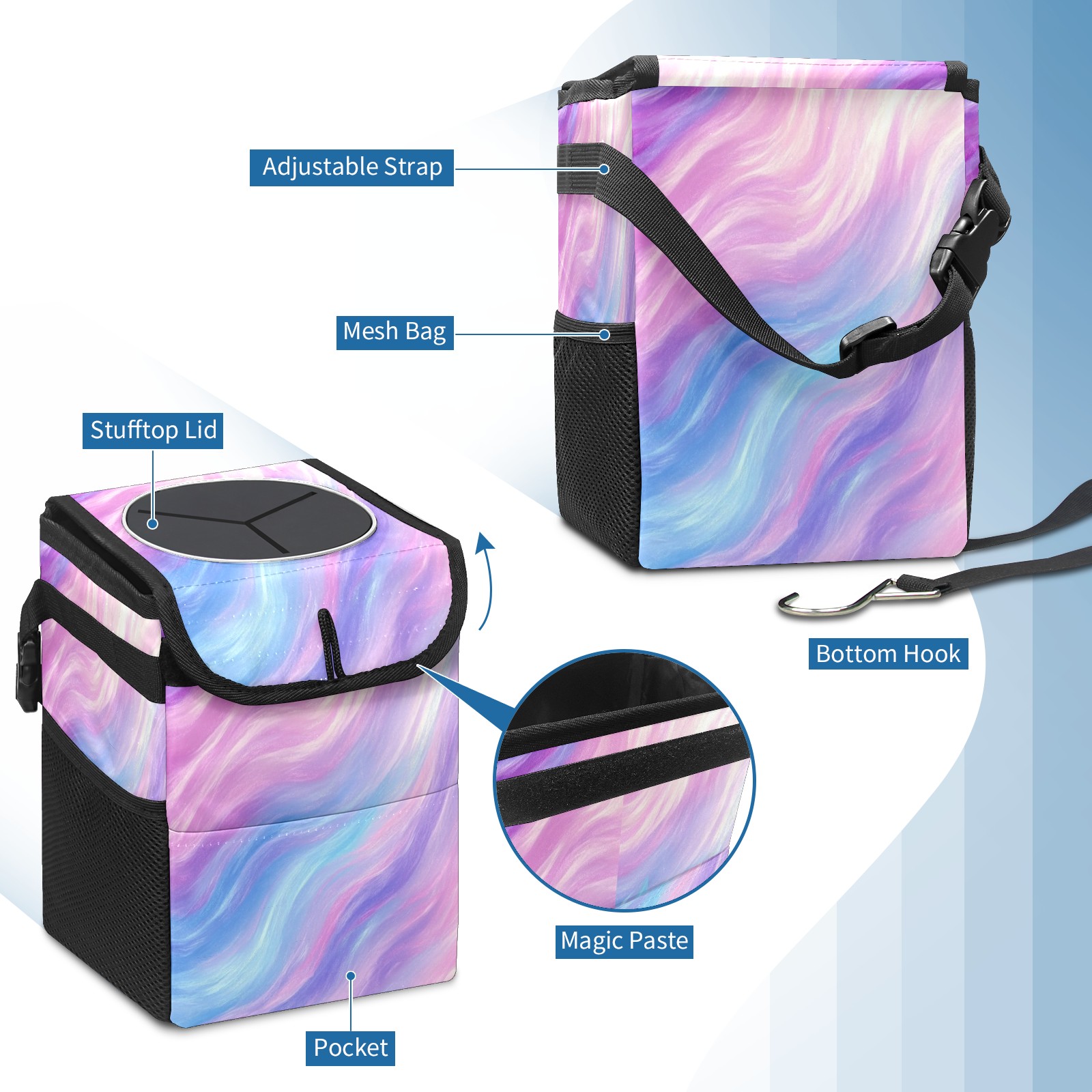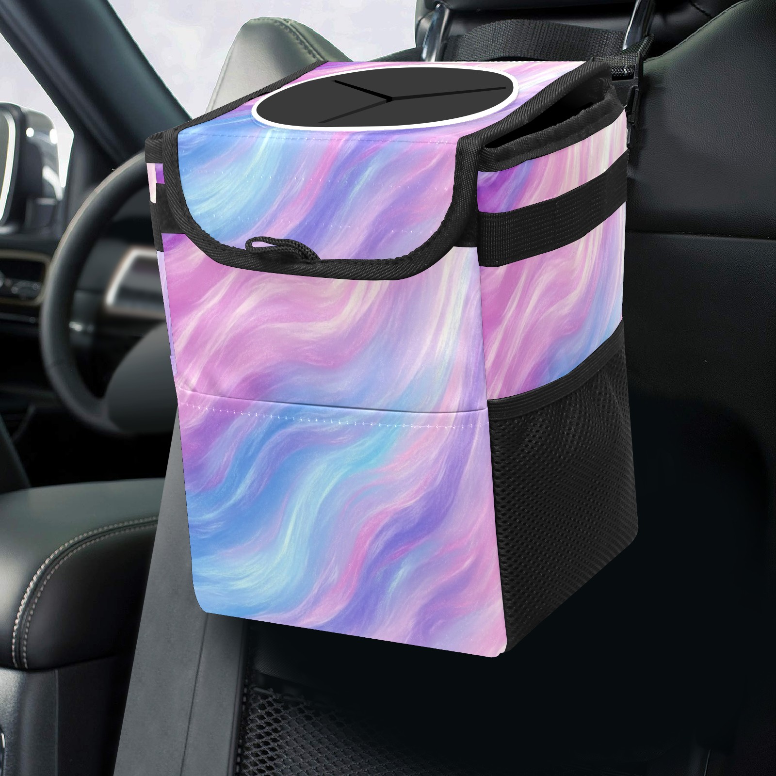 Car Trash Can with Lid, Small Portable Hanging Automotive Garbage Bin for Vehicles, Leakproof Waste Bag Container for SUV Truck Van Interior Auto Travel Road Trips(Soft Pastel Pattern)