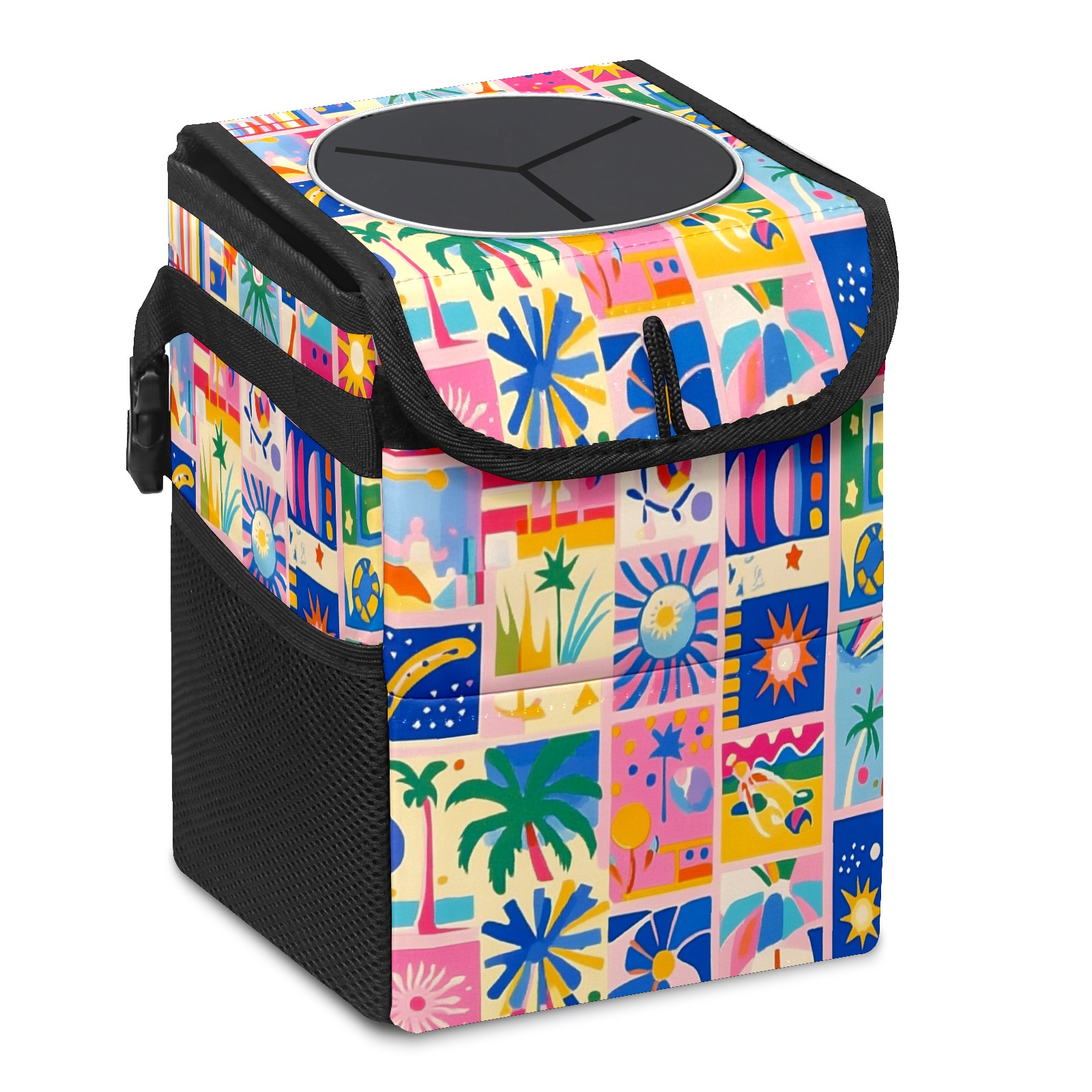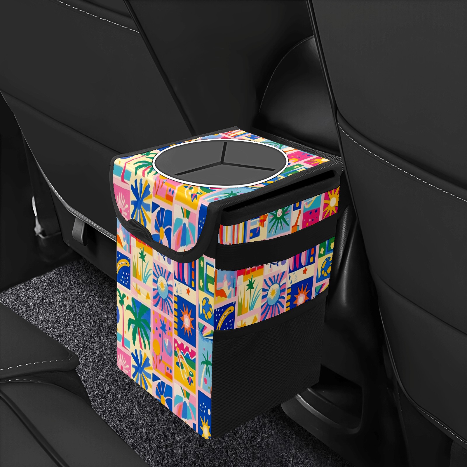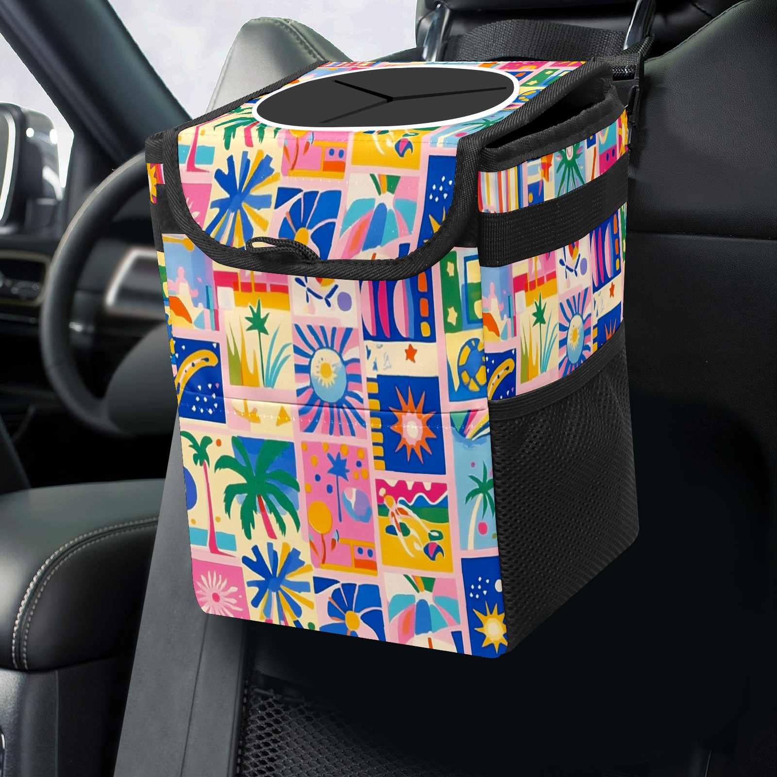 Car Trash Can with Lid, Small Portable Hanging Automotive Garbage Bin for Vehicles, Leakproof Waste Bag Container for SUV Truck Van Interior Auto Travel Road Trips(Vibrant Pattern)