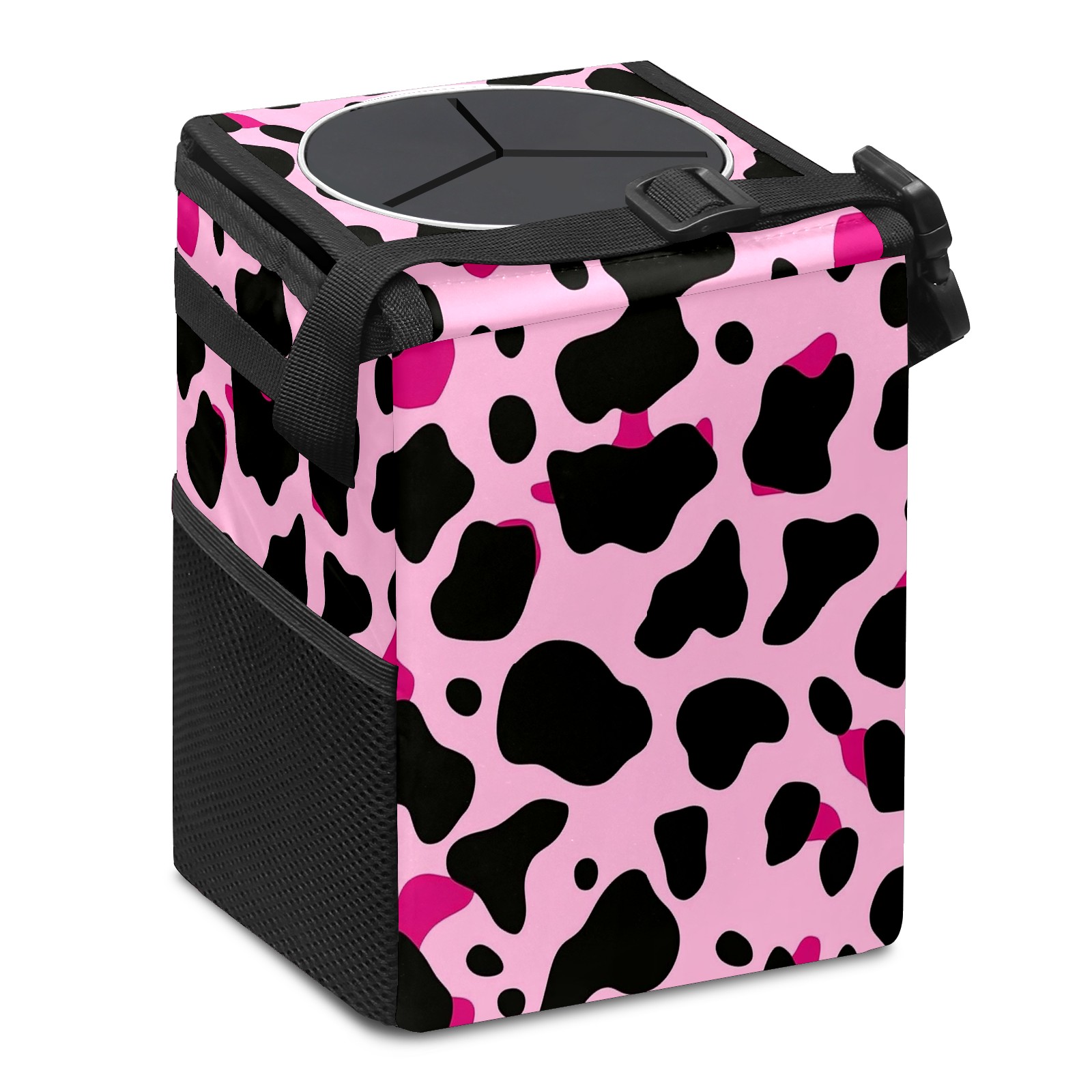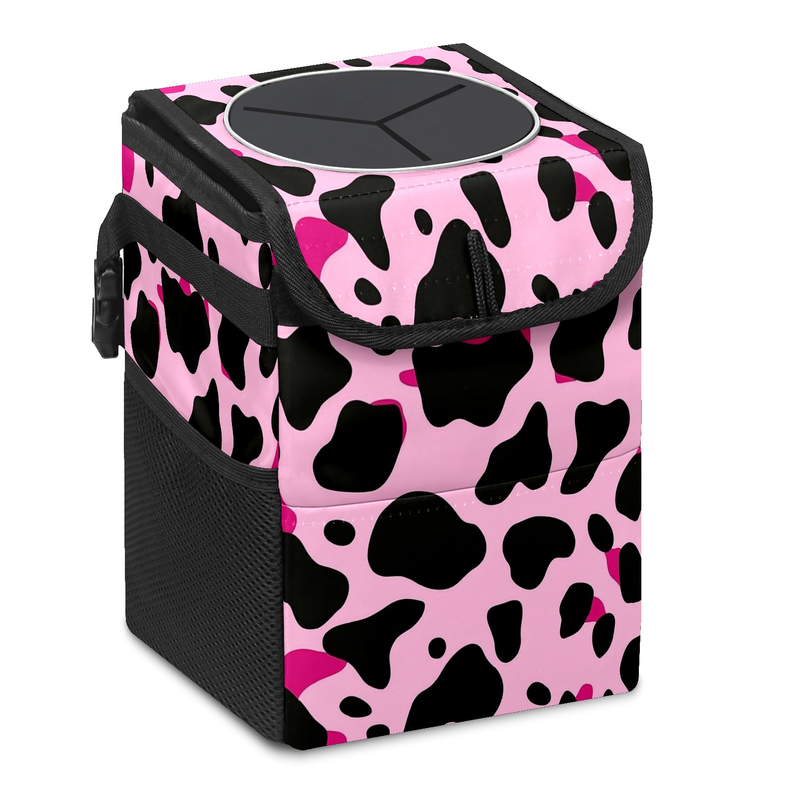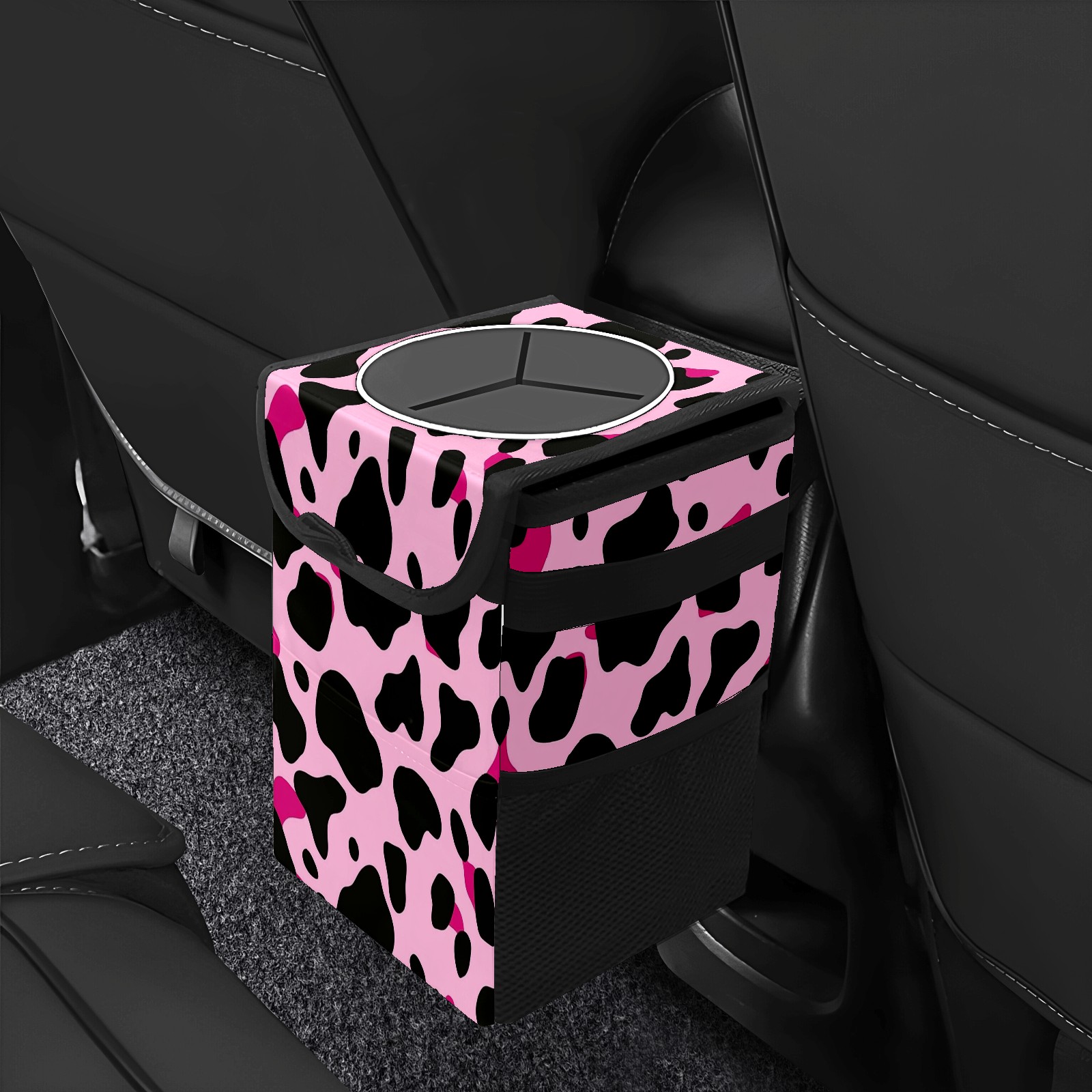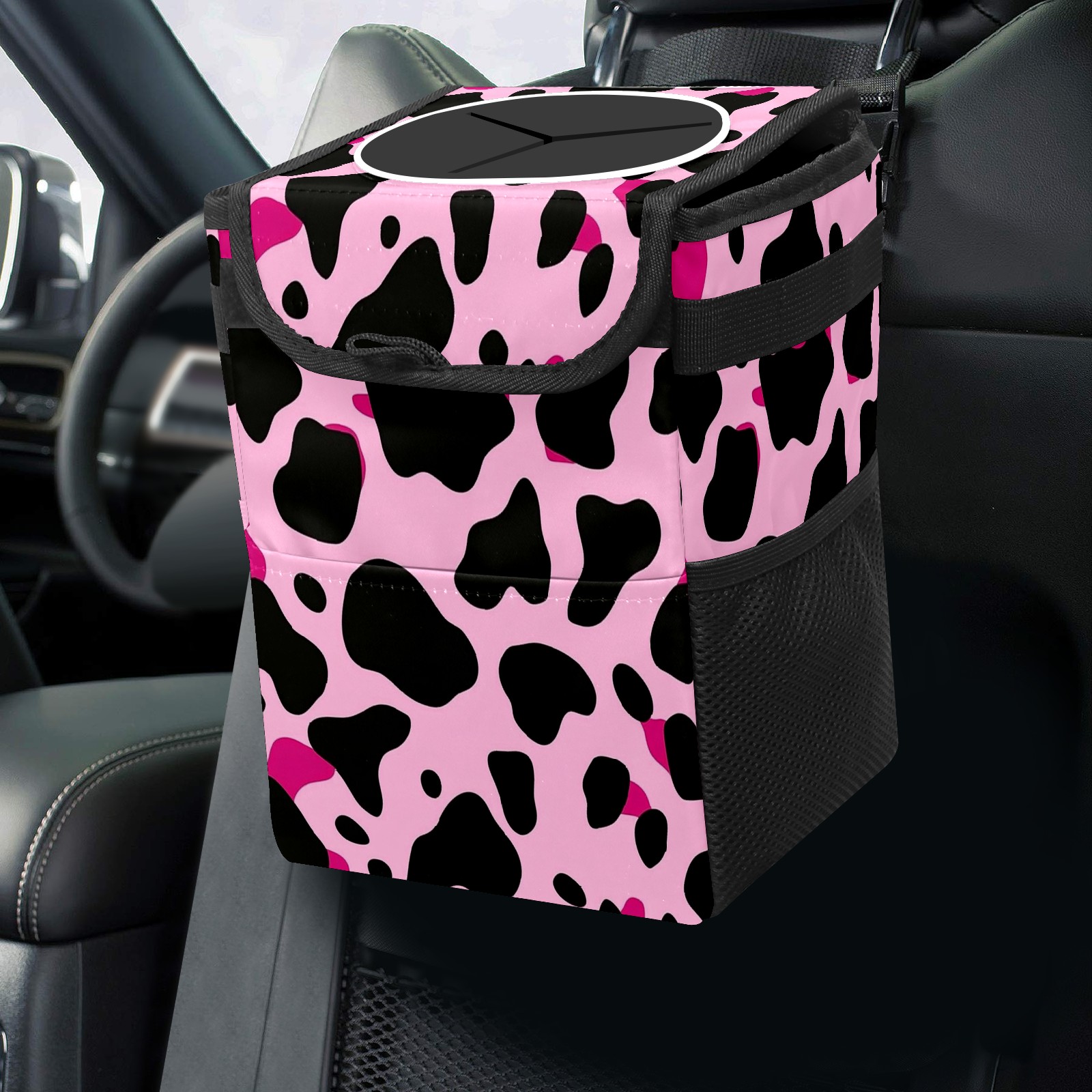 Car Trash Can with Lid, Small Portable Hanging Automotive Garbage Bin for Vehicles, Leakproof Waste Bag Container for SUV Truck Van Interior Auto Travel Road Trips(Pink And Black Cow Print Pattern)