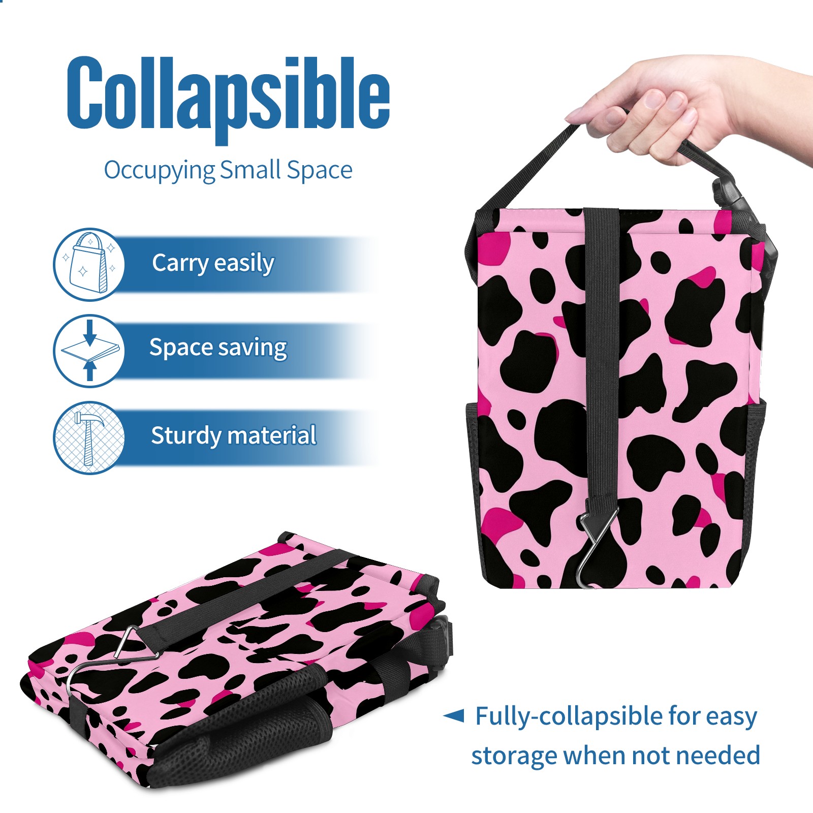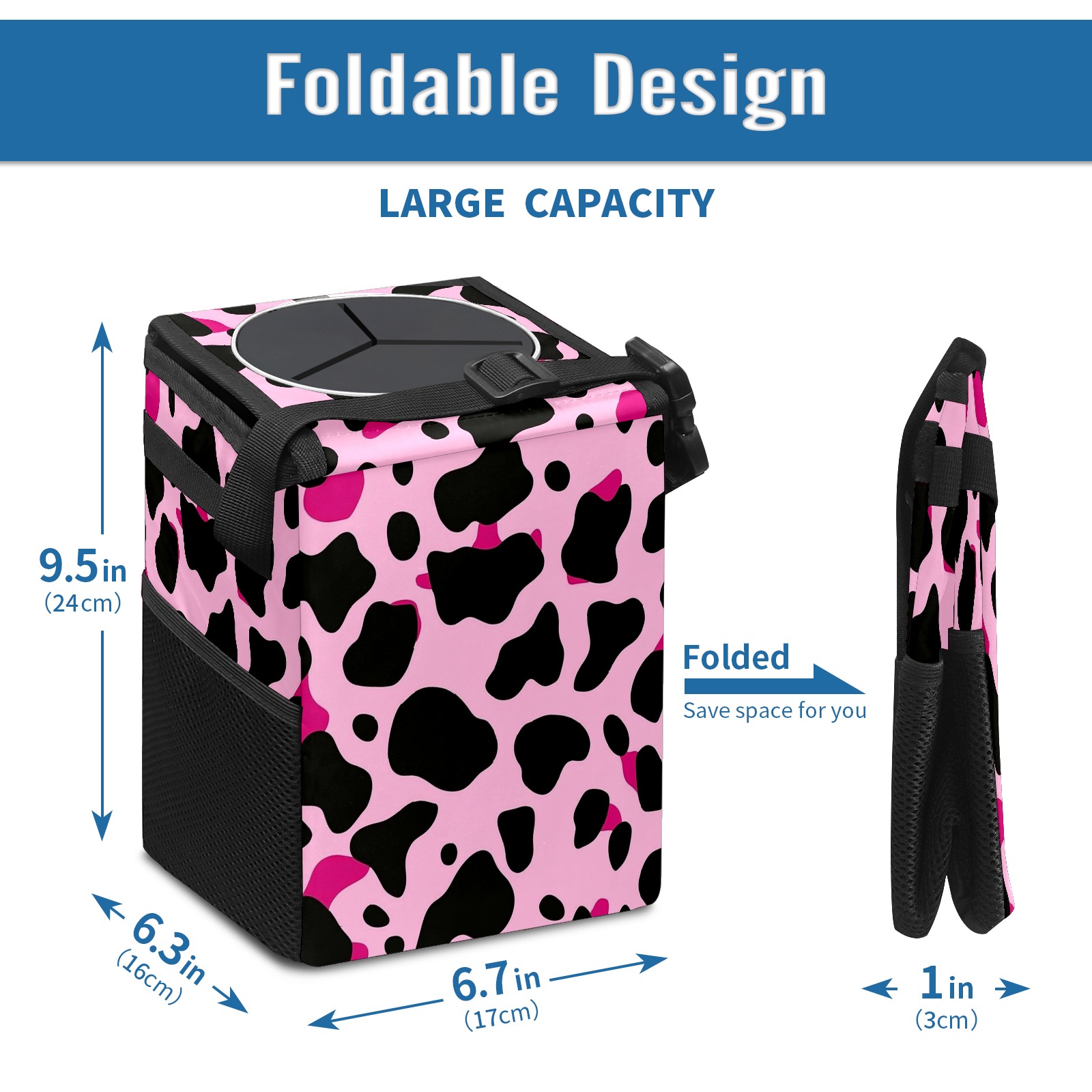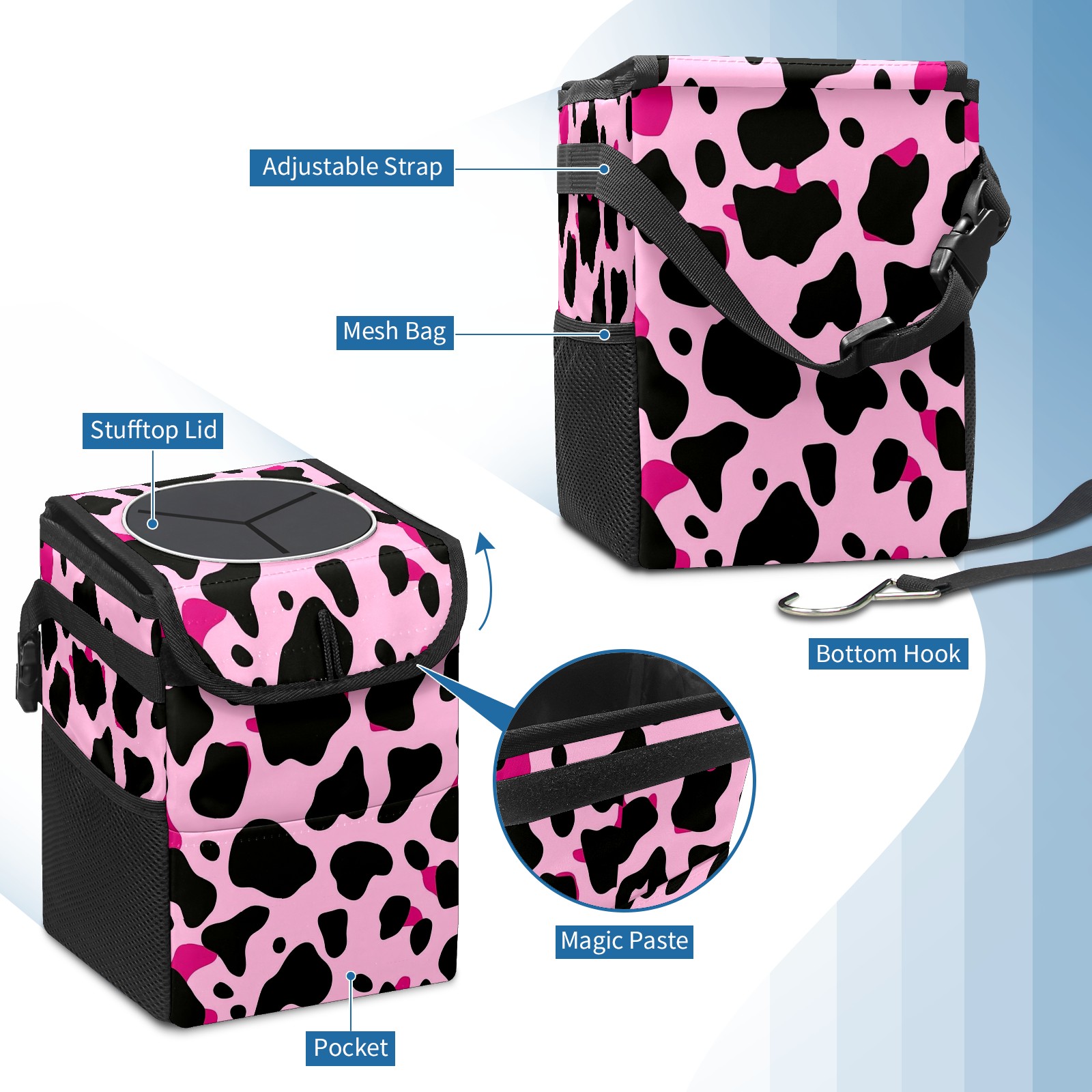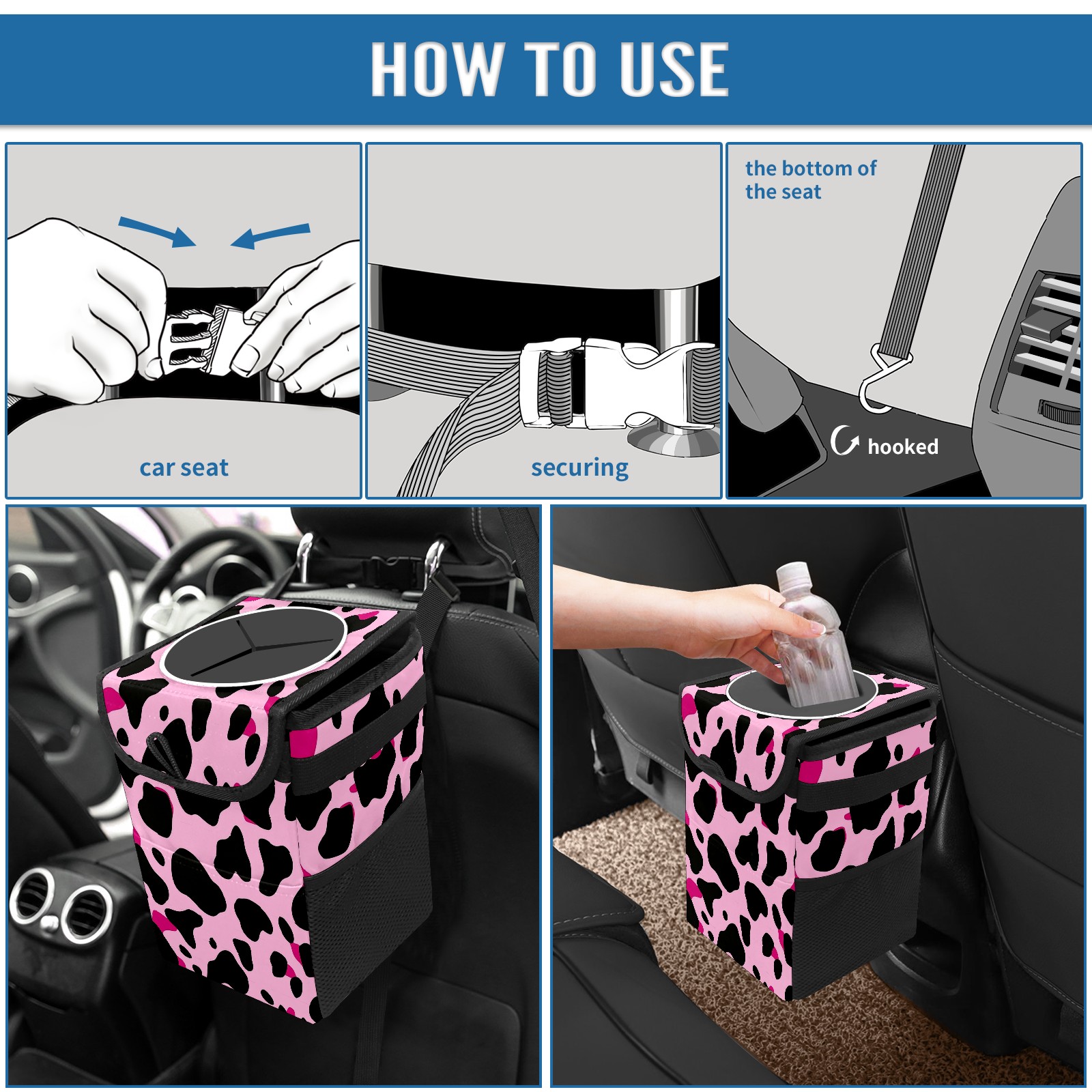 Car Trash Can with Lid, Small Portable Hanging Automotive Garbage Bin for Vehicles, Leakproof Waste Bag Container for SUV Truck Van Interior Auto Travel Road Trips(Pink And Black Cow Print Pattern)