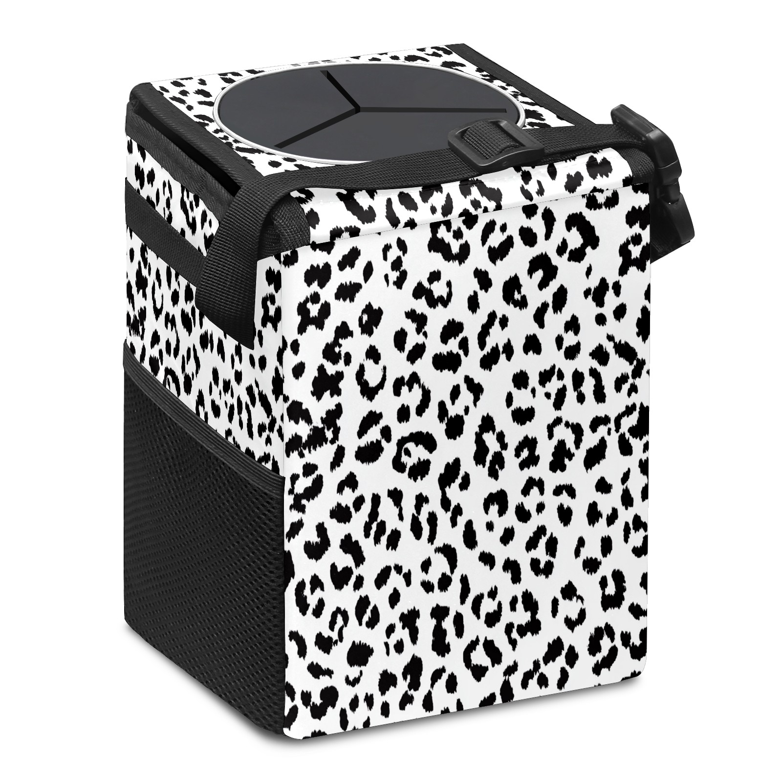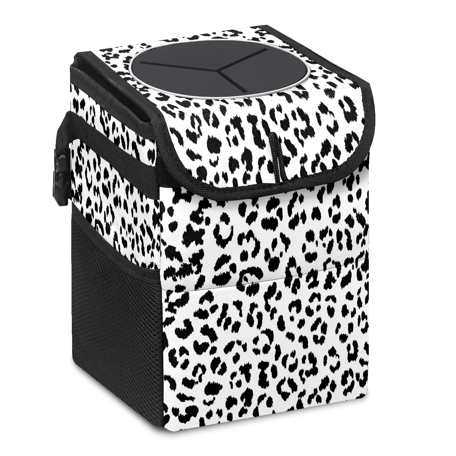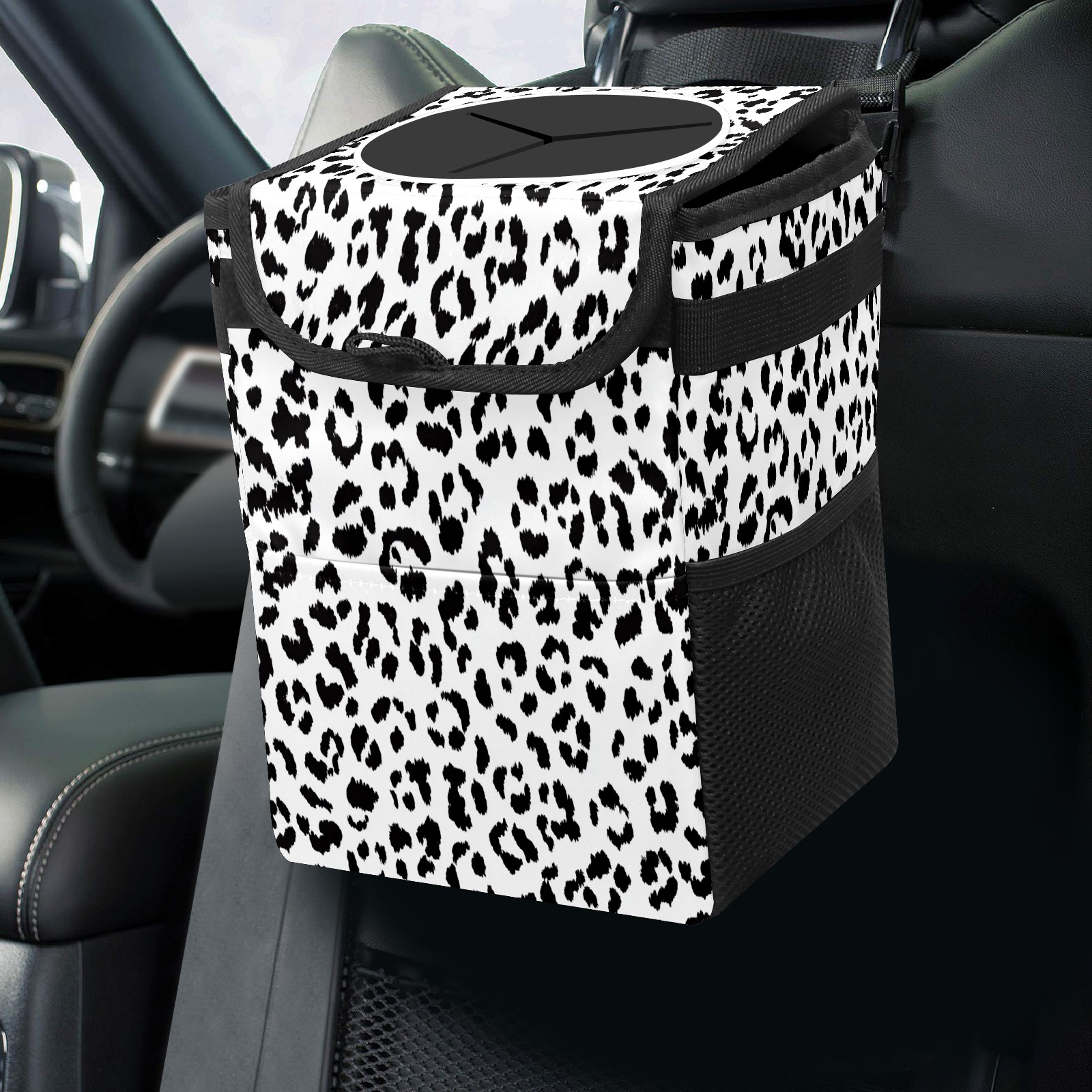 Car Trash Can with Lid, Small Portable Hanging Automotive Garbage Bin for Vehicles, Leakproof Waste Bag Container for SUV Truck Van Interior Auto Travel Road Trips(Leopard Print Pattern)