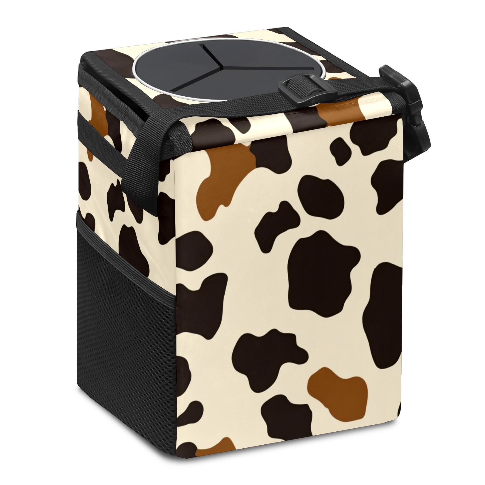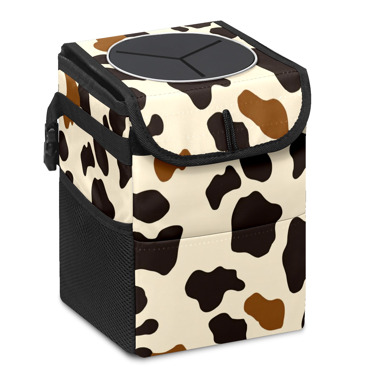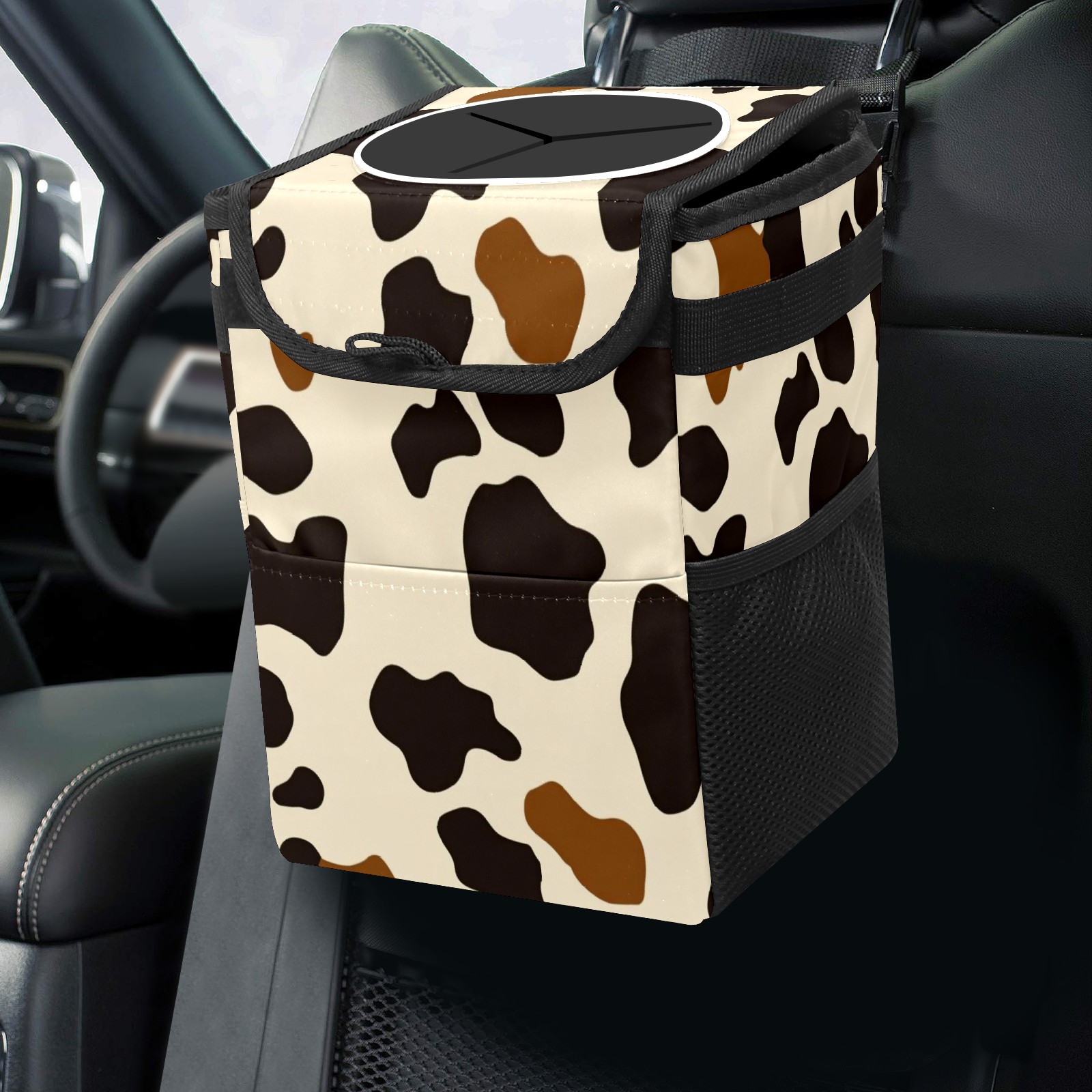 Car Trash Can with Lid, Small Portable Hanging Automotive Garbage Bin for Vehicles, Leakproof Waste Bag Container for SUV Truck Van Interior Auto Travel Road Trips(Cow Print Pattern)
